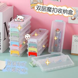 | Caja de almacenamiento de escritorio de plástico transparente de doble capa para cosméticos, almacenamiento de brochas de maquillaje, DIY, caja de papelería para estudiantes, estuche para lápices |