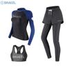 Women's blue and black round neck top + letter black vest + black fake two-piece trousers three-piece set