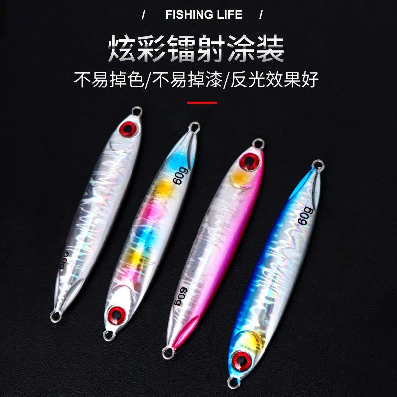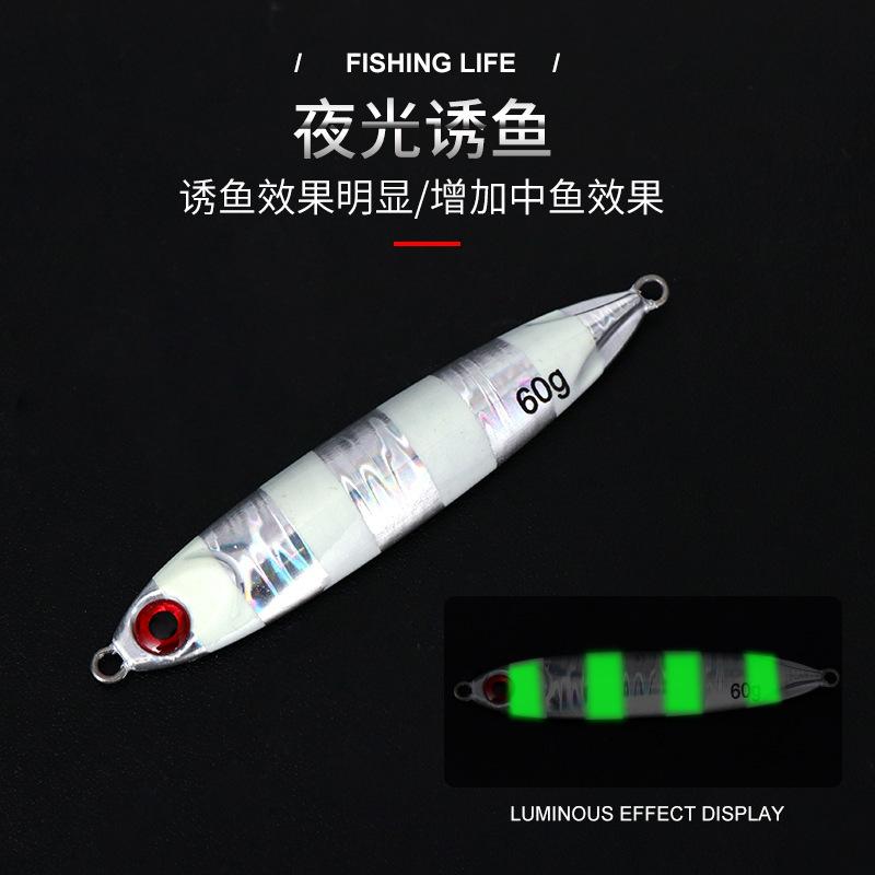 60g:Montaje de anzuelos: Anzuelo doble 15# con placa frontal de hierro blanco + Anzuelo triple con pluma y ranura sanguínea trasero 6# Anillas partidas: Anillas dobles aplanadas 0.7*6mm