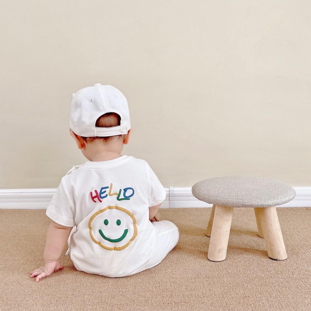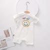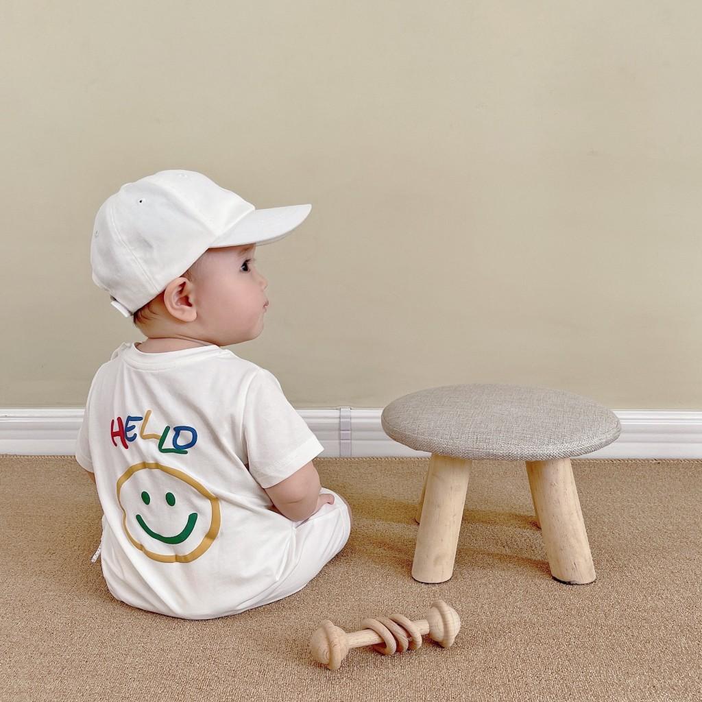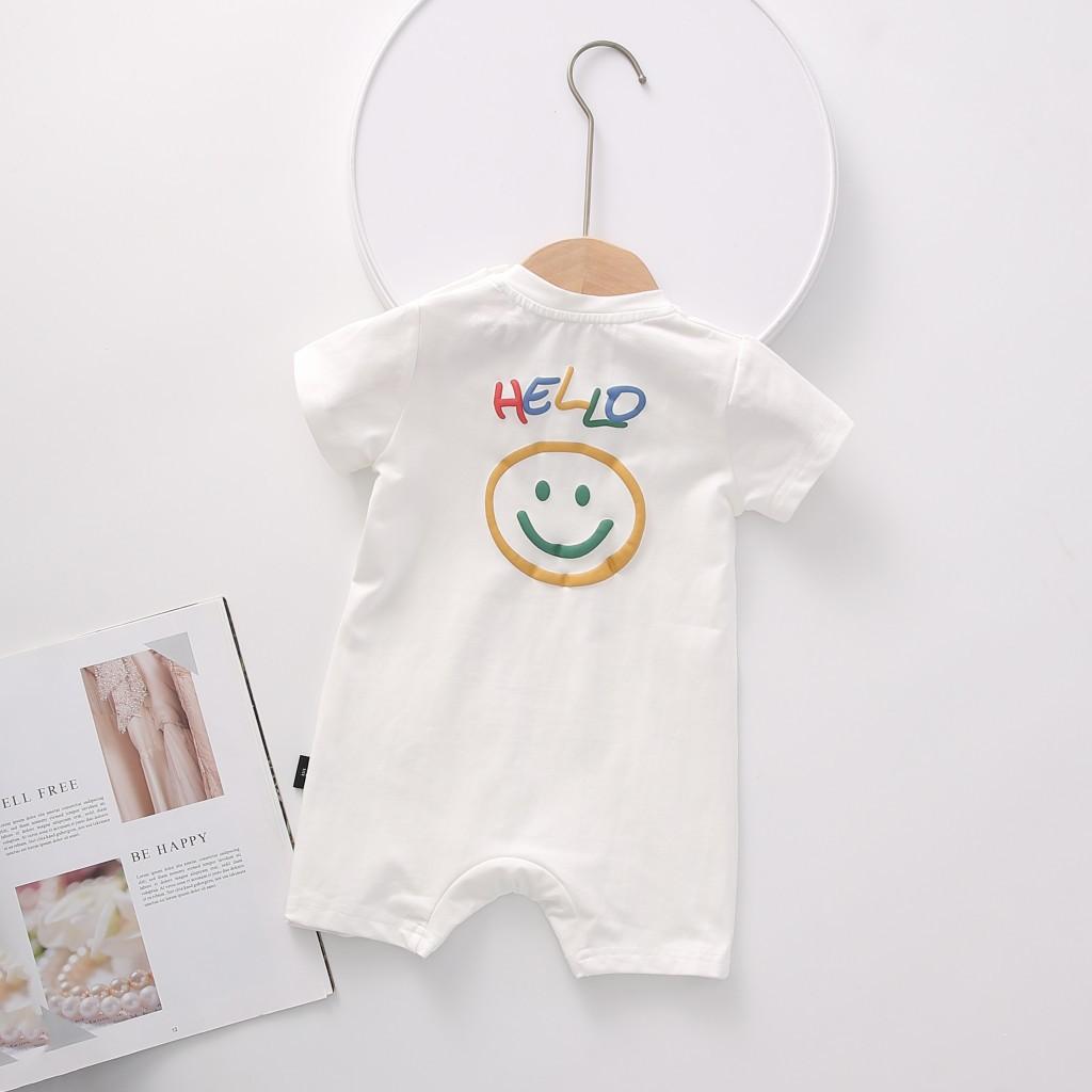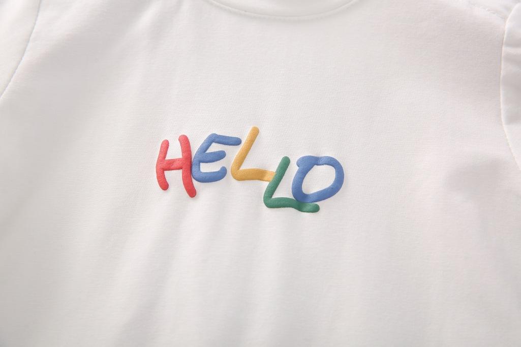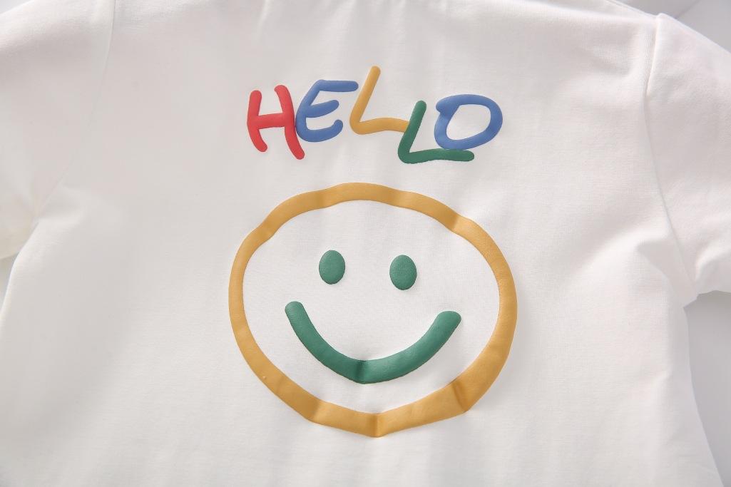 Un mono blanco con letras de "hola" de colores. Y la carita sonriente en la parte de atrás. Toda la impresión es una flor de burbuja. La sensación visual y táctil es ese tipo de sensación convexa.