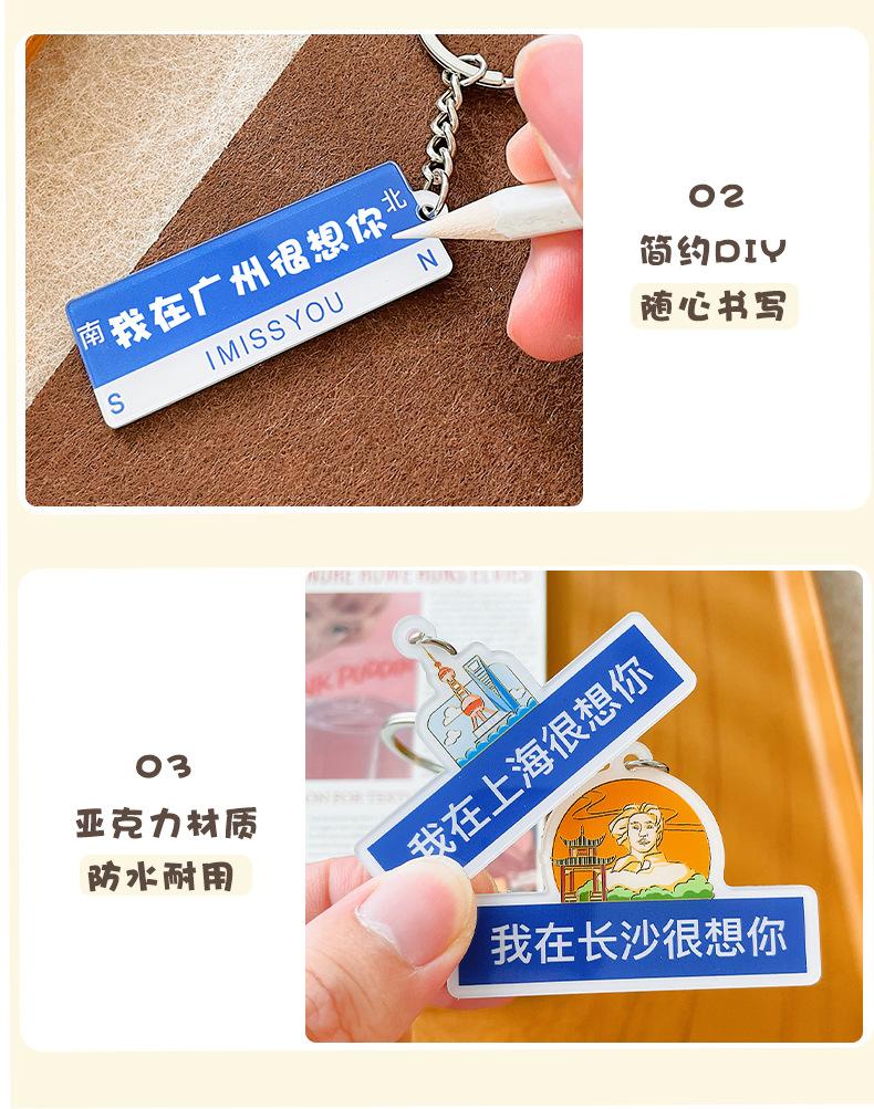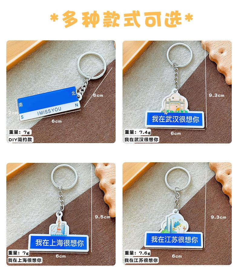 Red creativa llavero de acrílico con nombre de ciudad letrero de calle texto donde te extraño colgante para bolso