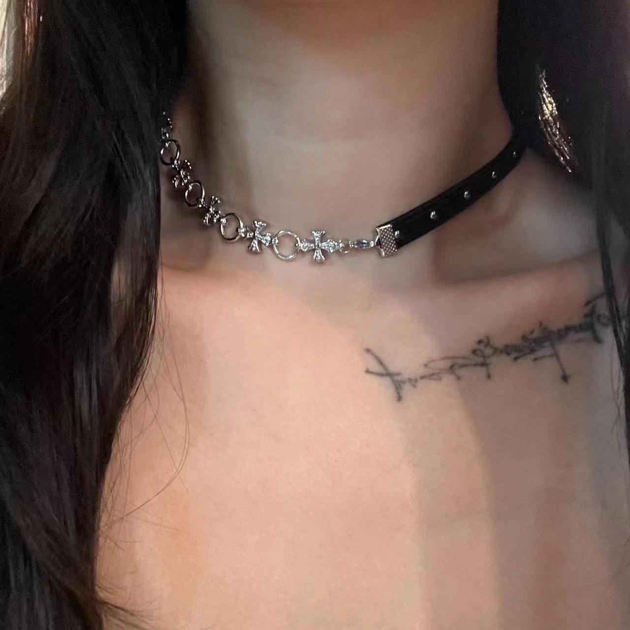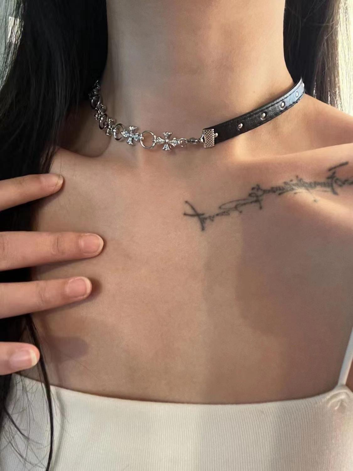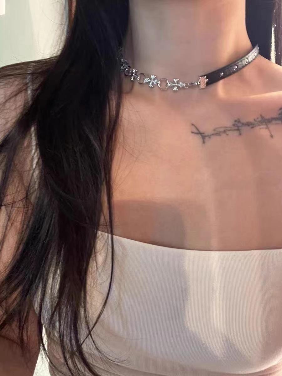 Collar de Cuero PU con Empalme de Flores Cruzadas Asimétricas de Estilo Frío Cadena Corta para el Cuello Cadena para la Clavícula Joyería de Estilo Dulce y Cool 2024