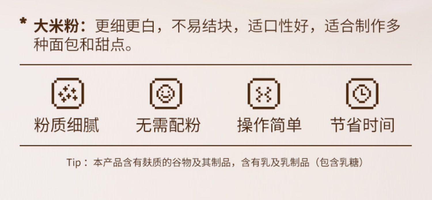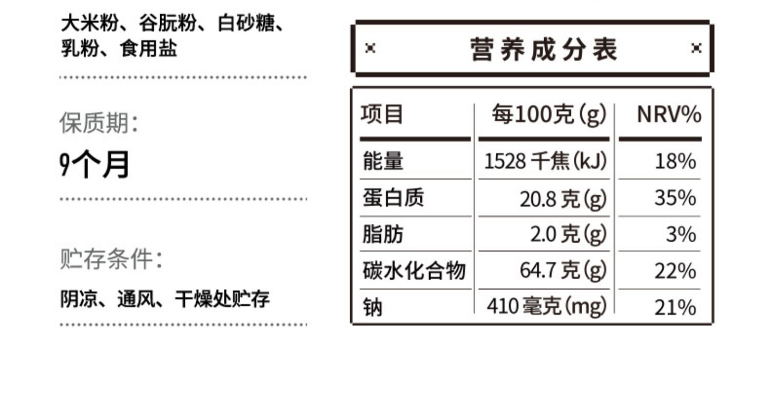 Rice flour, gluten, white sugar, milk powder, edible salt