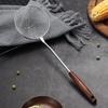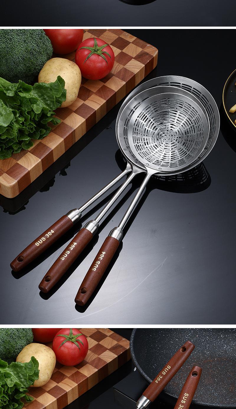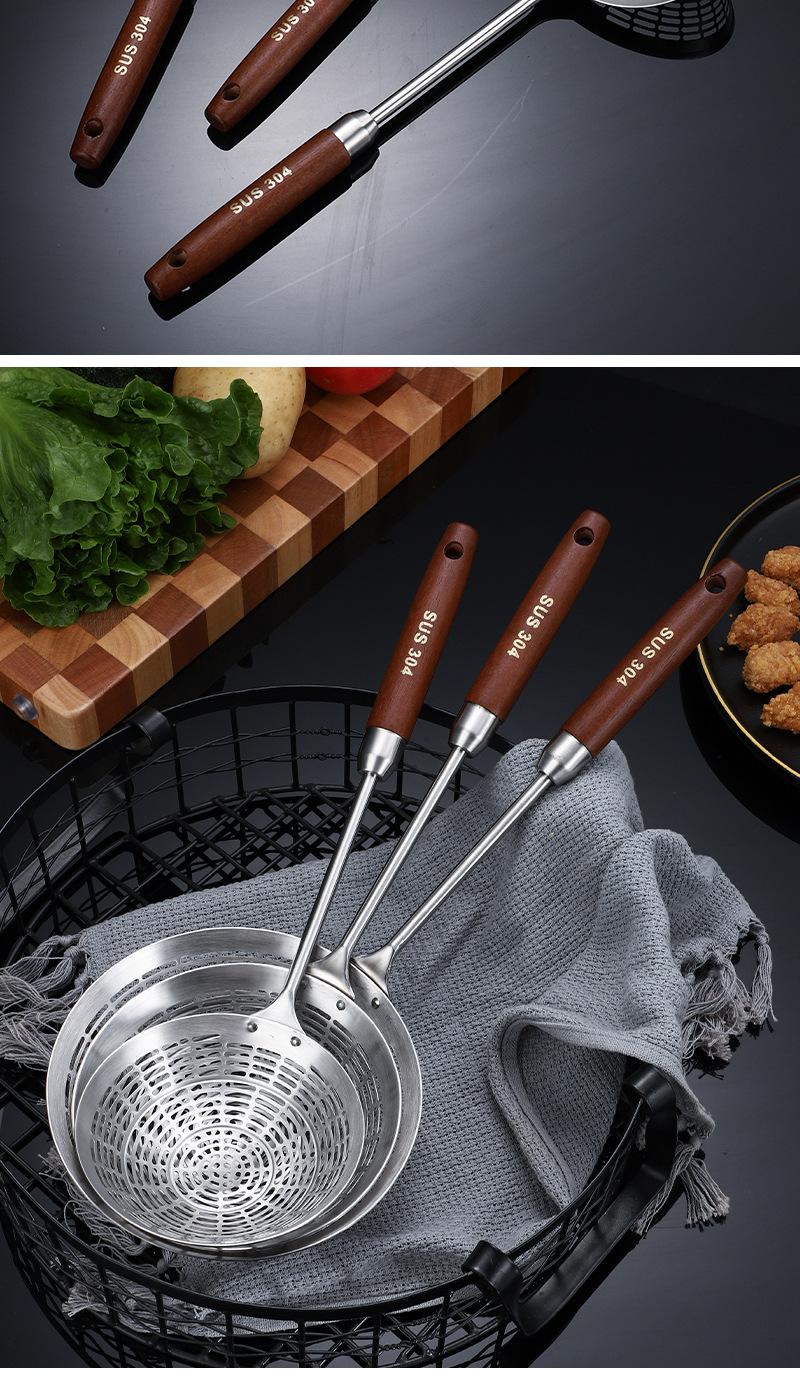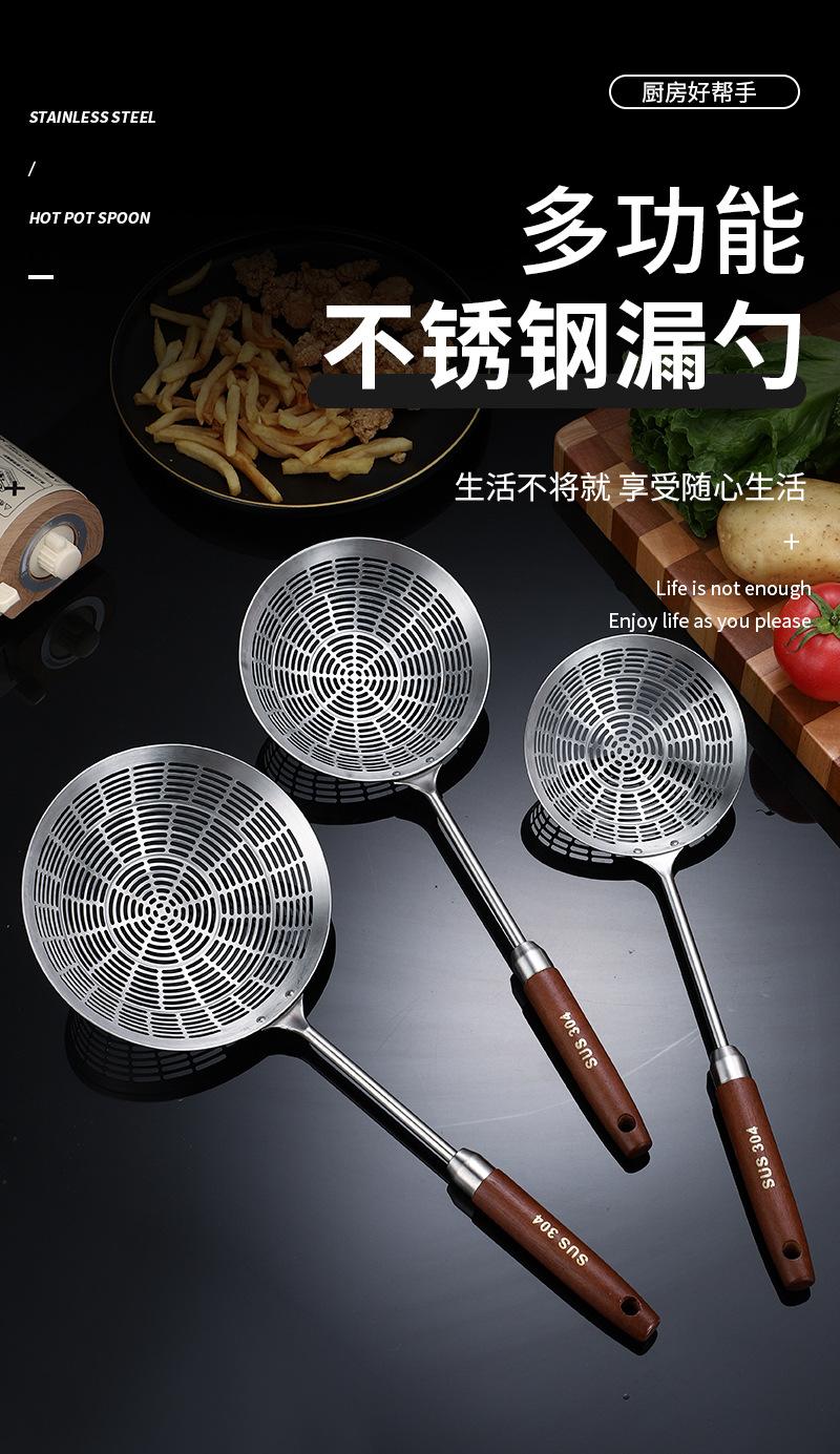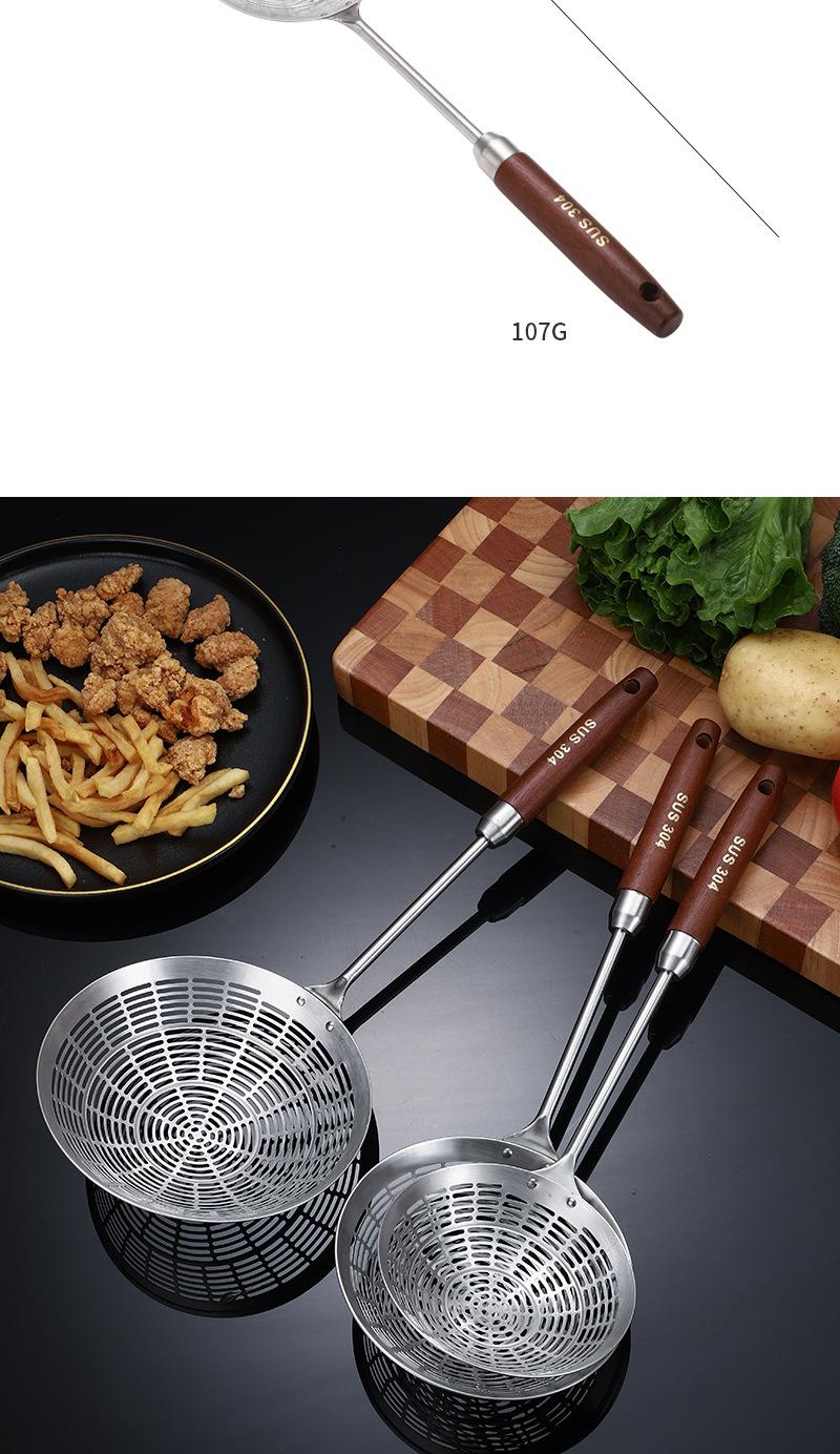 Cuchara de fideos fritos de acero inoxidable 304 para cocina doméstica, mango de madera engrosado, colador grande anti-escaldaduras, venta al por mayor