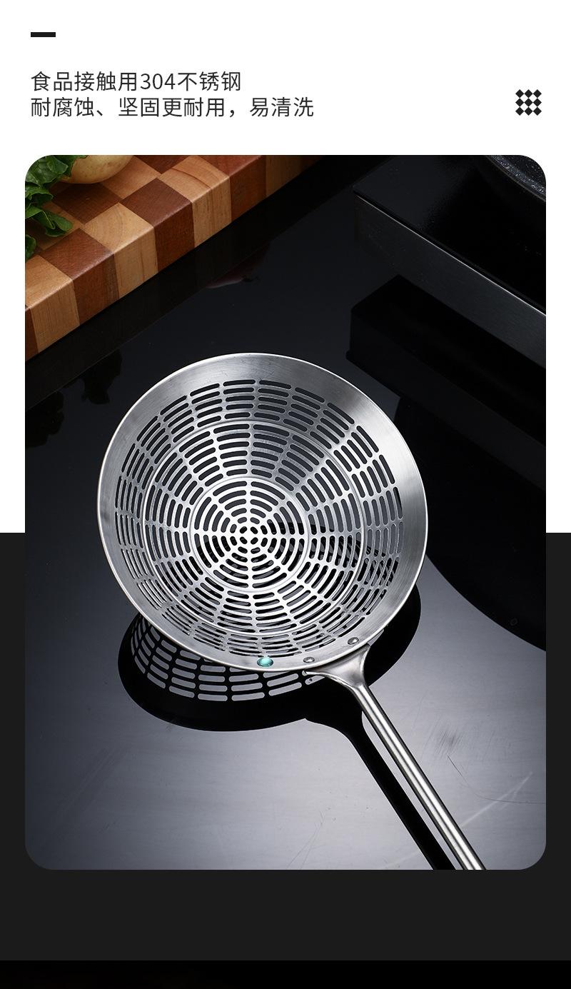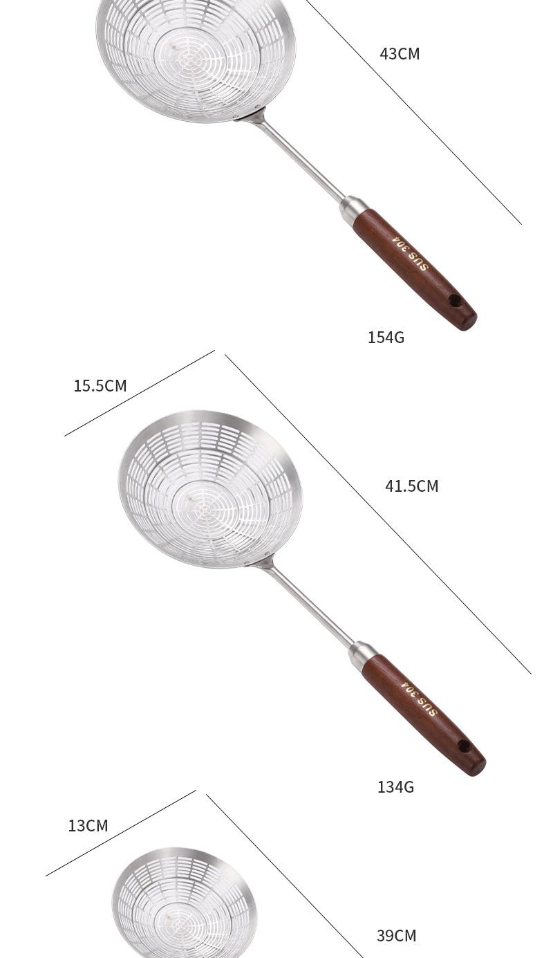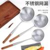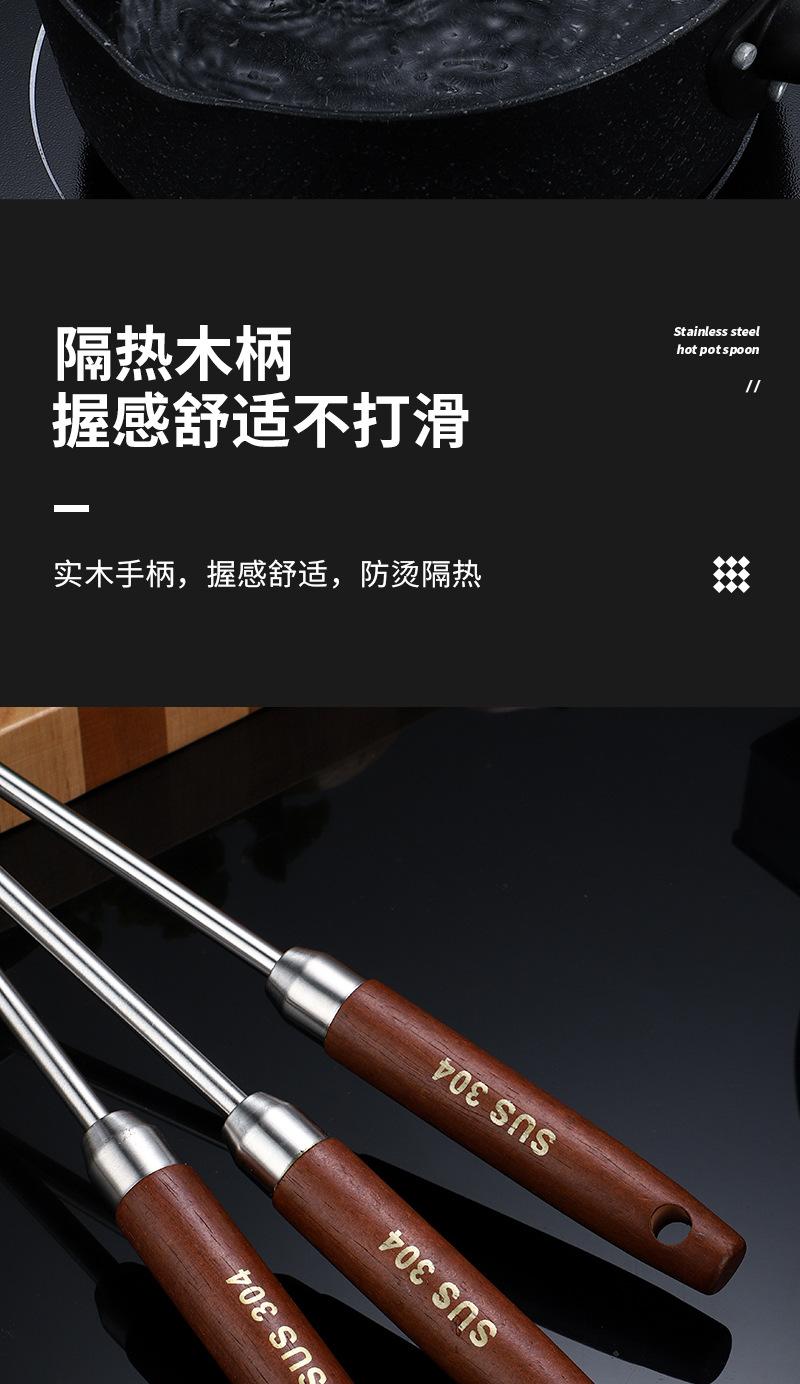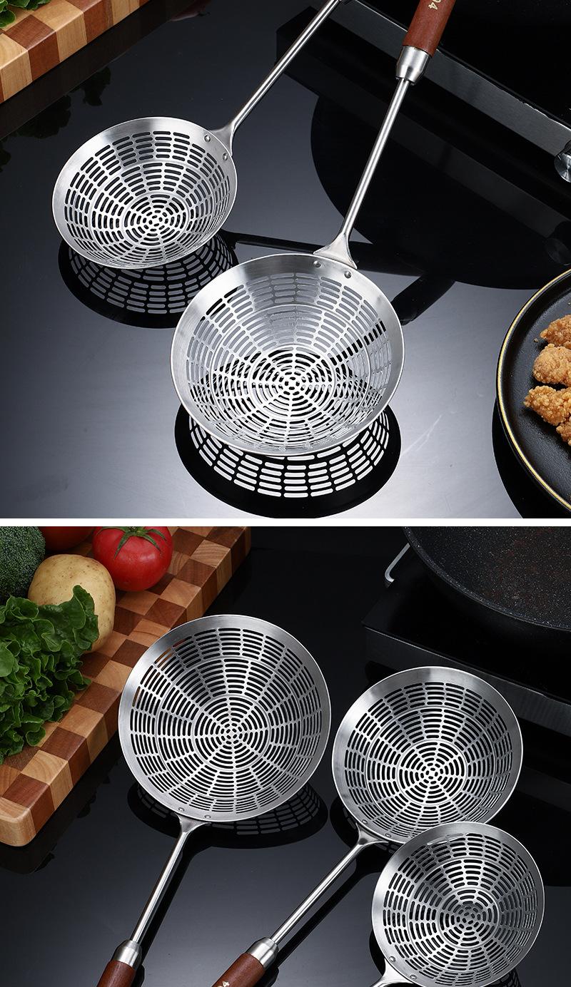 Cuchara de fideos fritos de acero inoxidable 304 para cocina doméstica, mango de madera engrosado, colador grande anti-escaldaduras, venta al por mayor