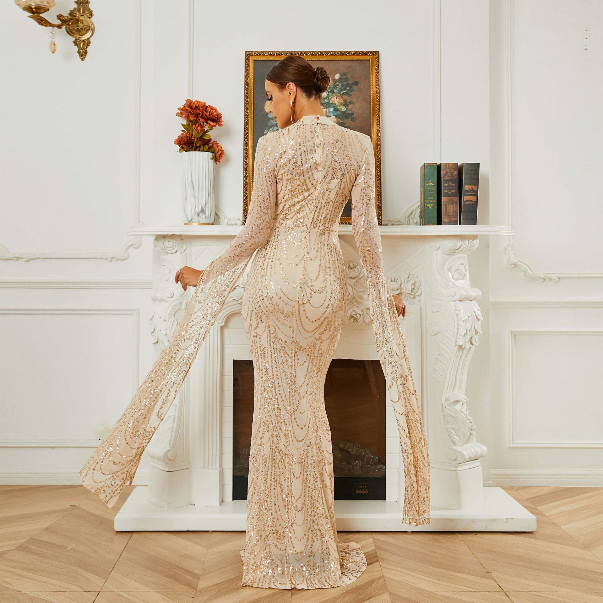 Vestido de noche elegante y sexy de alta gama con lentejuelas, manga larga, cuello redondo, para banquete, dama de honor