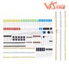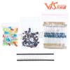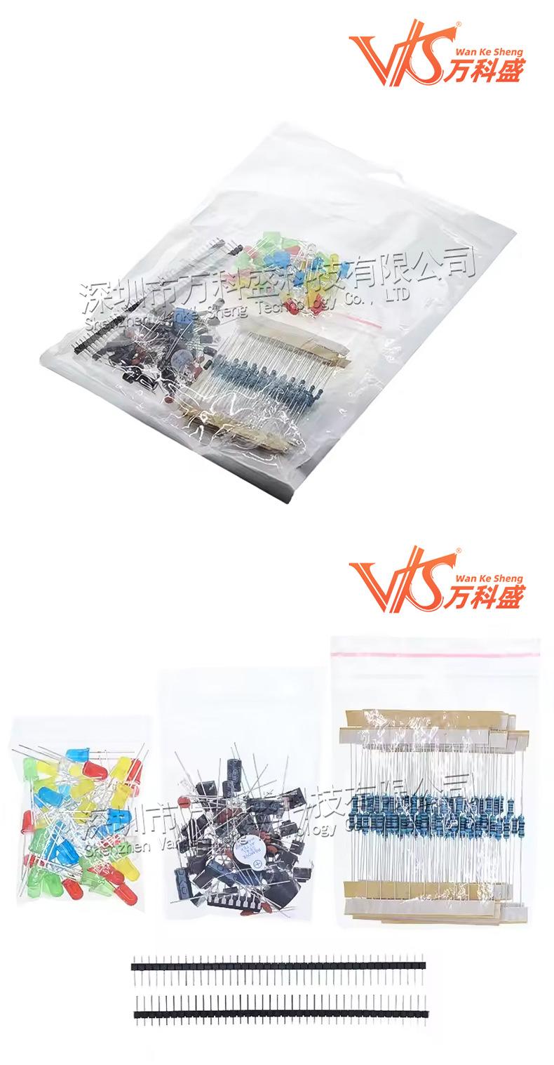 Lista de embalaje: 10 * LED Blanco 10 * LED Amarillo 10 * LED Azul 10 * LED Verde 10 * LED Rojo 1 * LED RGB 2 * Fotorresistencias 1 * Termistor 5 * Rectificador de diodo (1N4007) 5 * transistores NPN (PN2222) 1 * CI 4N35 1 * CI 74HC595 10 * Botones (pequeños) 1 * Zumbador Activo 1 * Zumbador Pasivo 1 * Potenciómetro de Precisión condensadores cerámicos de 10*22pf 10*104 capacitores cerámicos 5*Condensadores Electrolíticos (10UF 50V) 5*Condensadores Electrolíticos (100UF 50V) 10 * Resistencias (10R) 10*Resistencias (100R) 10*Resistencias (220R) 10*Resistencias (330R) 10 * Resistencias (1K) 10 * Resistencias (2K) 10 * Resistencias (5K1) 10 * Resistencias (10K) 10 * Resistencias (100K) 10 * Resistencias (1M) 2 * Conector de pines (40 pines)