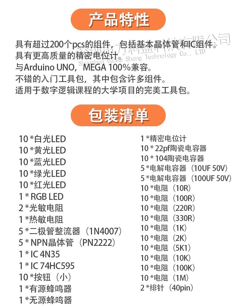 característica: Con más de 200 piezas de componentes, incluyendo transistores básicos y componentes IC. Con potenciómetro de precisión de mayor calidad. 100% compatible con Arduino UNO, MEGA. Buen kit de inicio con muchos componentes incluidos. El kit perfecto para proyectos universitarios en clases de lógica digital.