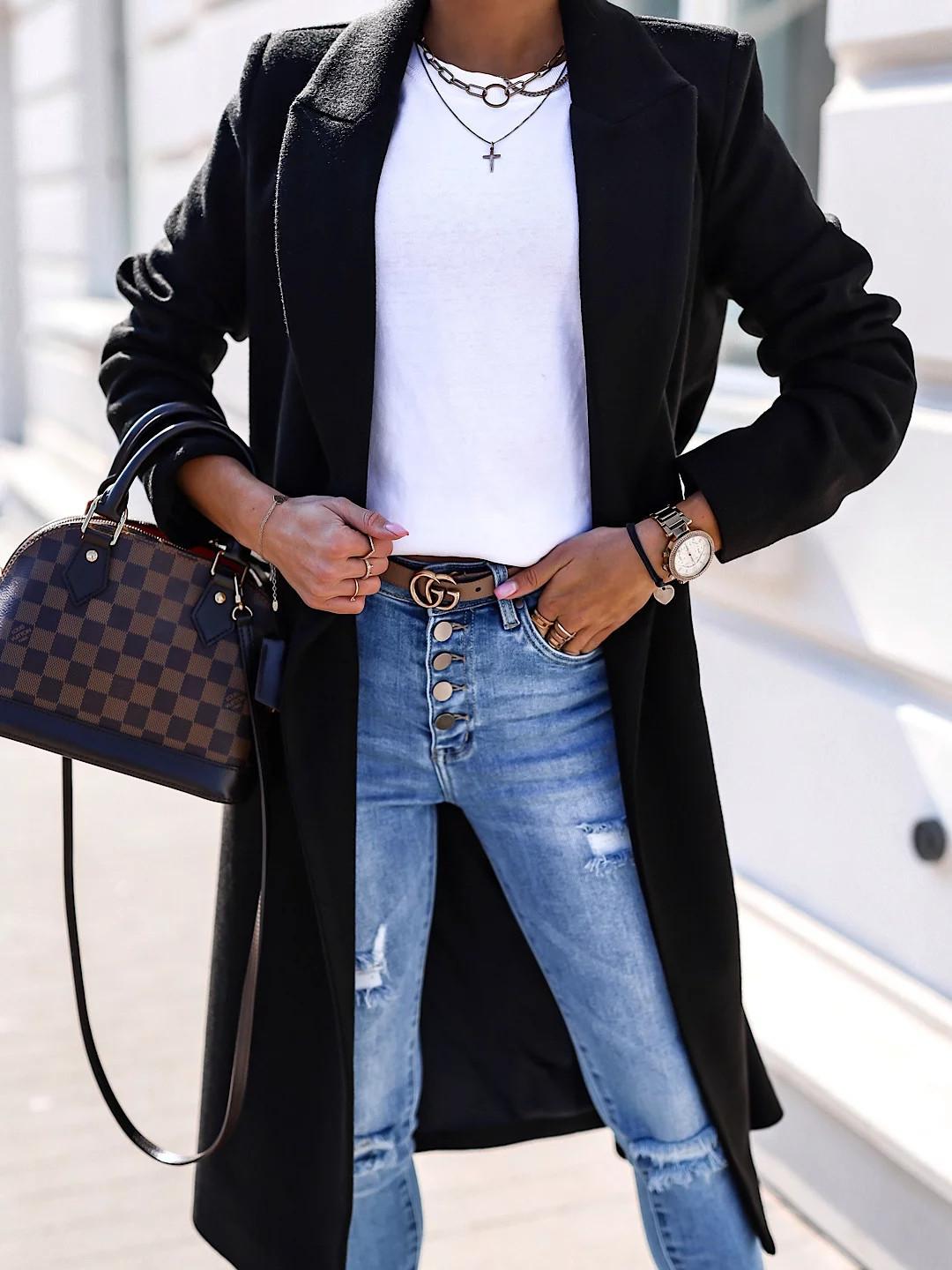 Chaqueta con cinturón dividido y botones de solapa de manga larga sencilla de otoño e invierno de Amazon, nueva estación independiente europea y americana de 2024 para mujer