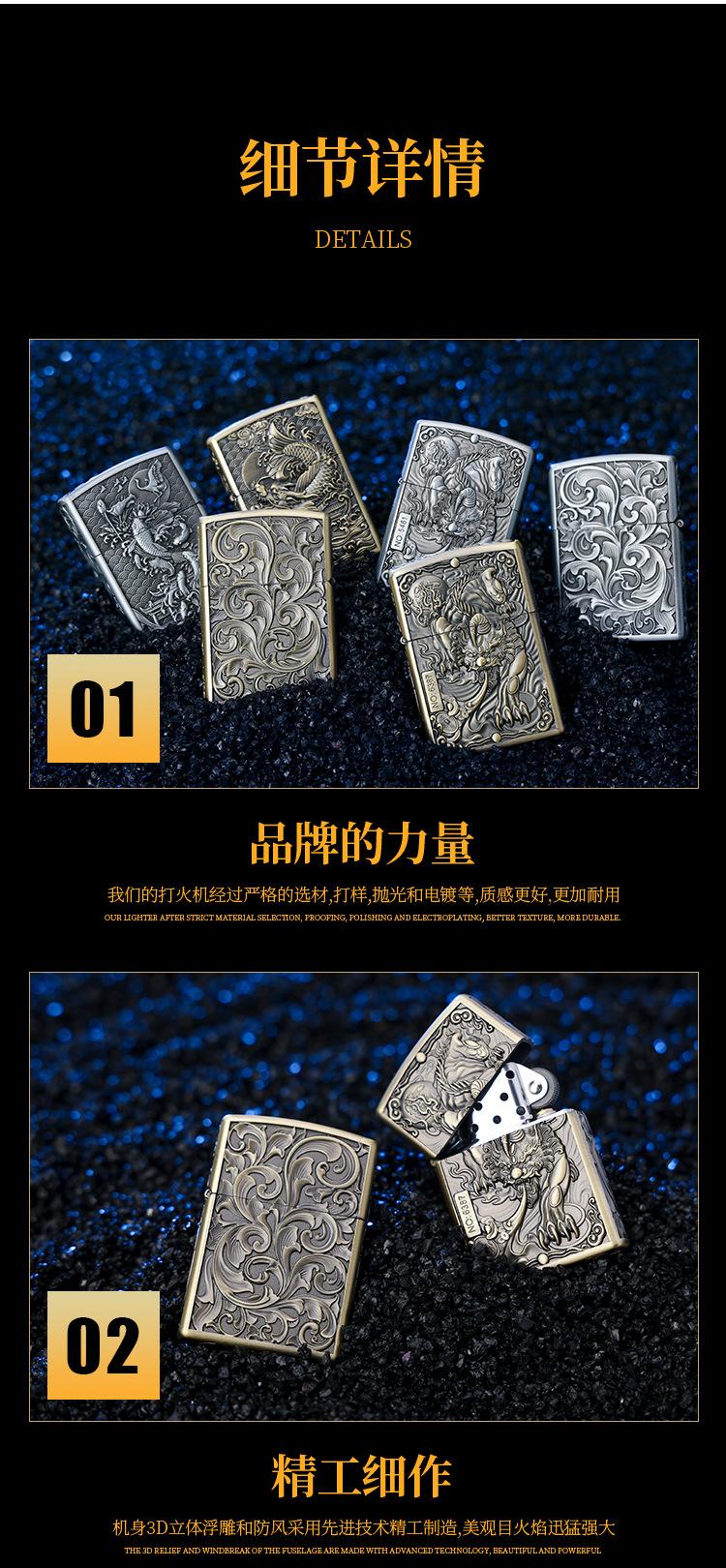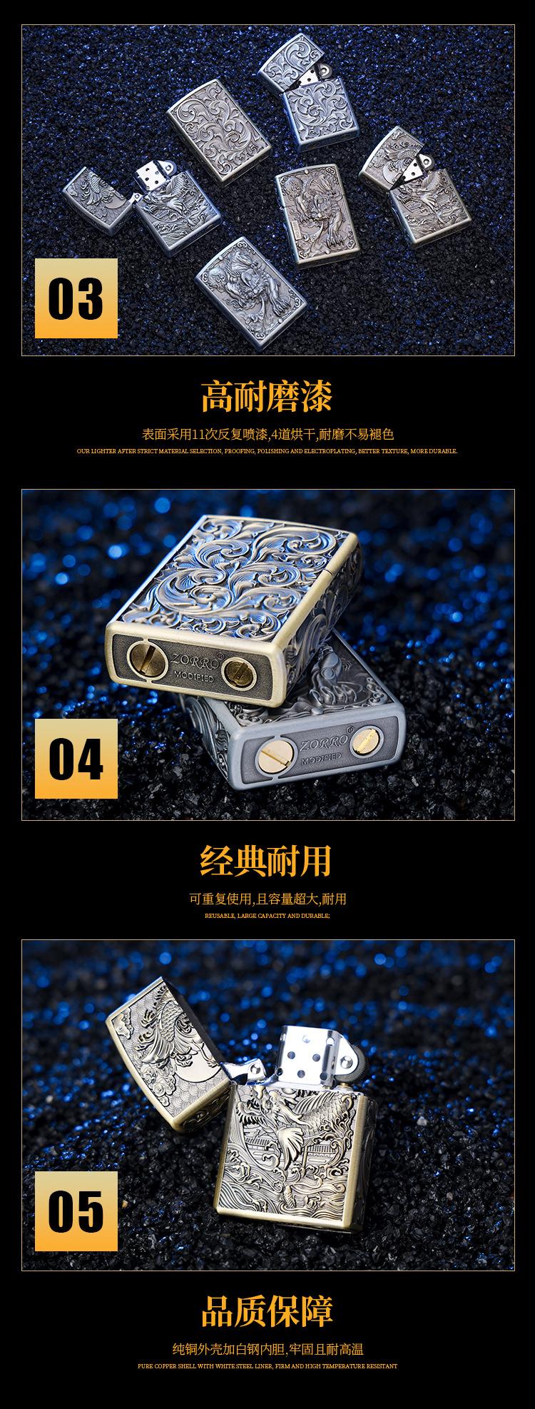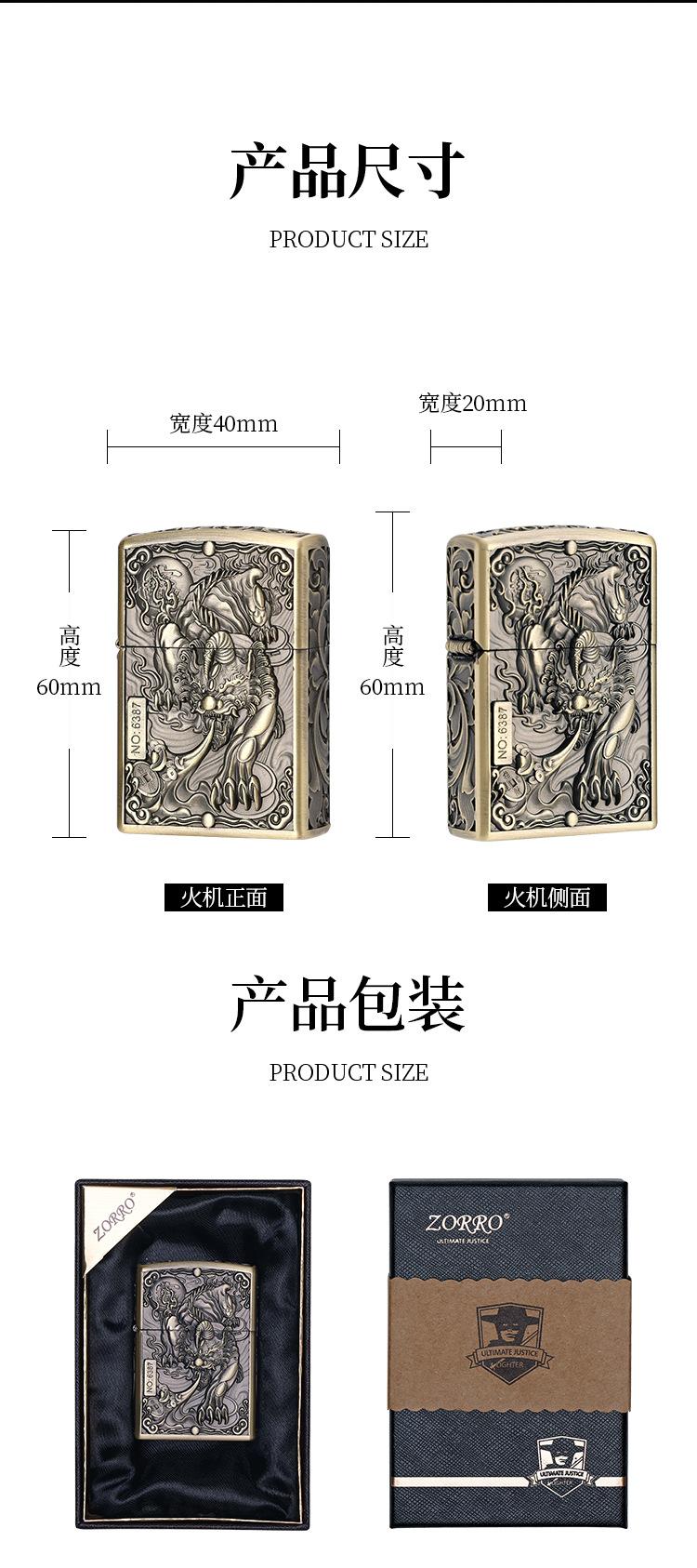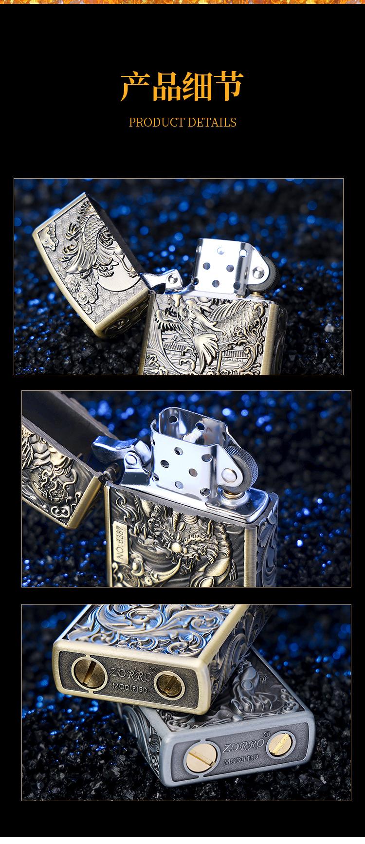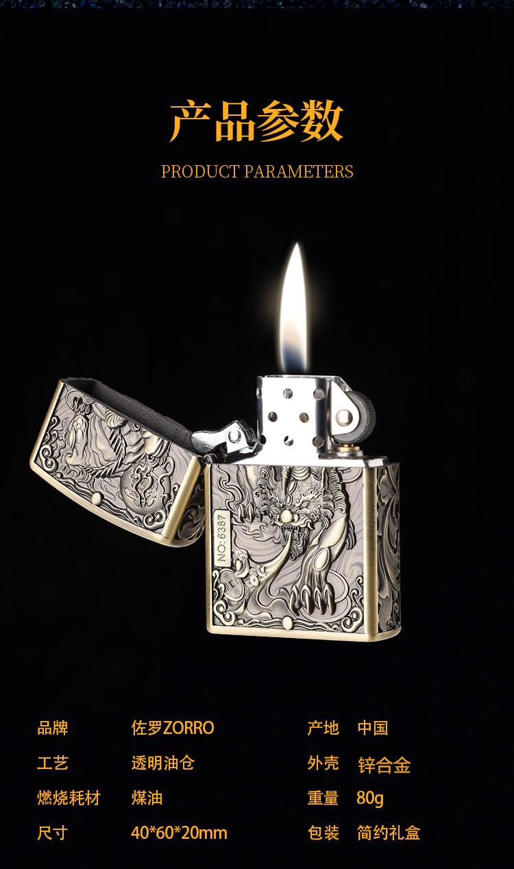 Compra Encendedor de queroseno ZORRO ZORRO con relieve vintage antiguo con rueda de molienda, resistente al viento, encendedor integrado, regalo serie ZK al por mayor en Joom.pro