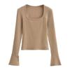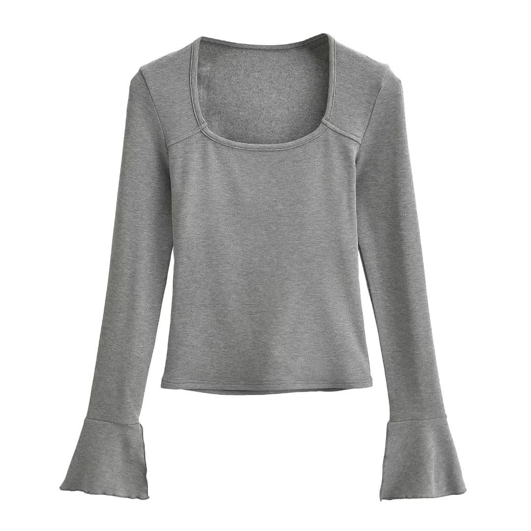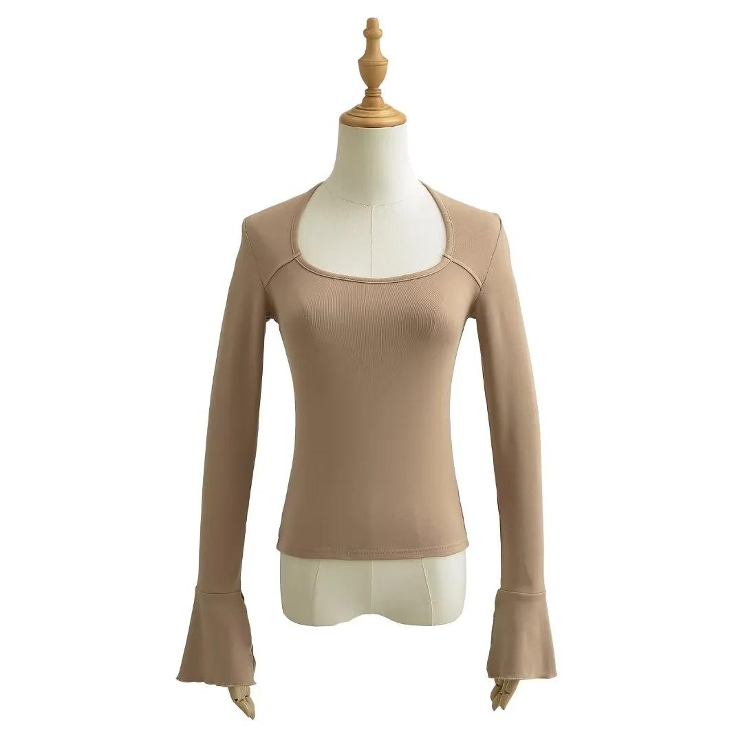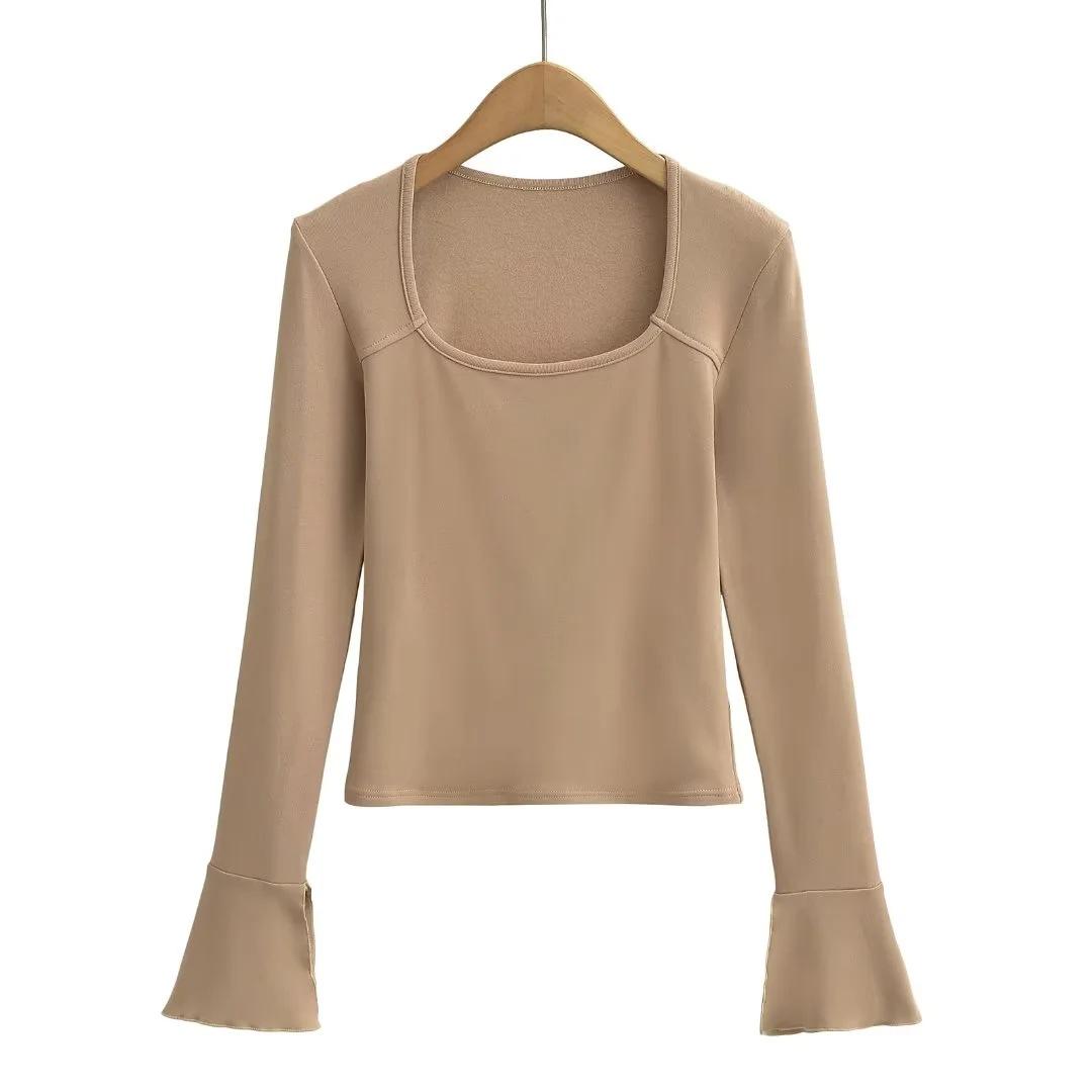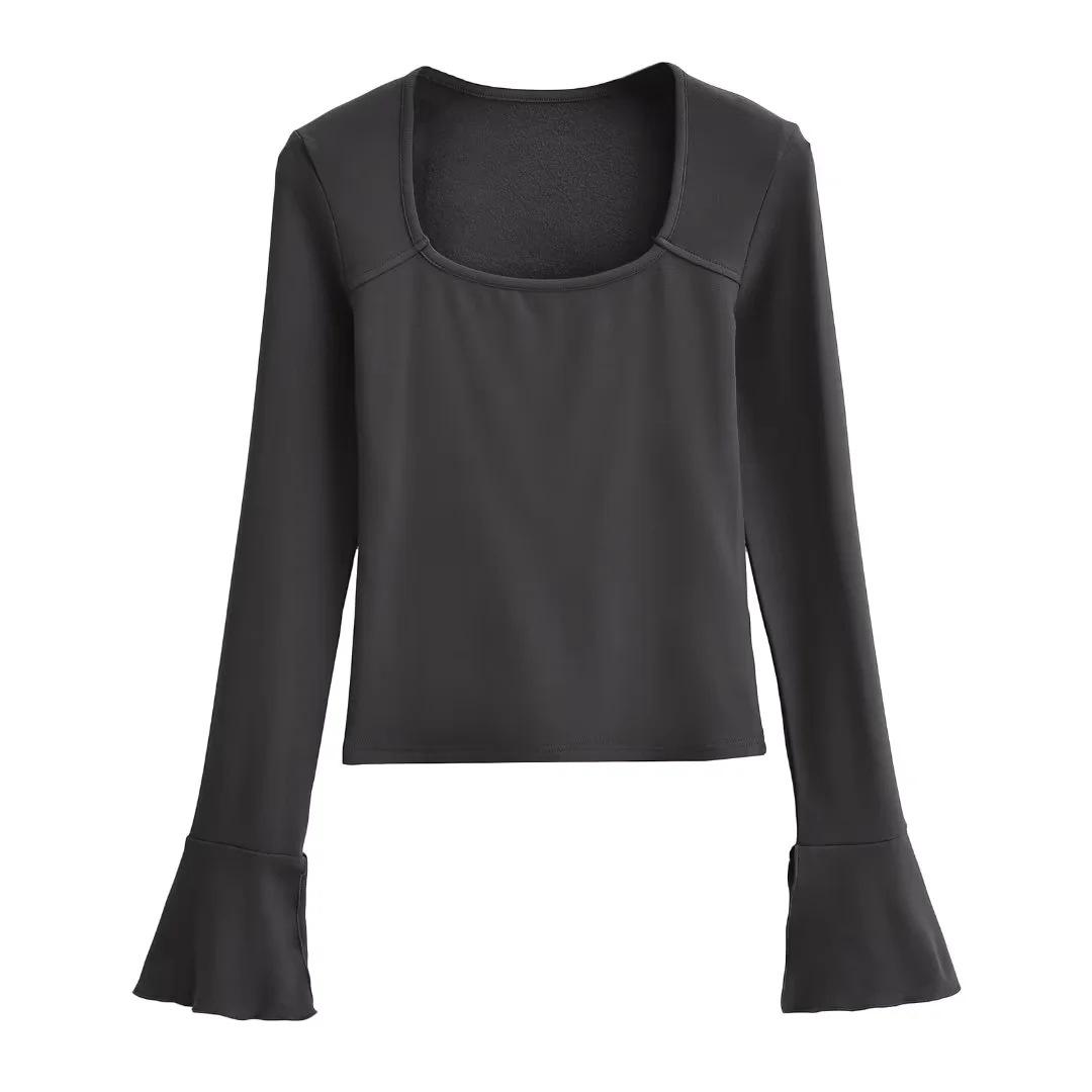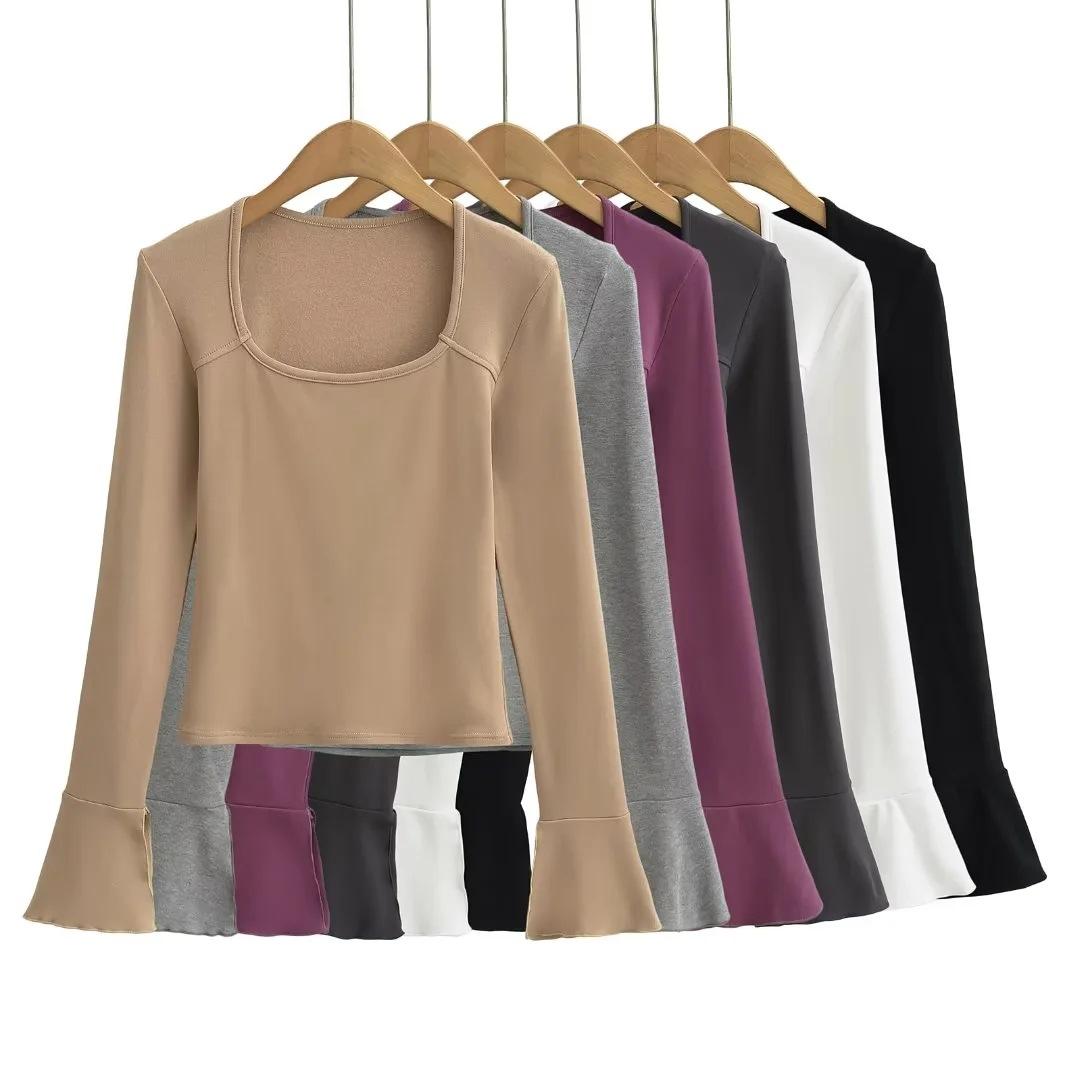 Compra Camiseta de manga acampanada con cuello cuadrado y forro polar para mujer, temporada 2023, corte entallado, adelgazante, color liso, interior de manga larga al por mayor en Joom.pro
