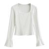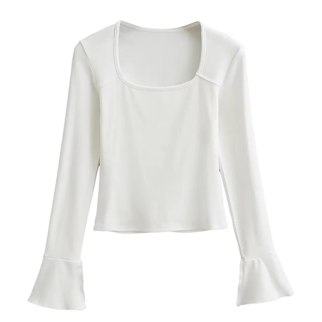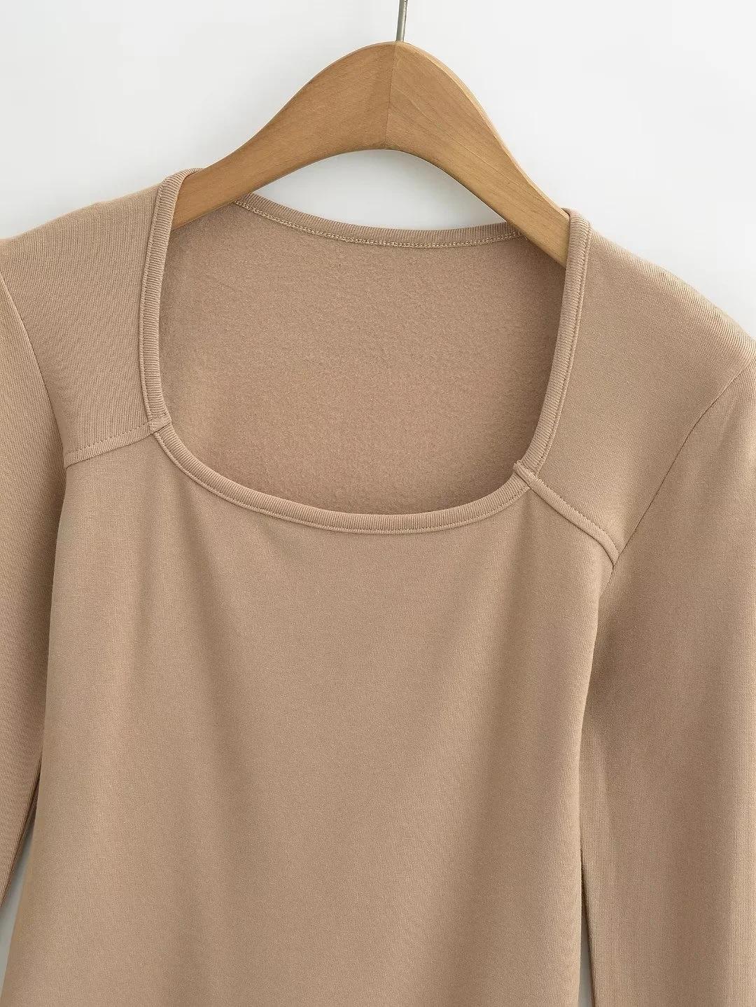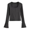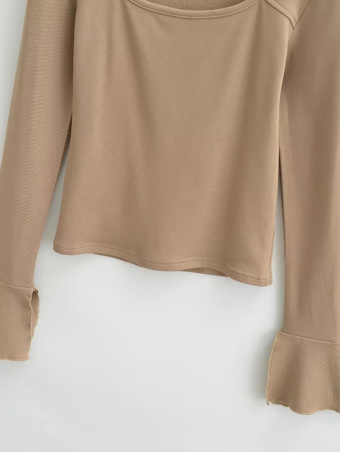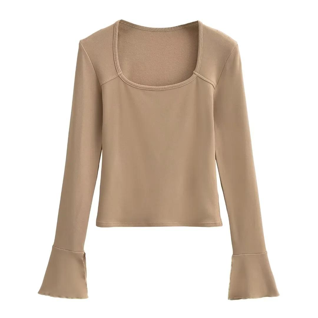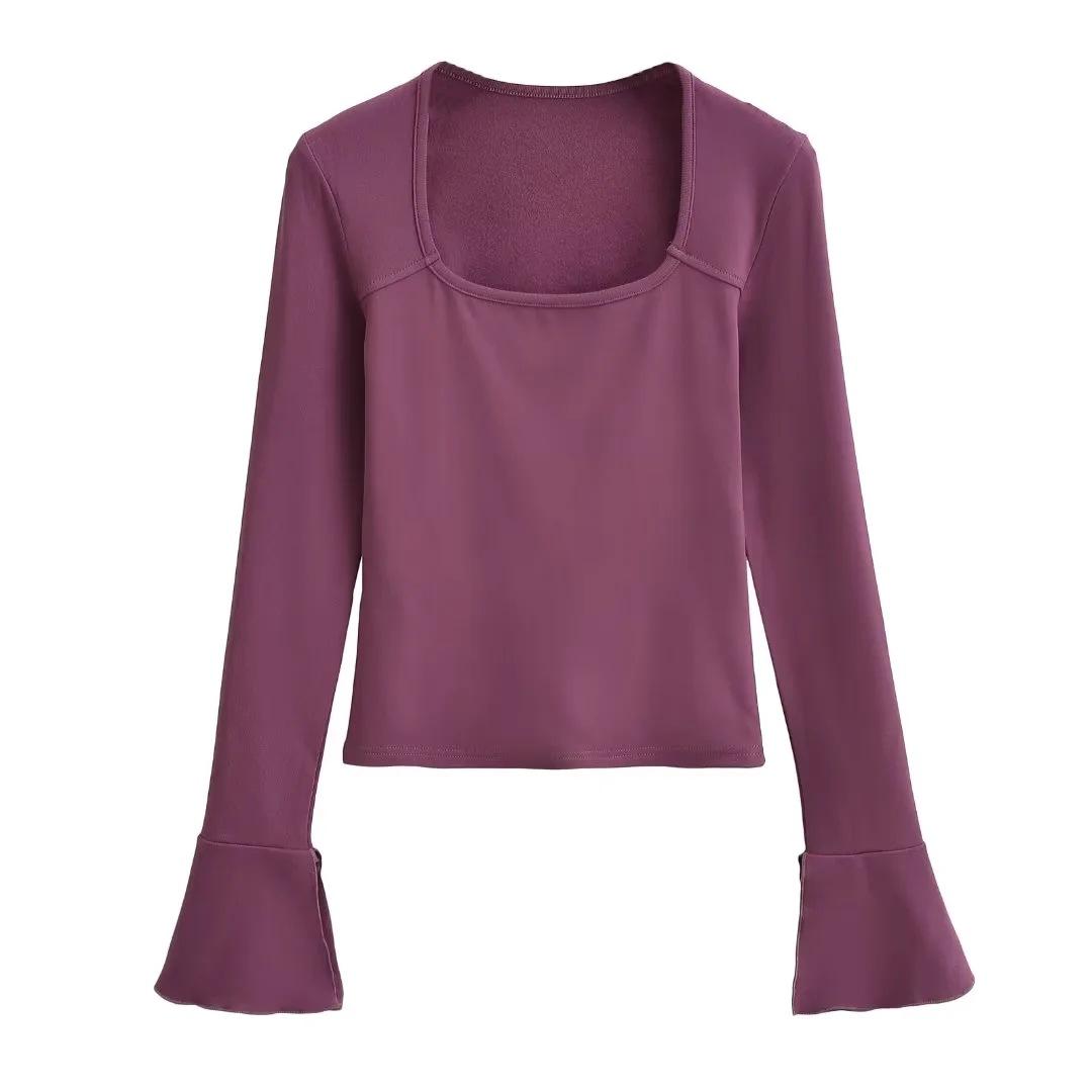Compra Camiseta de manga acampanada con cuello cuadrado y forro polar para mujer, temporada 2023, corte entallado, adelgazante, color liso, interior de manga larga al por mayor en Joom.pro