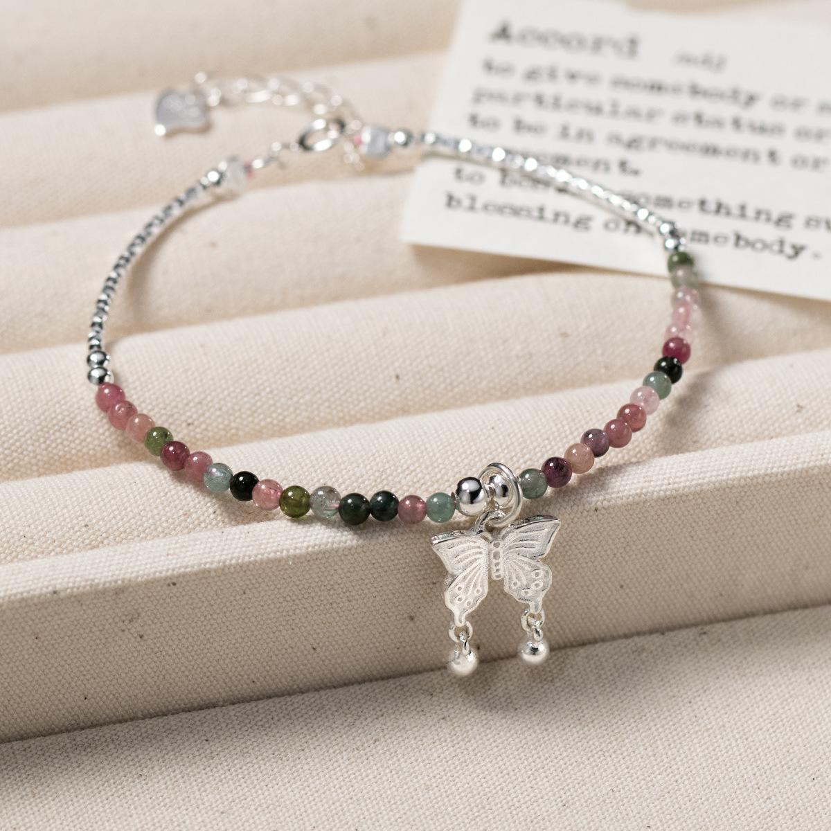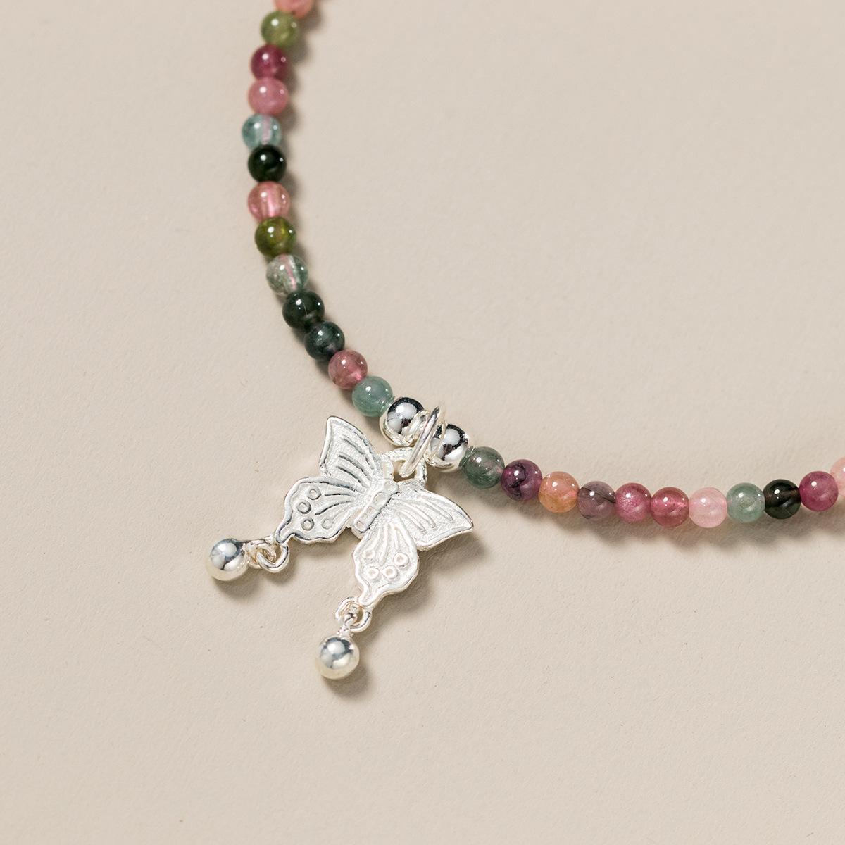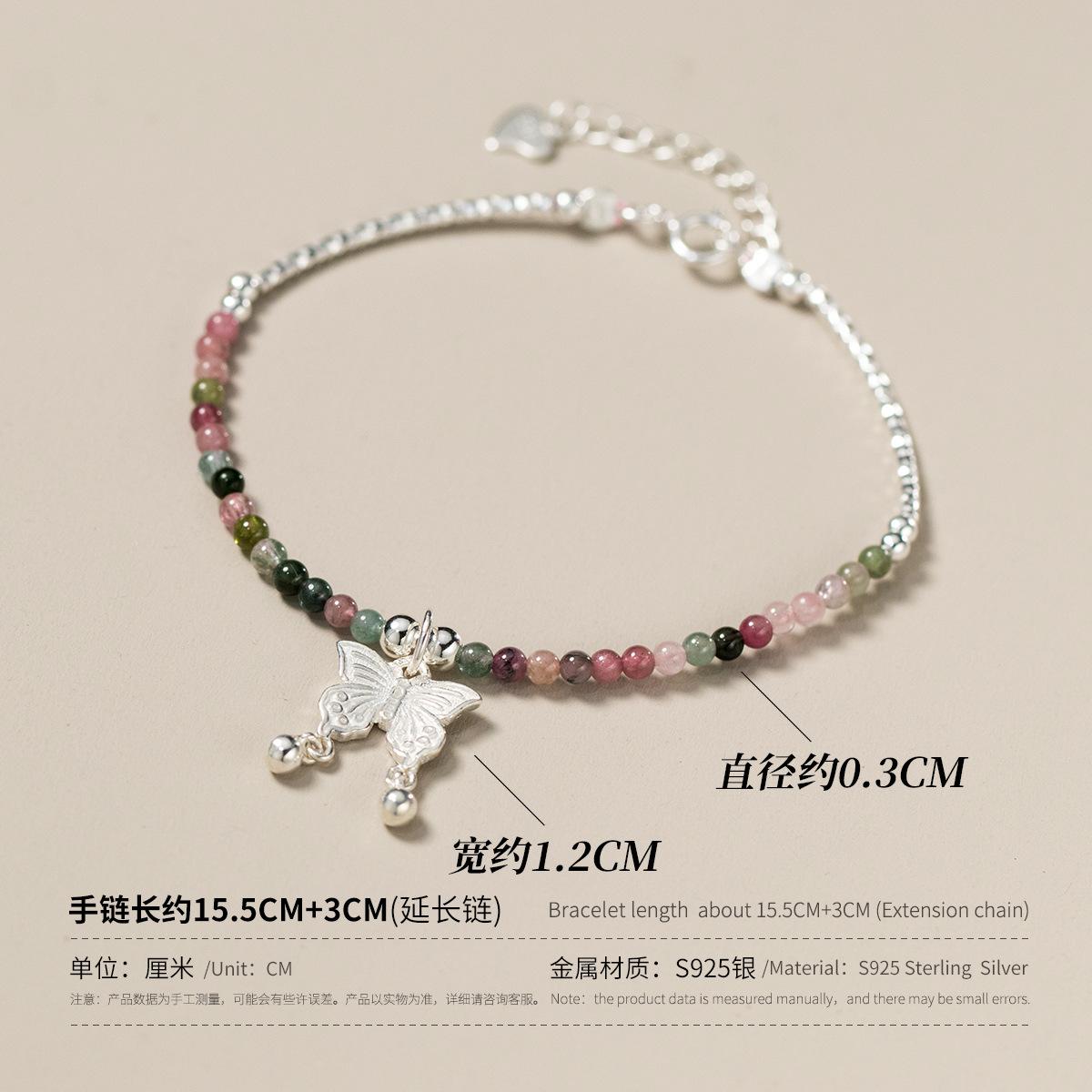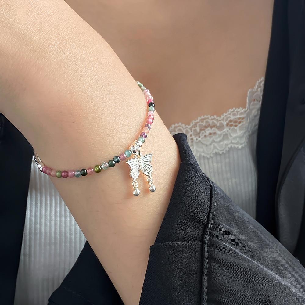 Pulsera ajustable de plata S925 sencilla fresca mariposa cuentas redondas turmalina para mujer diy joyería de mano al por mayor C0028