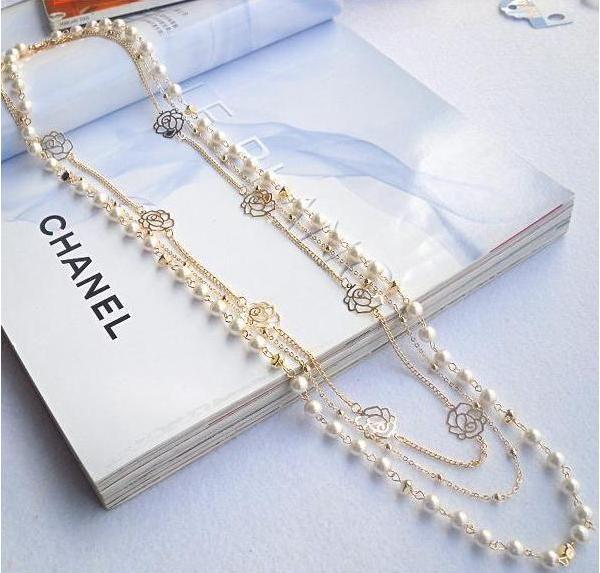 Versión coreana de collar largo tipo cadena de suéter con colgante de flor multicapa de perlas collar largo de accesorios de ropa para mujer flor rosa {{{{{{{{{{{