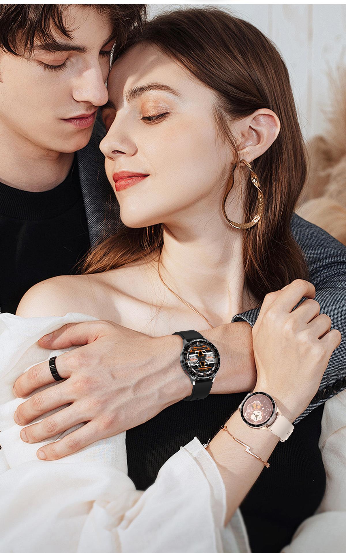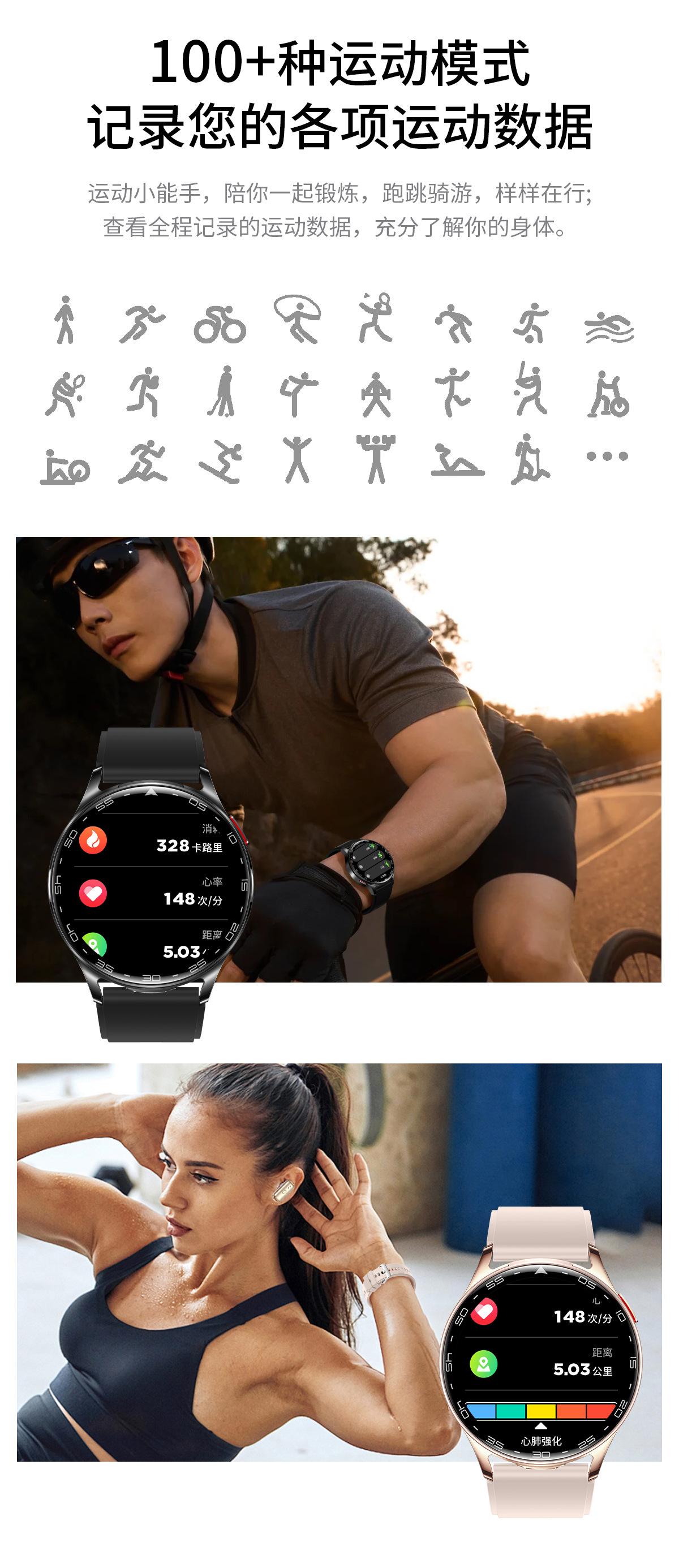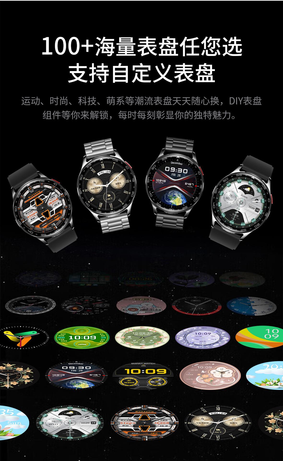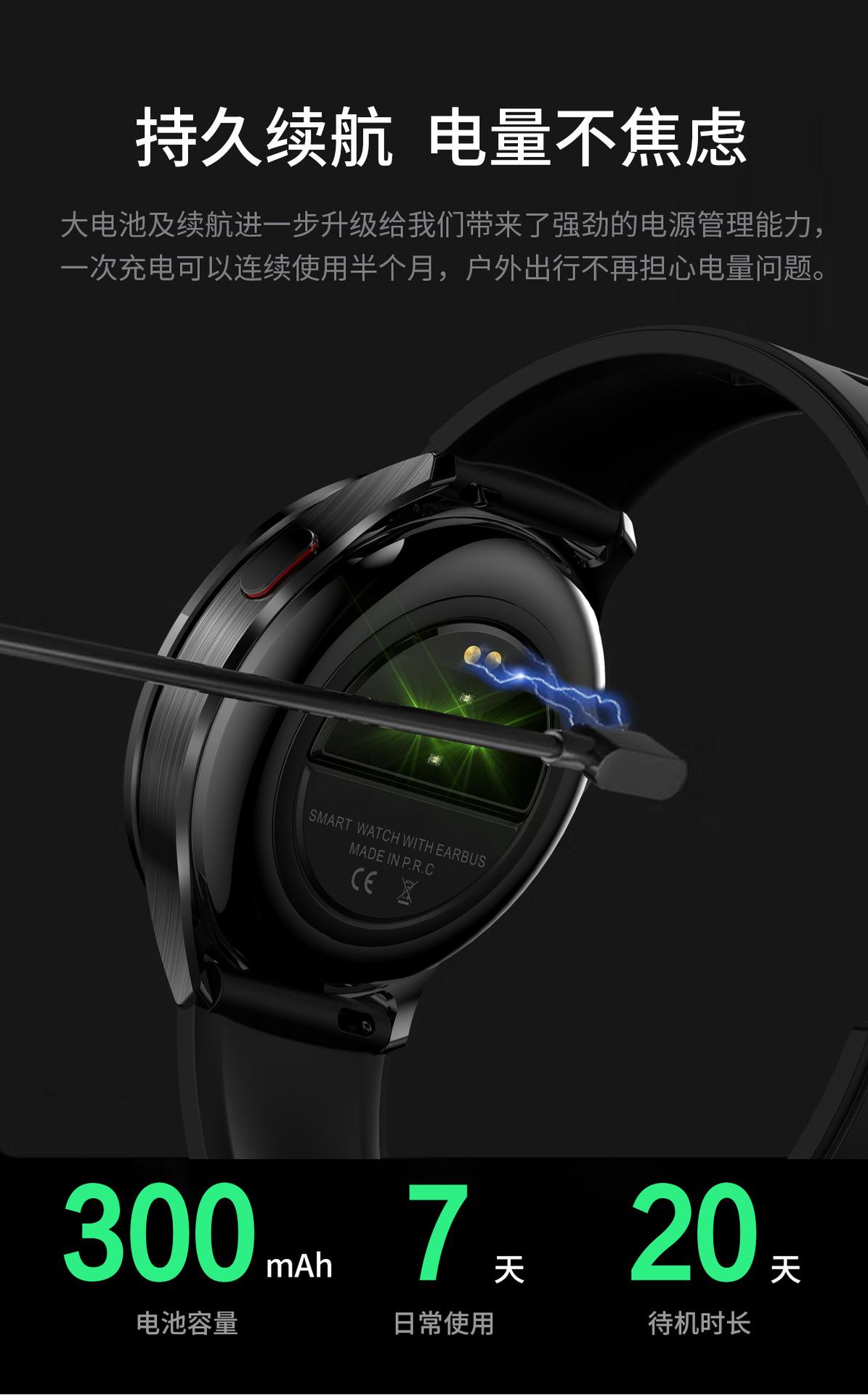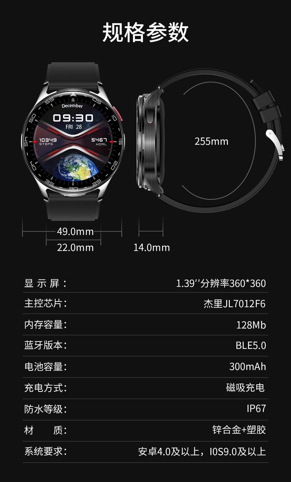 Apariencia profesional, fabricación en metal, correa deportiva de TPU de alta gama, botones táctiles y mecánicos de círculo completo, 3 configuraciones de interfaz de usuario, versión BLE5.0, batería de gran capacidad de 300 mAh, duración en espera de más de 25 días. Hasta 10 horas de sonido potente (volumen máximo) para altavoces externos. El reloj inteligente detecta con precisión la frecuencia cardíaca las 24 horas, monitoriza la presión arterial, el oxígeno en sangre, el ejercicio, el kilometraje y el consumo de calorías, recordatorios de mensajes, registro de sueño, fotografía remota, descargas gratuitas de diales y creación de diales DIY.