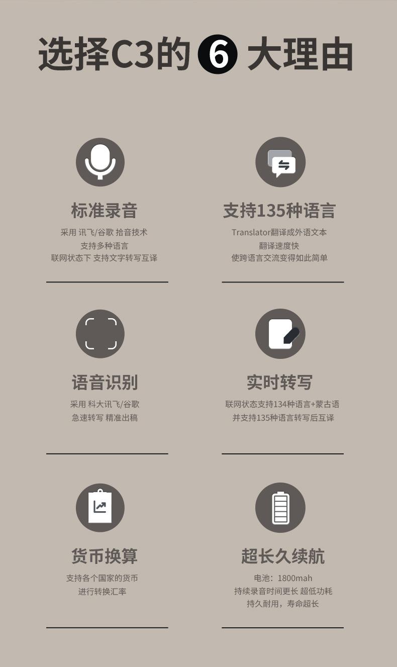 Admite grabación estándar en línea/fuera de línea, grabación de voz, sin límite de tiempo y grabación diaria de la vida diaria, reuniones, etc. Admite grabación + transcripción + traducción de transcripción en 6 idiomas cuando está conectado a Internet. La grabadora C3 realiza la integración de grabación + transcripción + traducción, duración de batería ultralarga, reducción de ruido de alta definición y calidad de grabación optimizada.