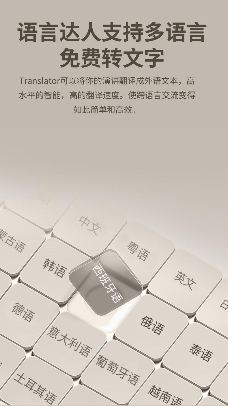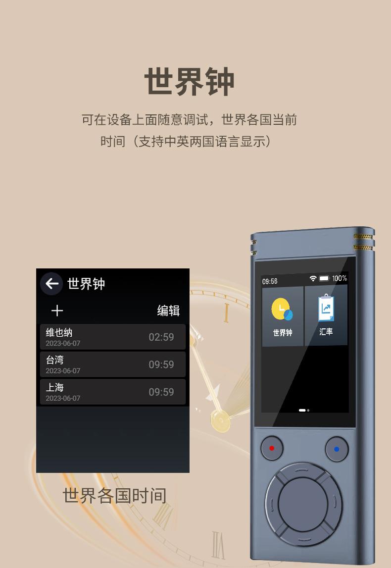 Admite traducción de voz en línea en 138 idiomas, traducción de voz sin conexión en 17 idiomas, conversión de divisas, reloj mundial y otras funciones
