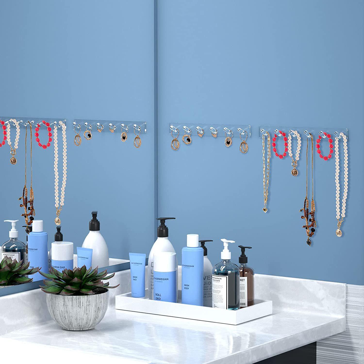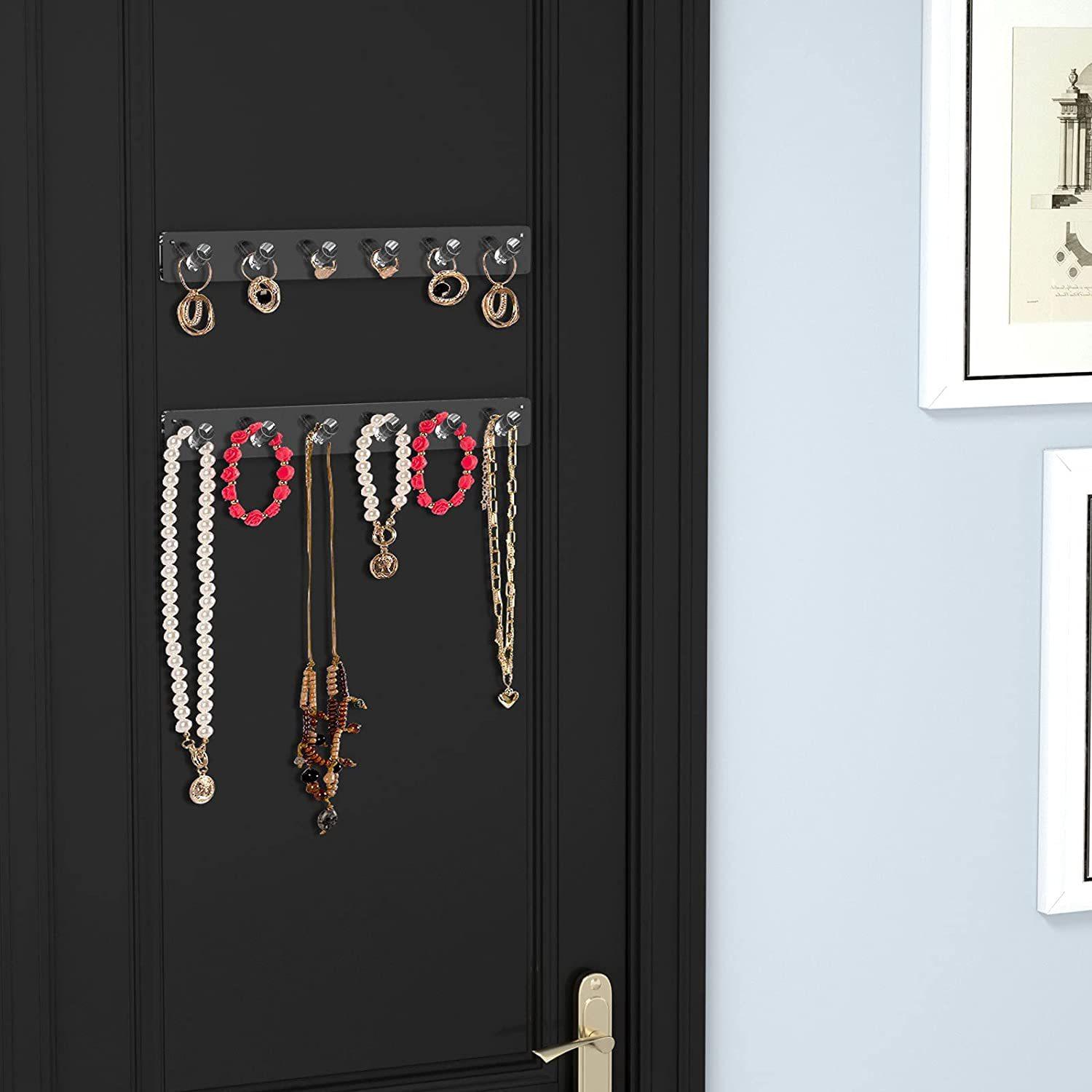 Cada paquete contiene4 organizadores de pared para joyas, cada uno con 6 ganchos, 24 ganchos en total.Cristalino, muy hermoso. El gancho brillante es ampliamente utilizado, y también se puede usar para llaves, bandanas, correas de perro u otros accesorios, instalado detrás de la puerta.