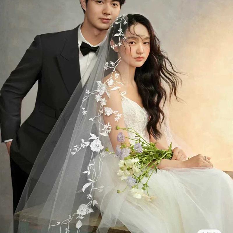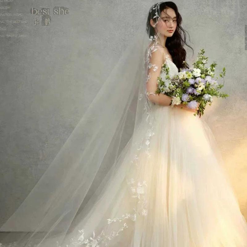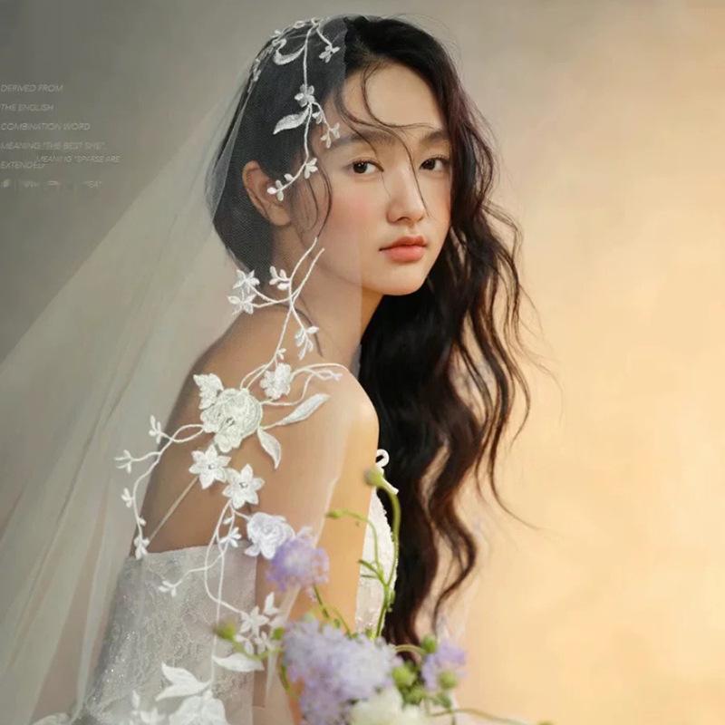 Velo de novia largo de encaje, retrato para fotos de boda, accesorios para el cabello de boda de alta gama, tocados franceses para boda