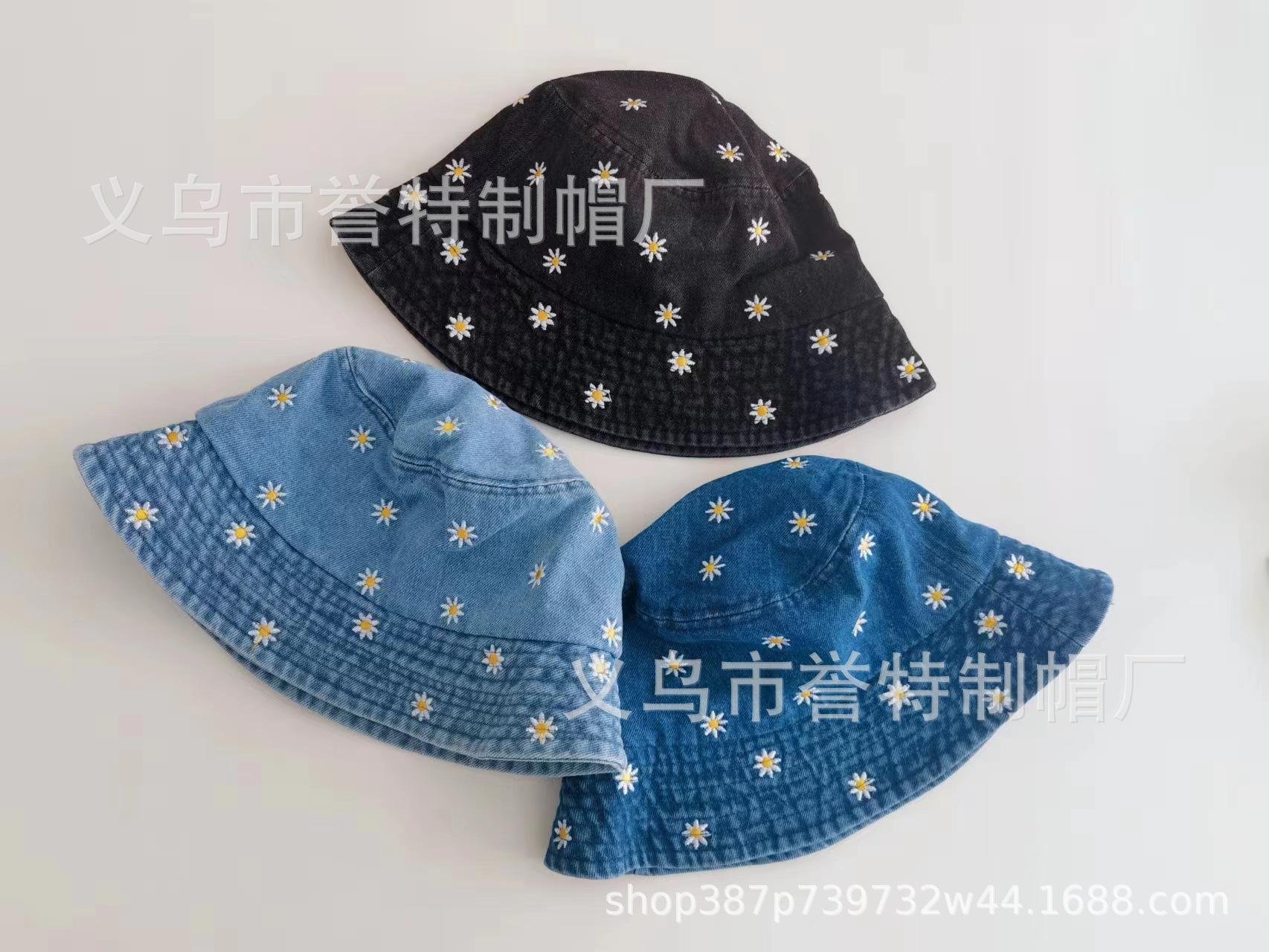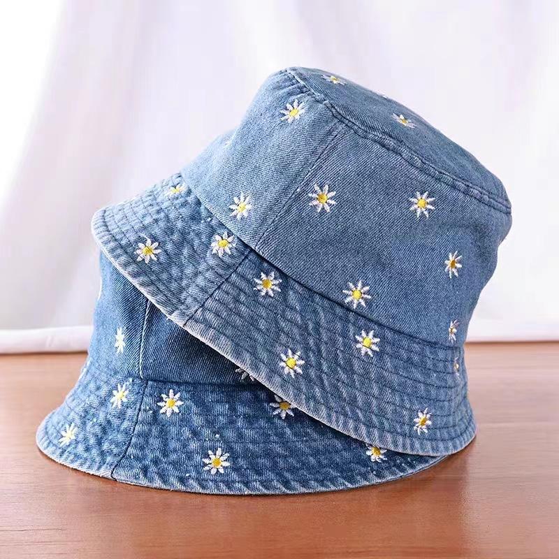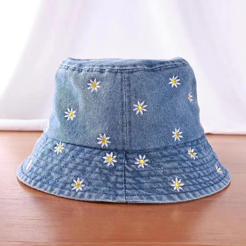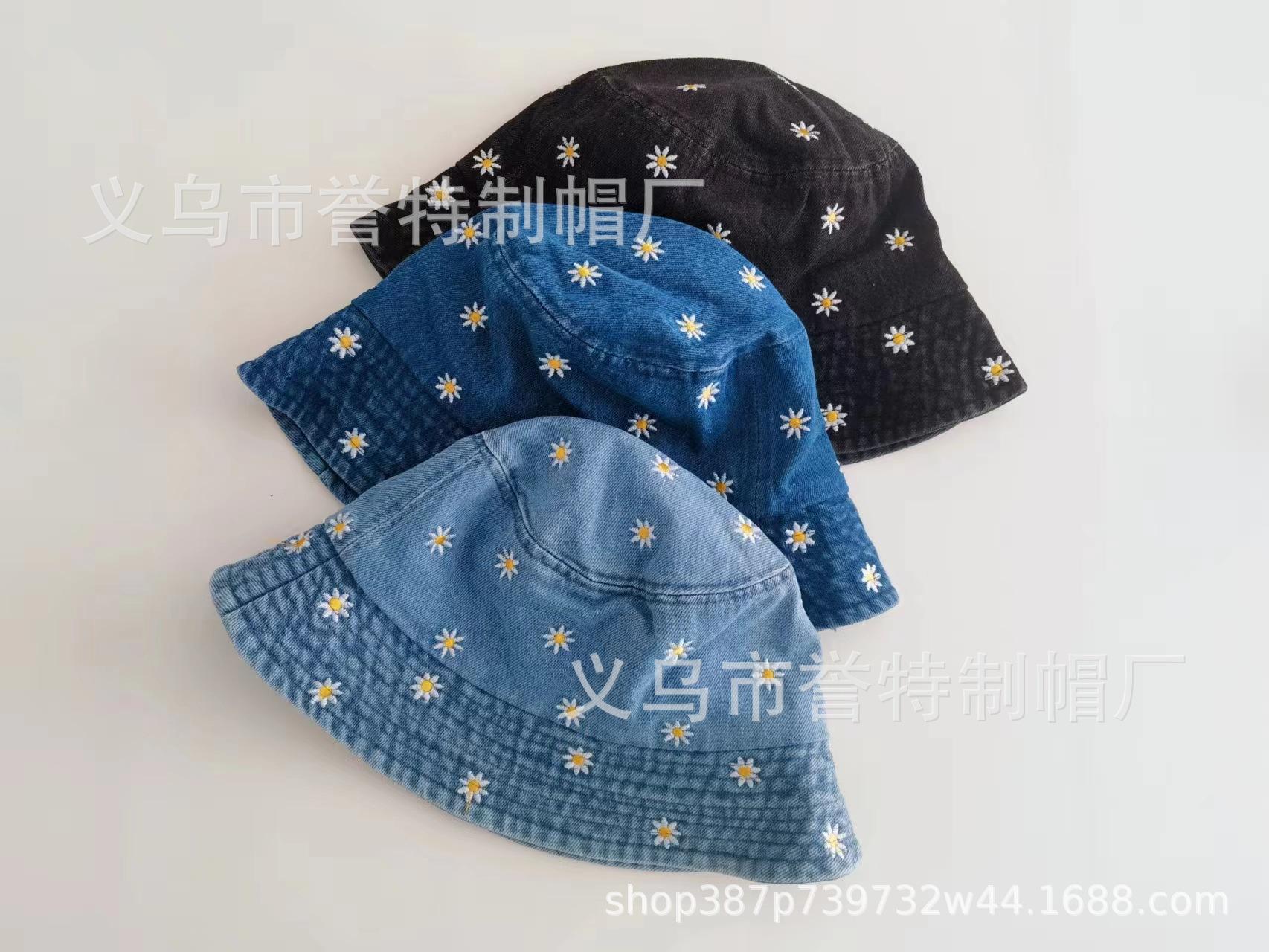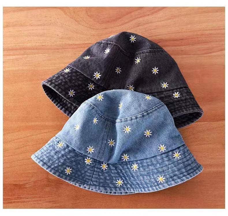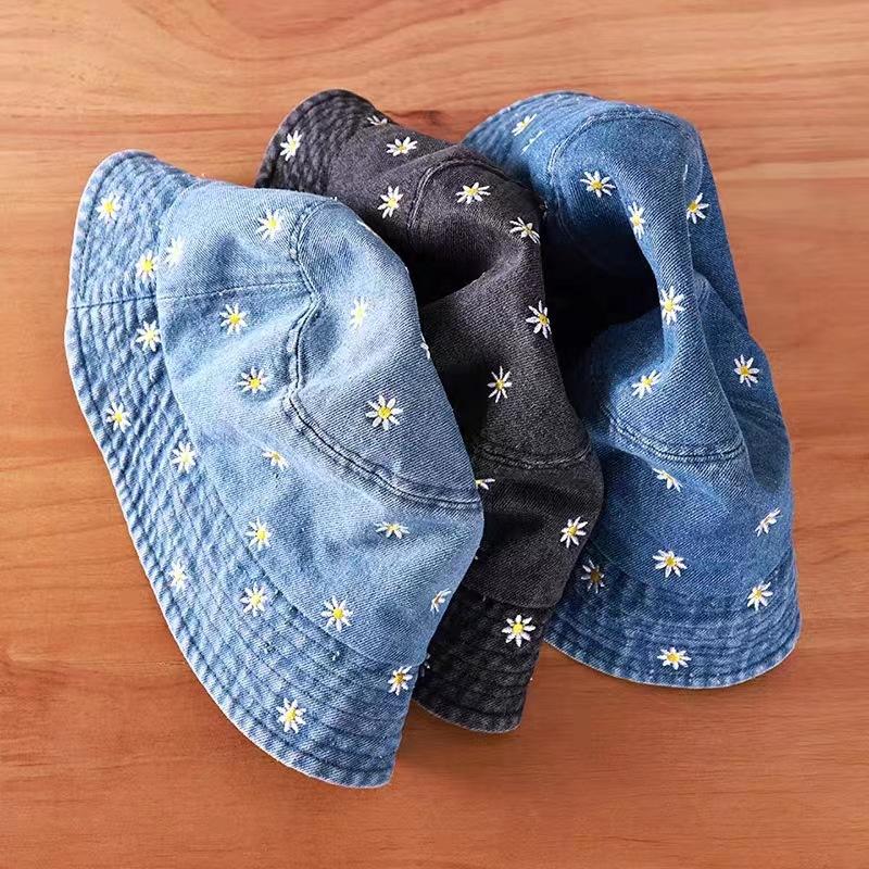 Sombrero de Pescador de Mezclilla Bordado con Margaritas Japonesas para Niños, Moderno, Primavera Verano Otoño, Retro, Combinable con Todo, Sombreado Facial, Pequeño Parasol, Sombrero de Cubo
