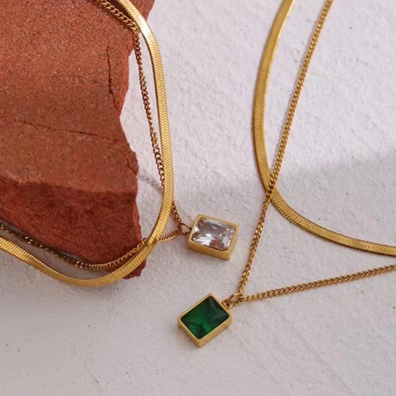 Green zircon pendant double layer necklace, White zircon pendant double layer necklace