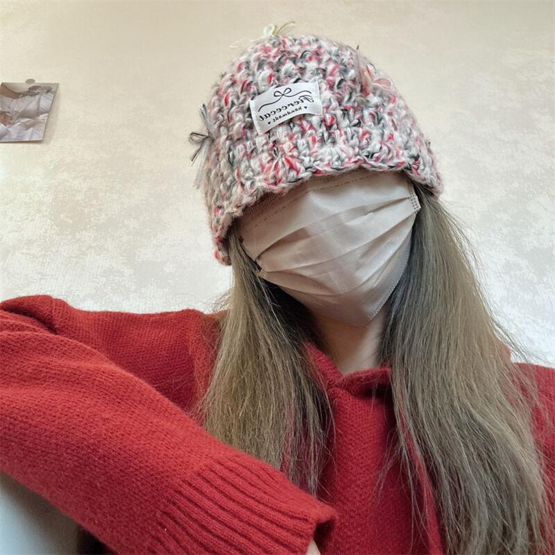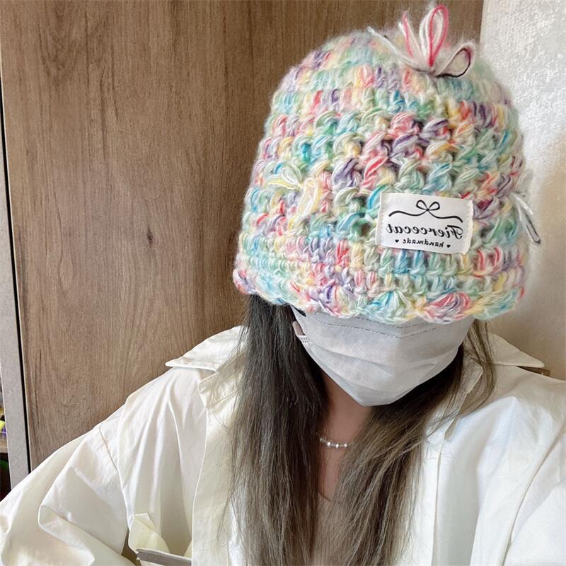 Gorro de punto de color nuevo 2024 para niños, otoño e invierno, japonés, dulce, con lazo para combinar, cálido, de lana