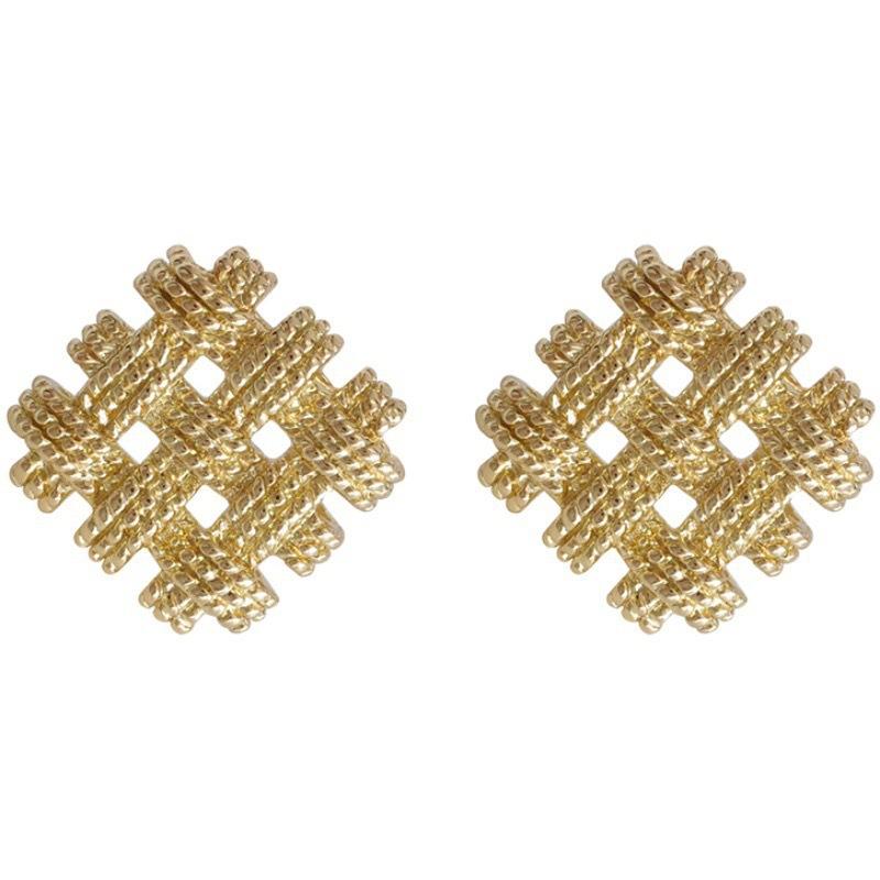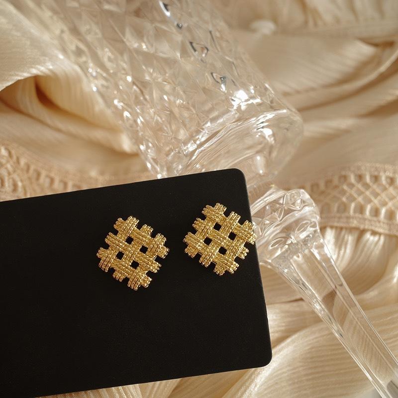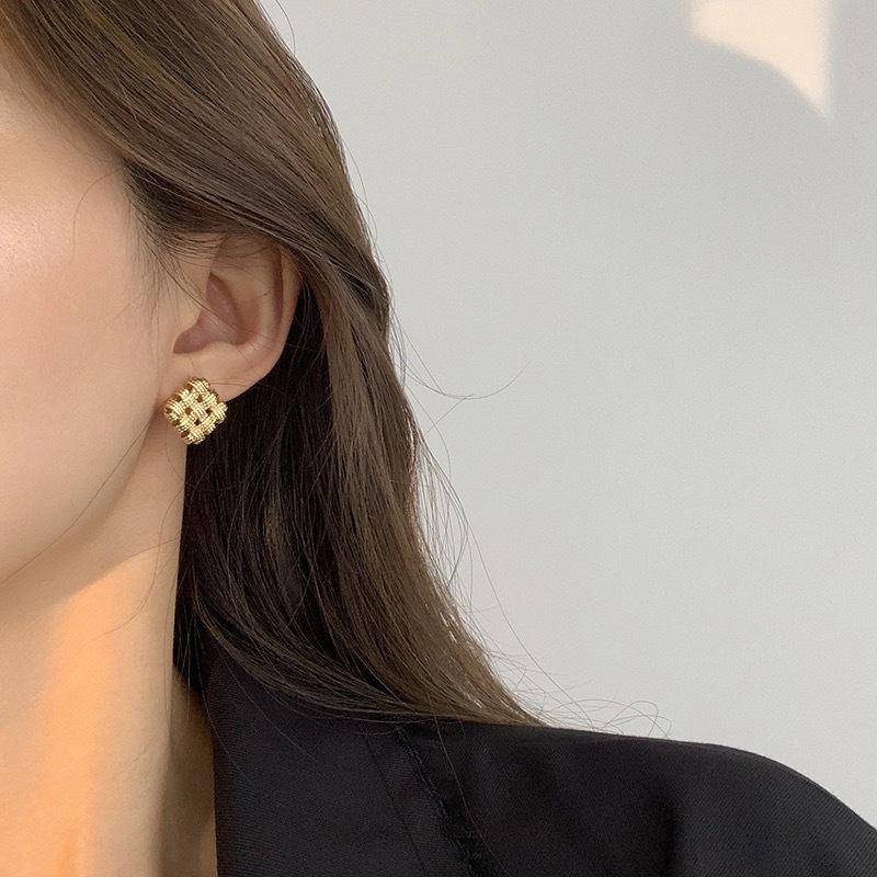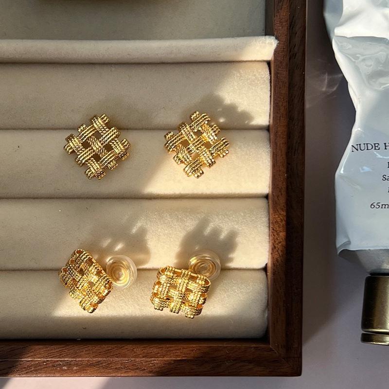 Woven square stud earrings (copper plated gold), Woven square ear clip (copper plated gold)