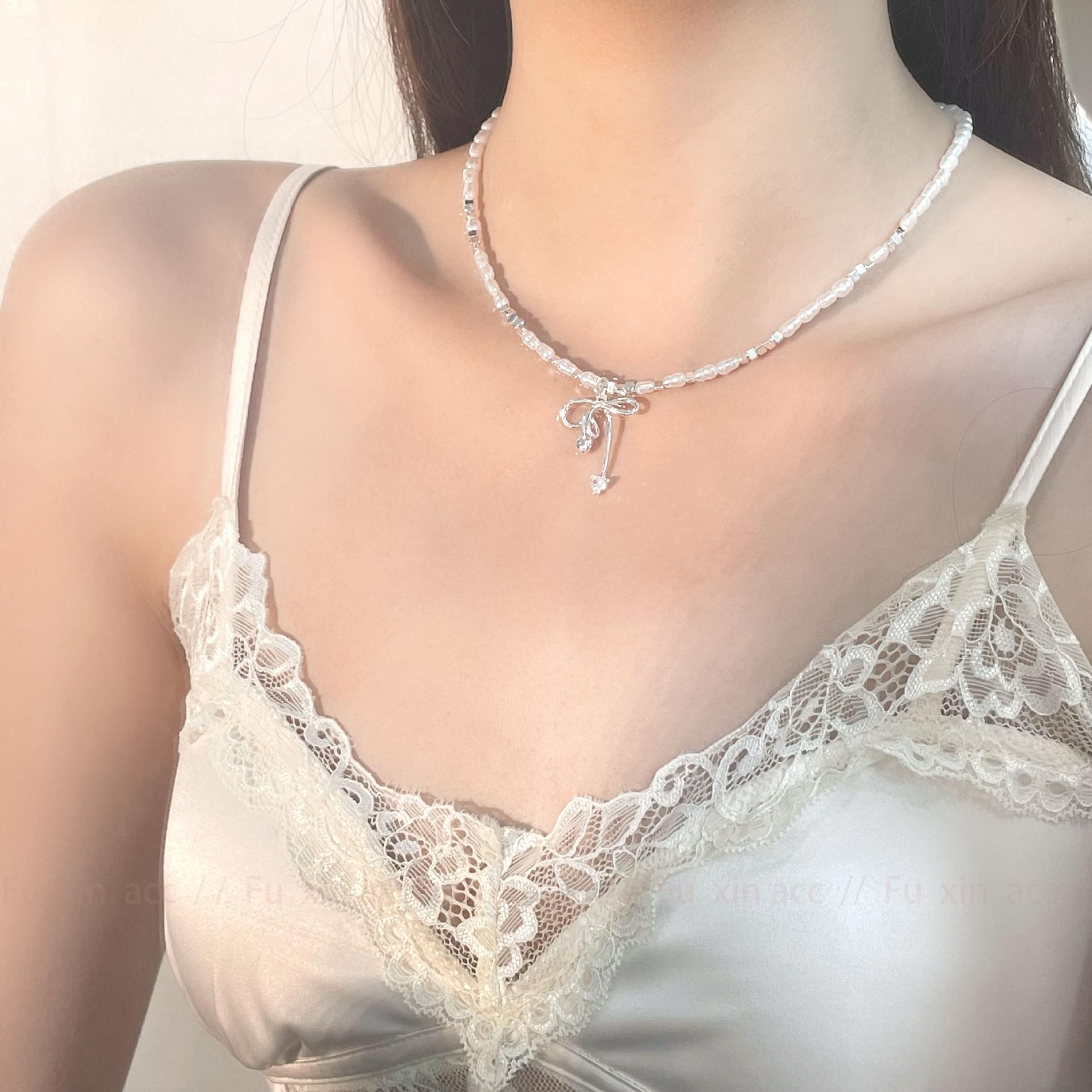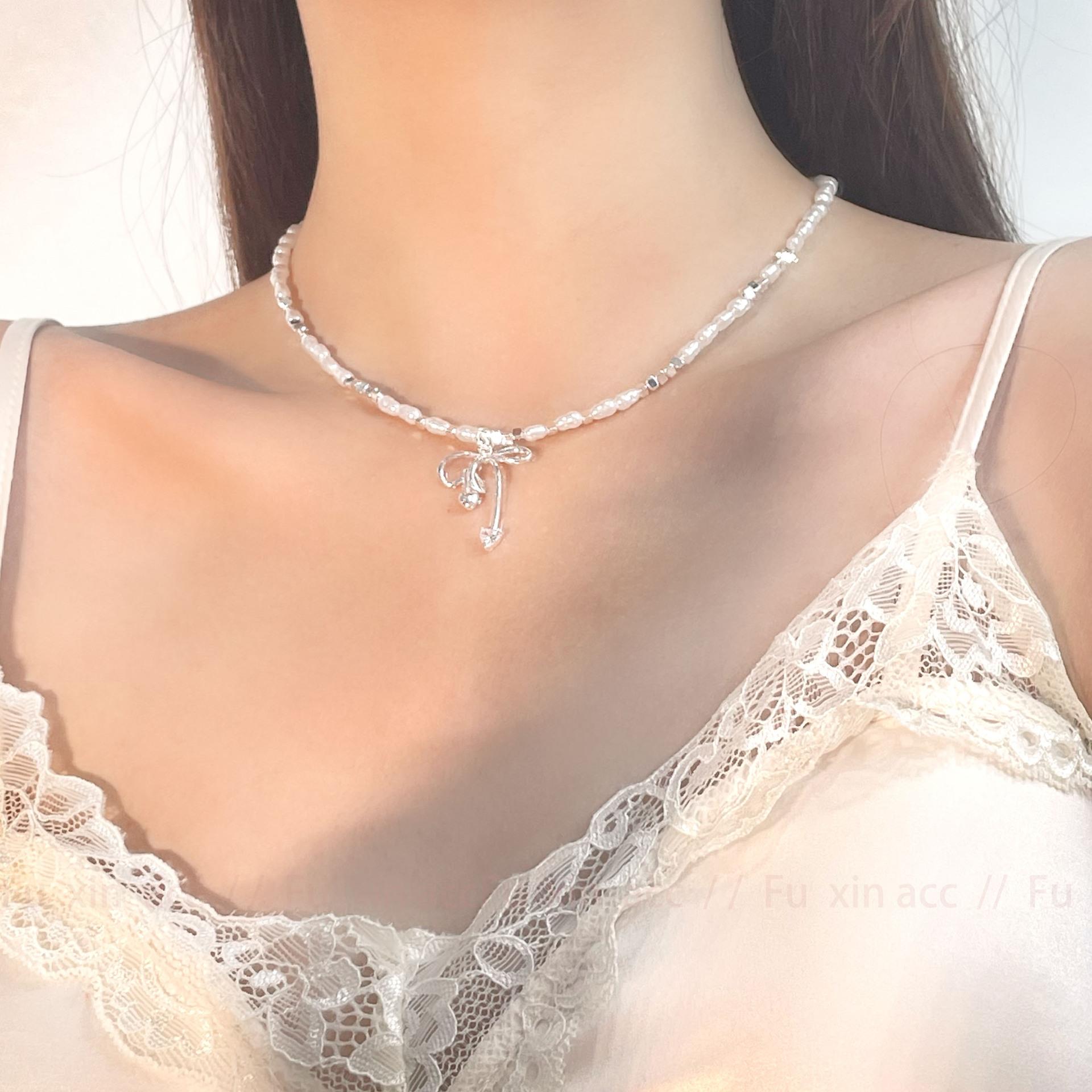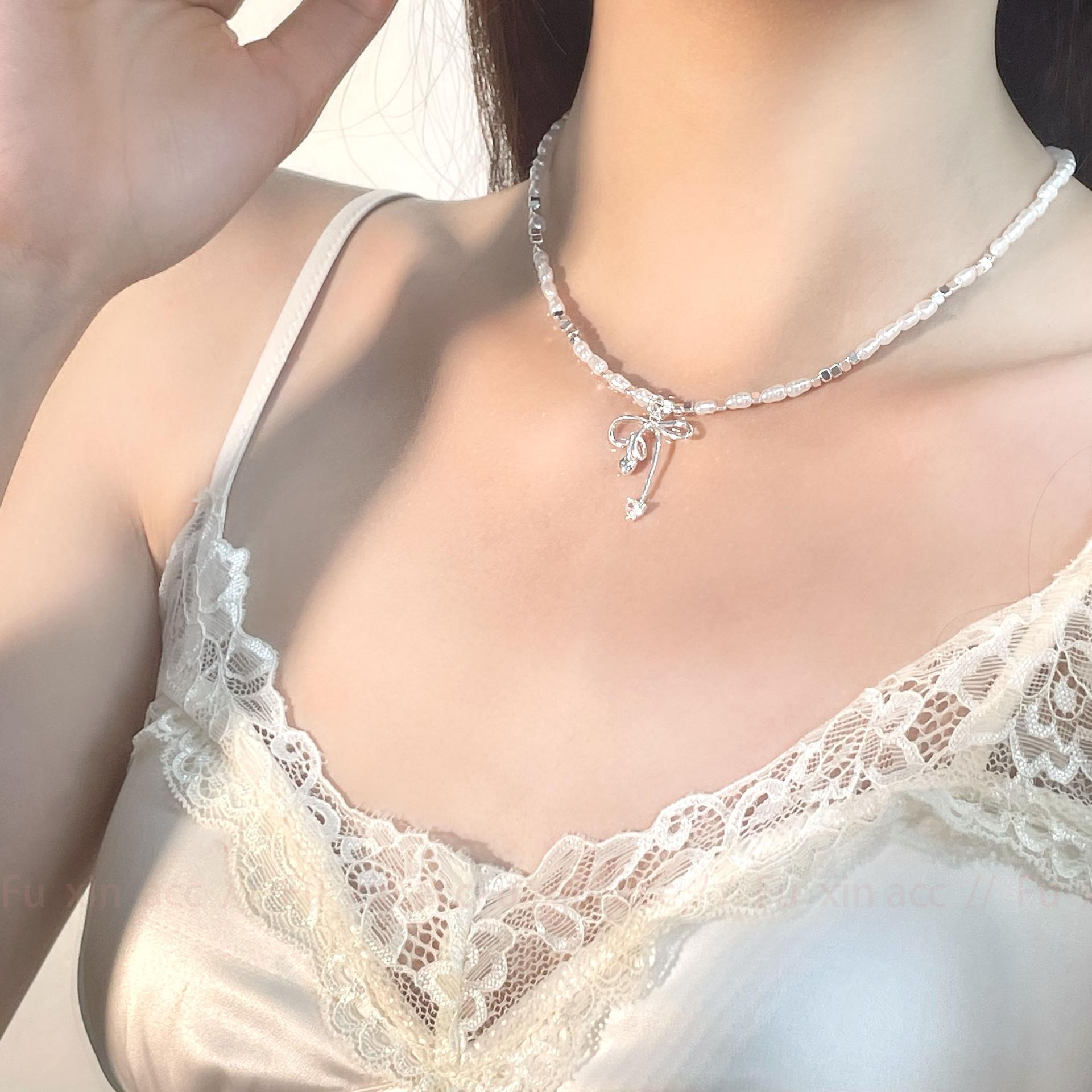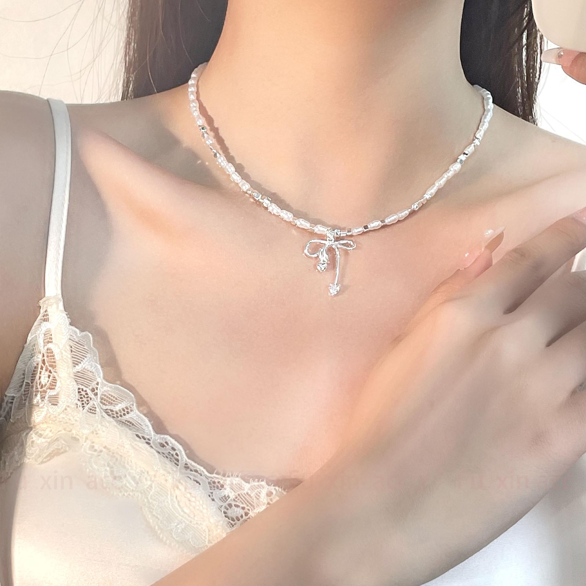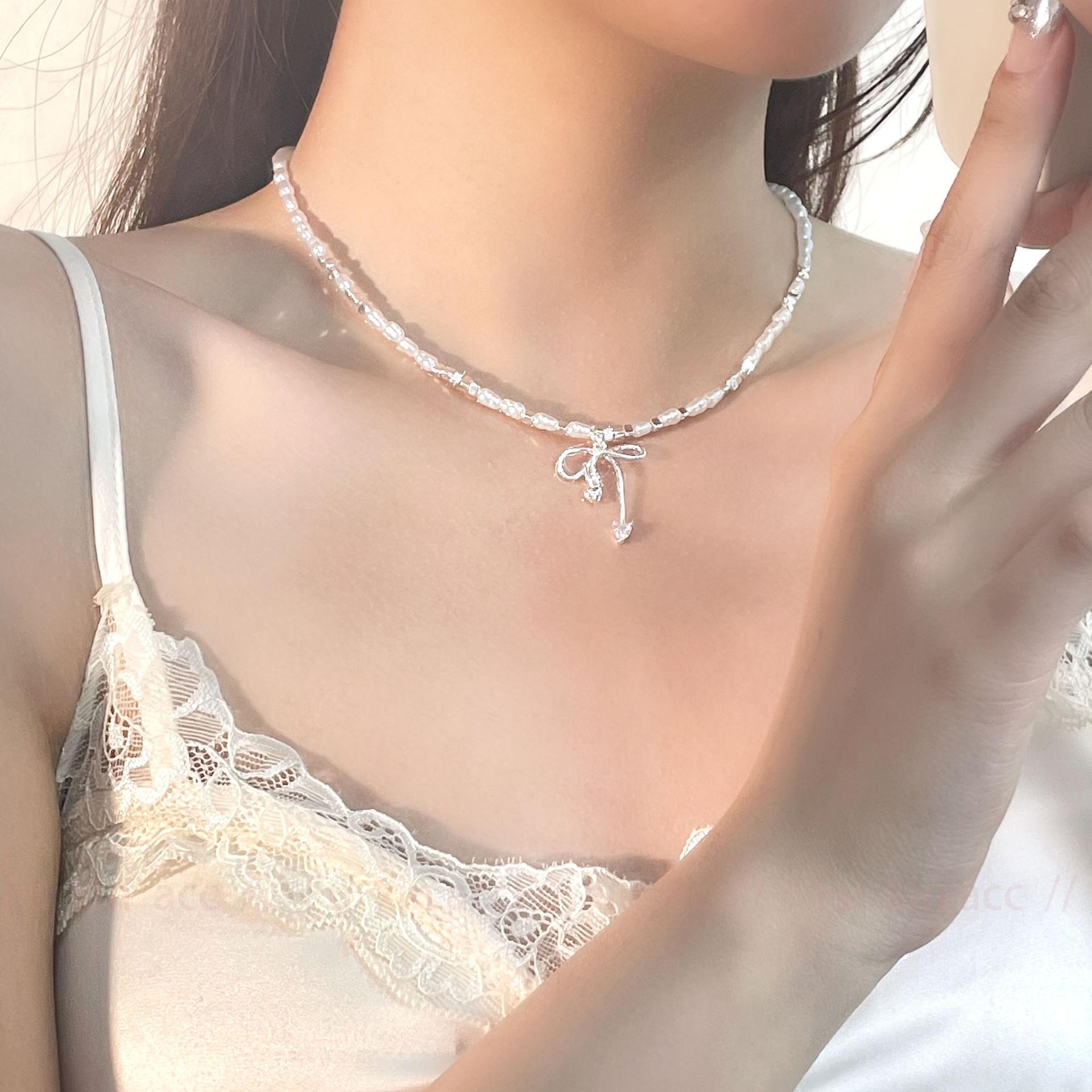 Verano fresco y dulce industria pesada plata rota perla lazo collar para mujer diseño simple de lujo ligero exquisita cadena para clavícula
