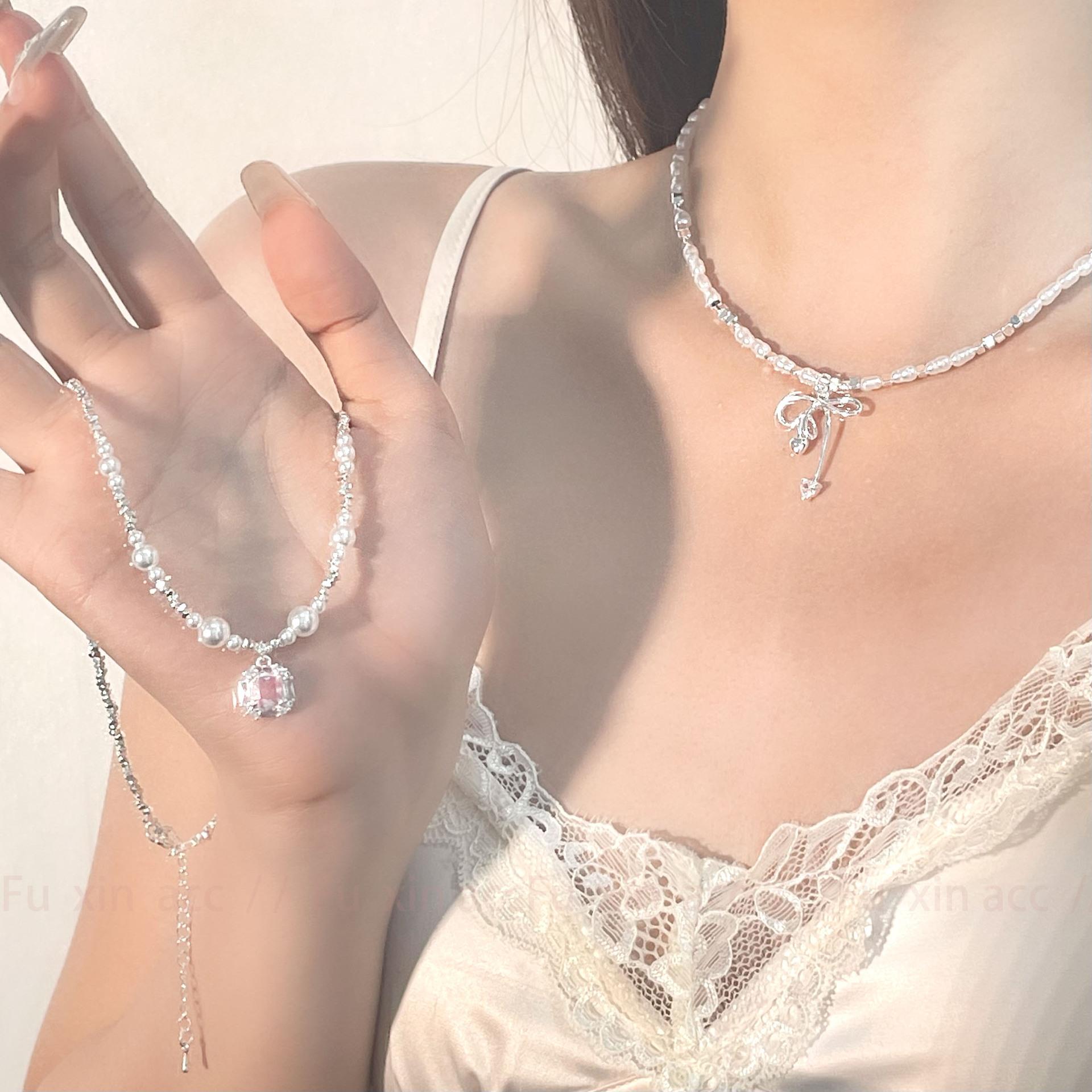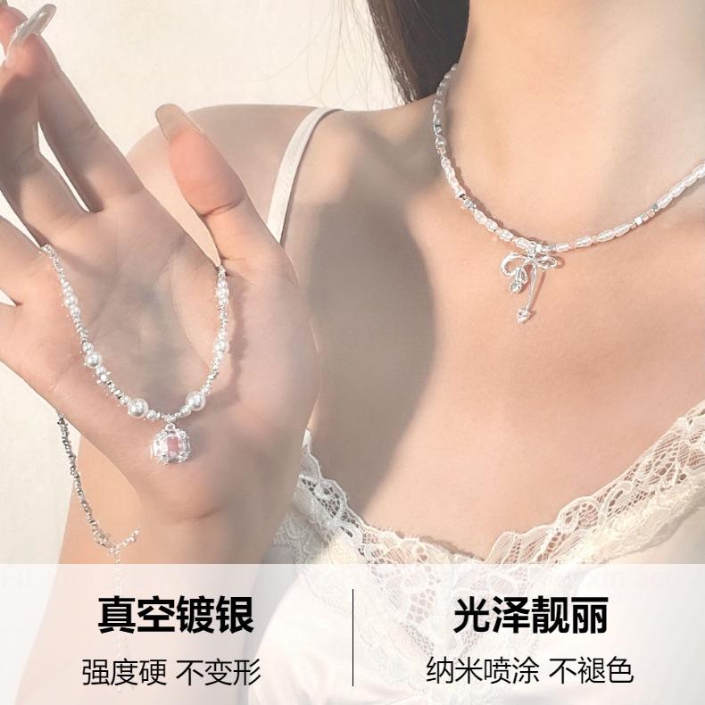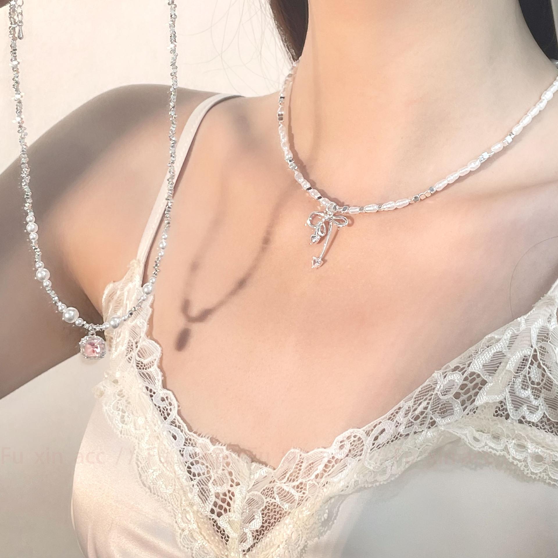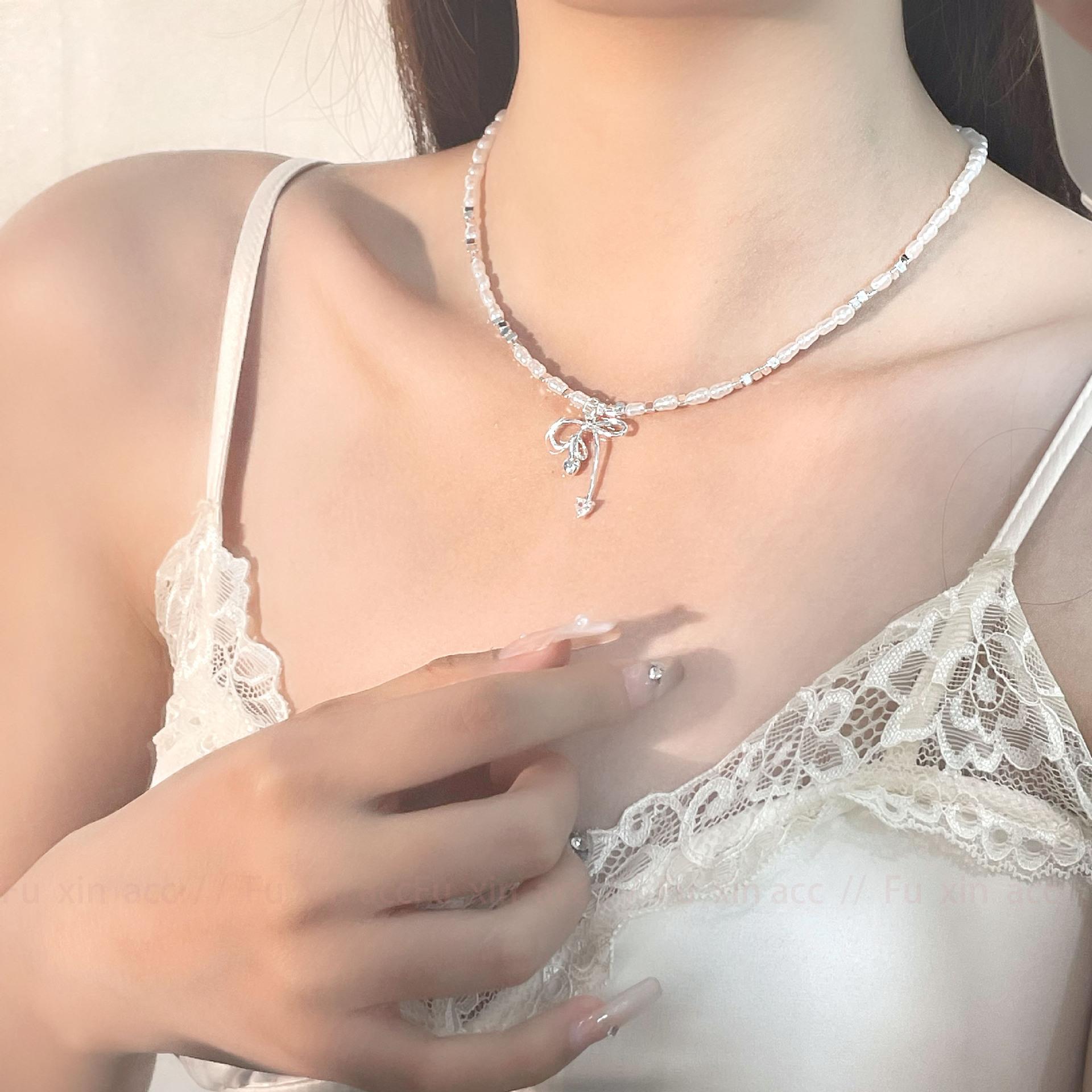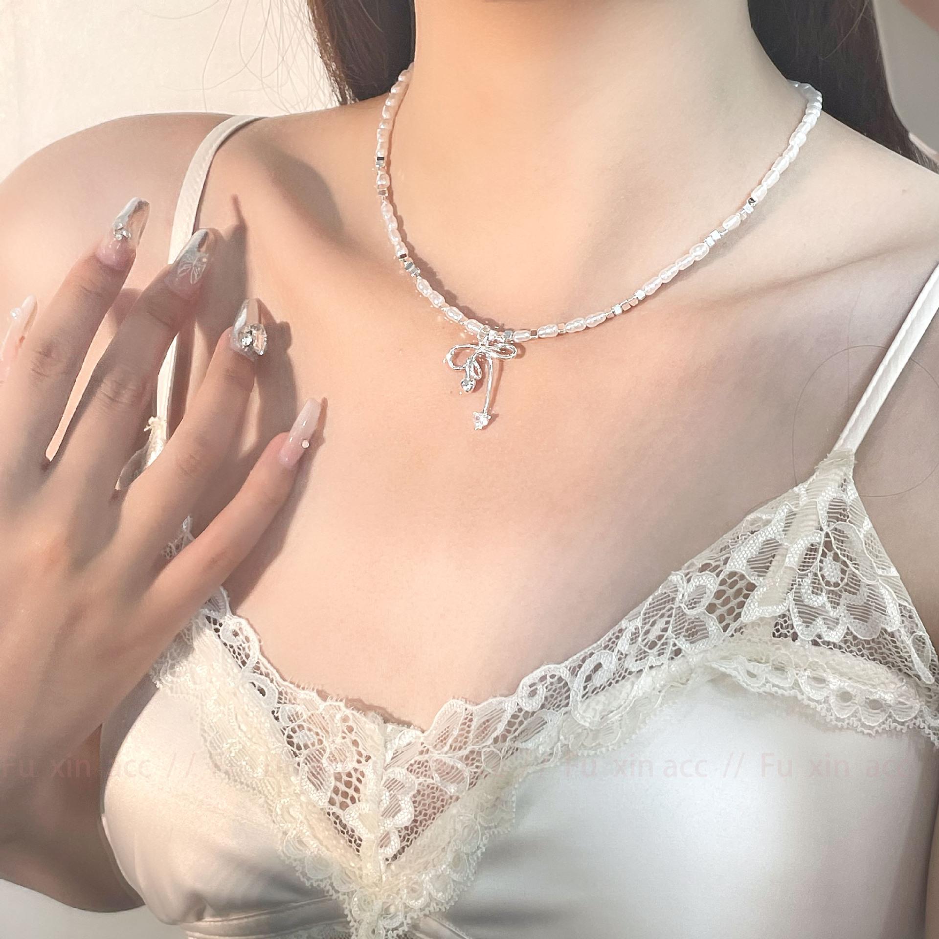 Verano fresco y dulce industria pesada plata rota perla lazo collar para mujer diseño simple de lujo ligero exquisita cadena para clavícula