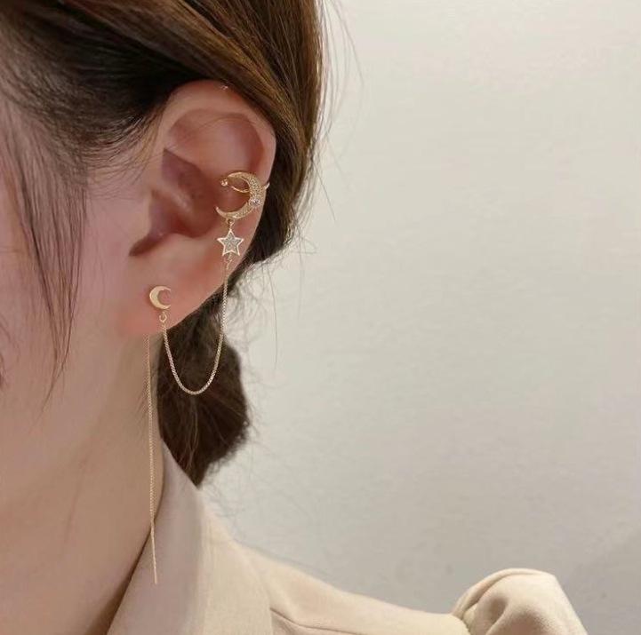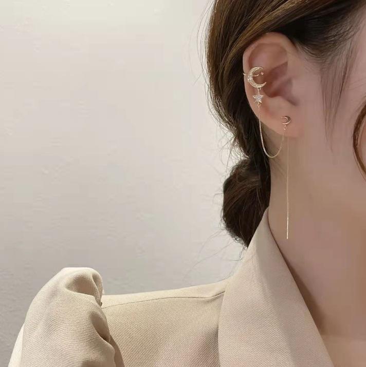 Pendientes de clip con forma de estrella y luna para mujer, sencillos y a la moda, con borlas largas, elegantes y personalizados, combinables con todo.