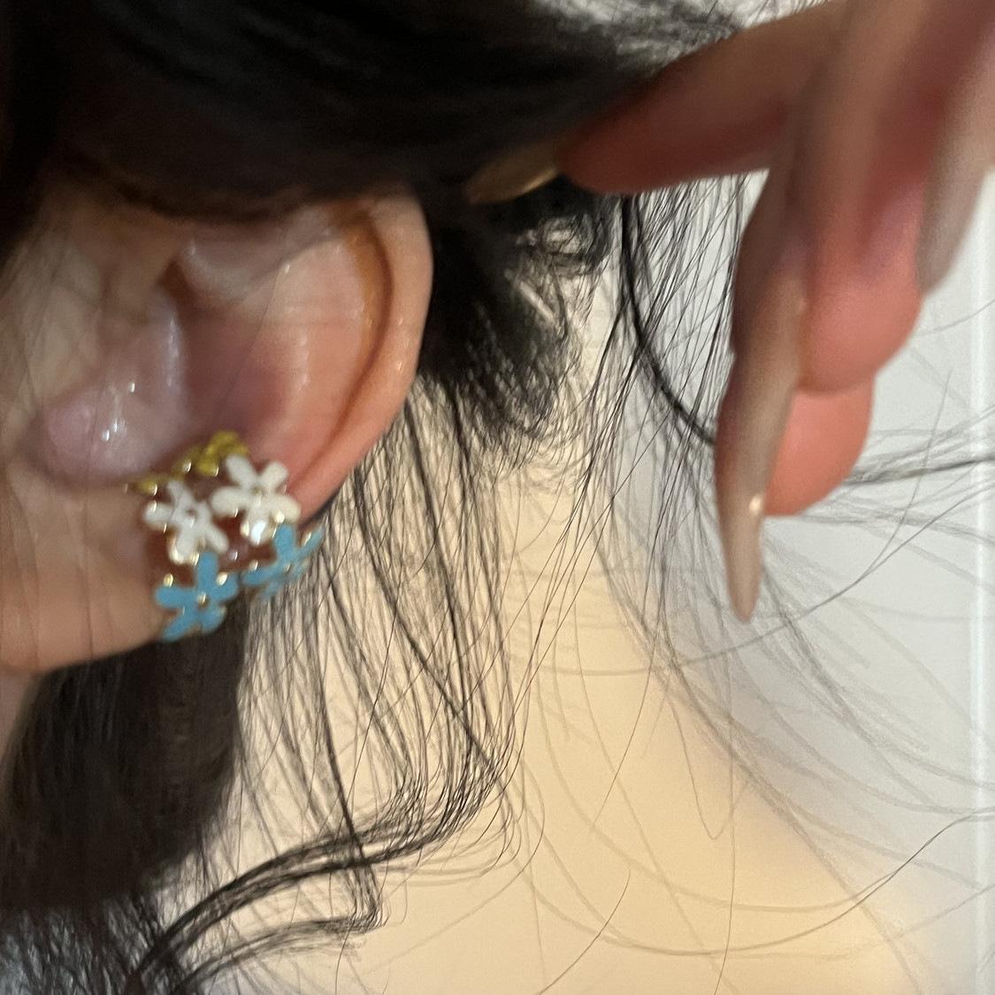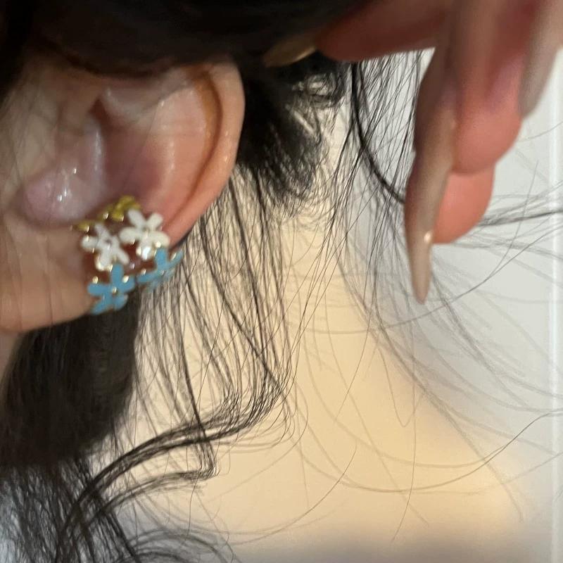 A pair of blue, white and yellow colored dripping glaze flower ear clips