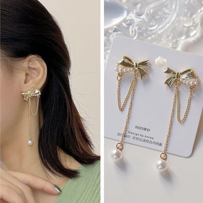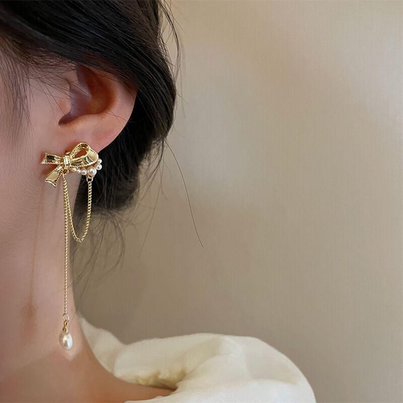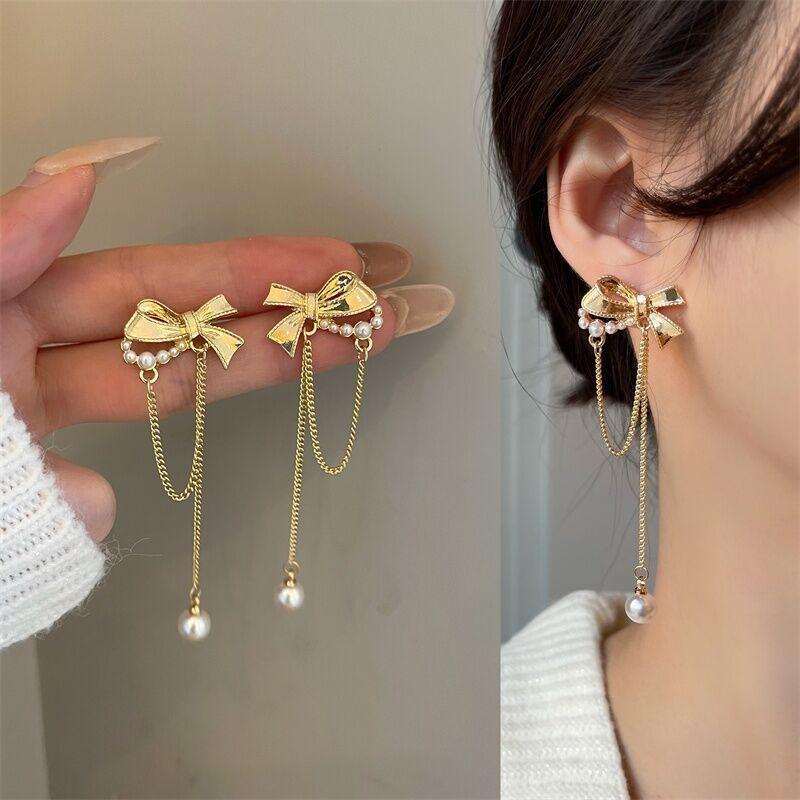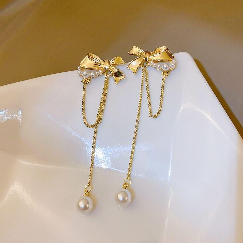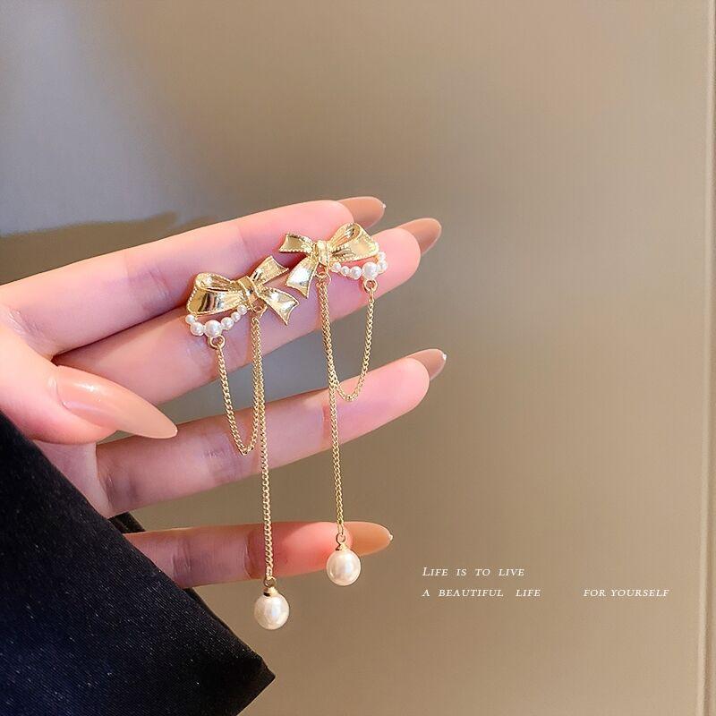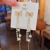 Pendientes elegantes franceses con lazo de perla, largos y ligeros con borlas, de lujo, novedad 2022 para mujer