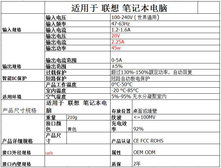 Adaptador de corriente para portátil de 45 W Adecuado para cargador de portátil Lenovo 20V2.25A Puerto USB Cuadrado