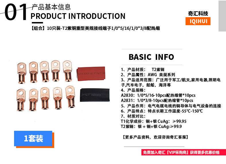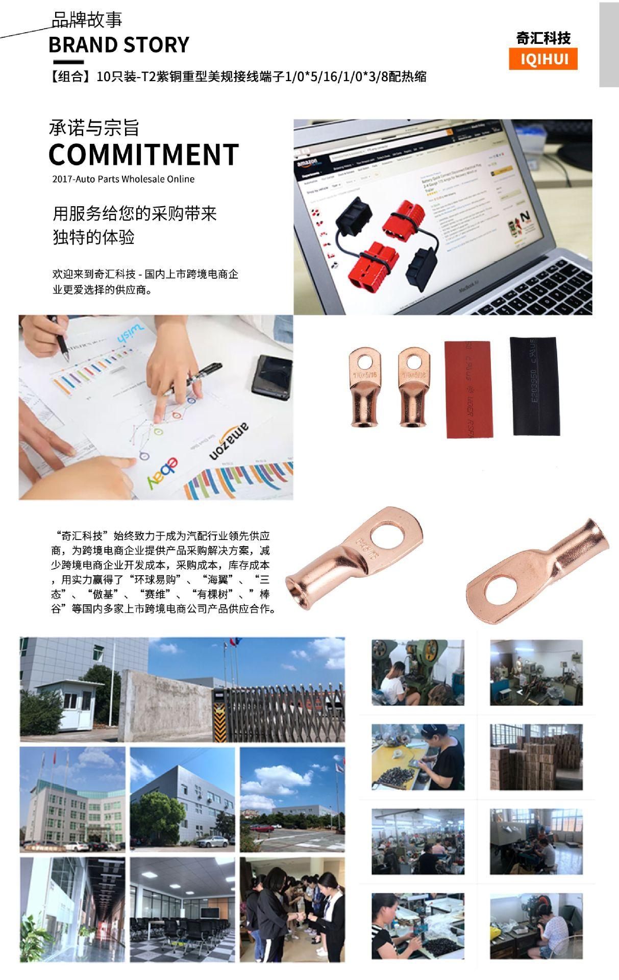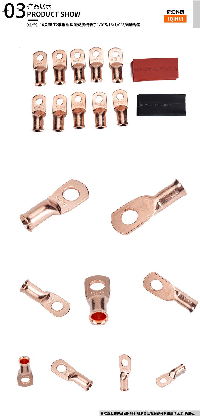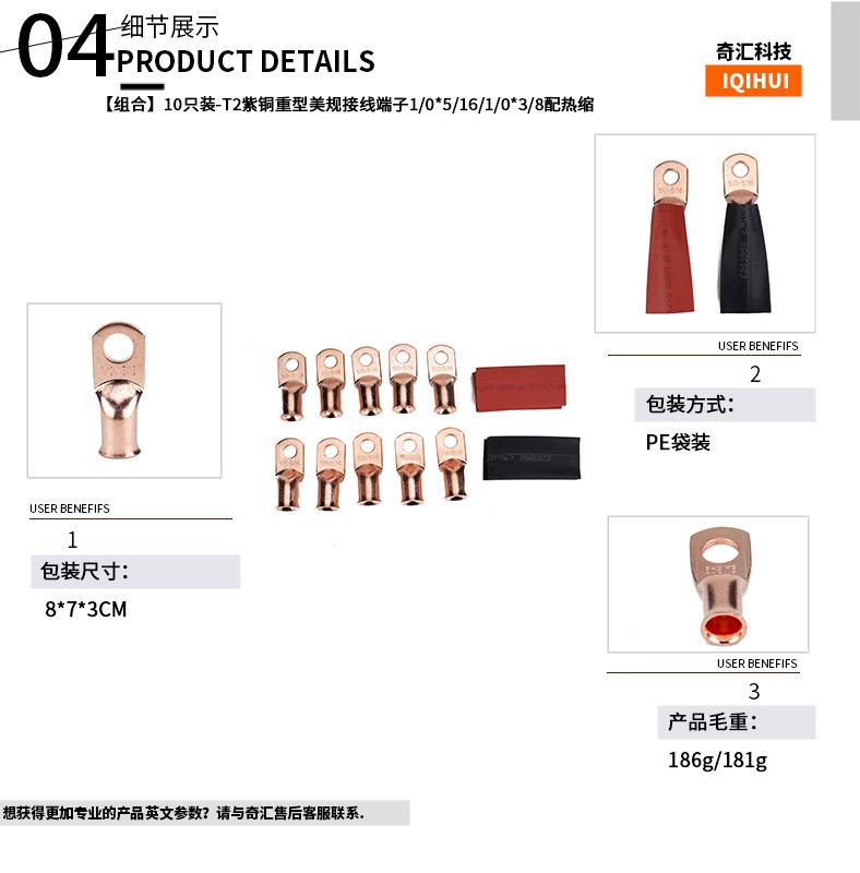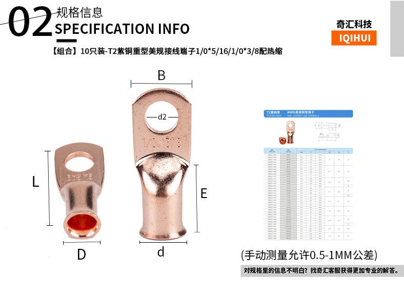 Paquete de 10 Terminales de Cobre T2 Estándar Americano Awg de Venta Caliente Transfronteriza para Trabajo Pesado Prensado en Frío con Tubo Termorretráctil Aislado