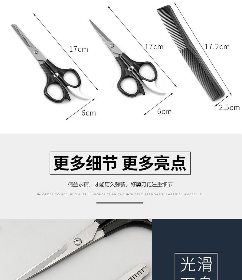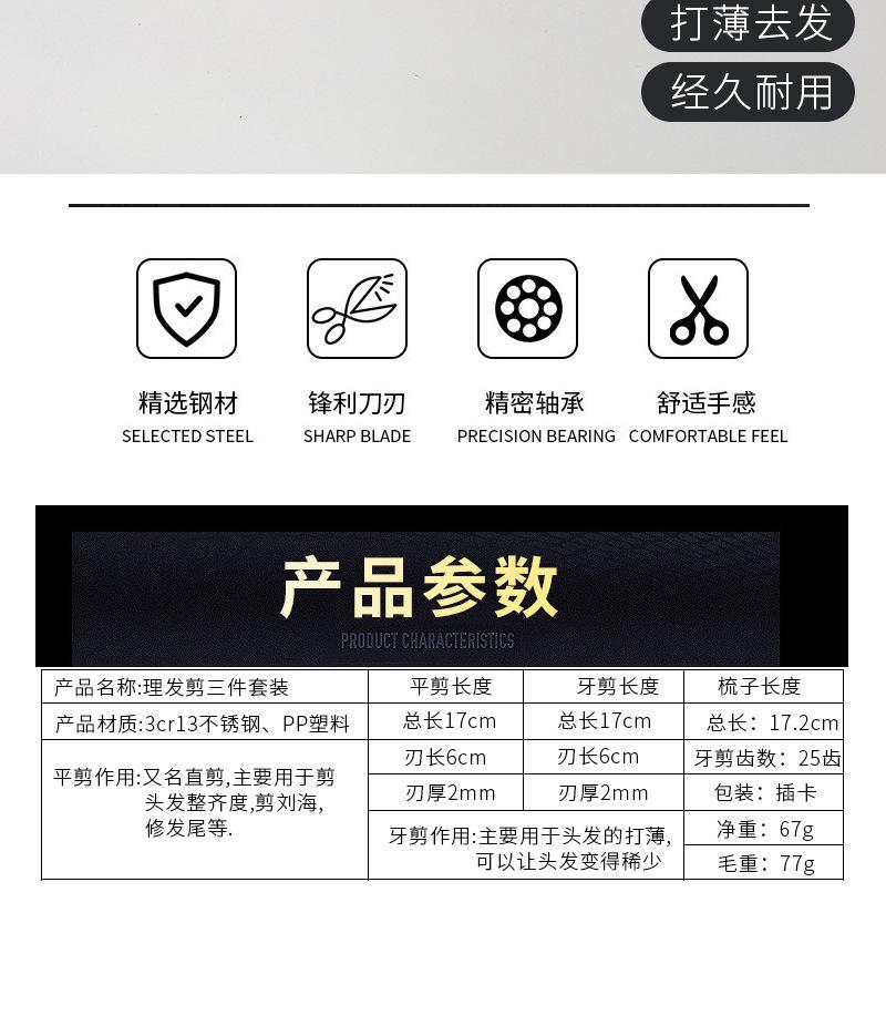 Nombre del producto: Set de tres piezas de cortapelos Modelo: PH62 Uso del producto: Cortar el cabello, recortar el flequillo, recortar las puntas del cabello, etc. Material: acero inoxidable + PP Tamaño: Tijeras planas 17*6cm, Tijeras de entresacar 17*6cm, Peine 17.2*2.5cm Espesor: Cizalla plana 2 mm Cizalla dentada 2 mm Peso neto: 67g Embalaje: bolsa opp/cartón Caja exterior (Cartón) Tamaño de la caja: Peso por caja: Observaciones Características: Hoja afilada, mango exquisito (fácil de limpiar) |