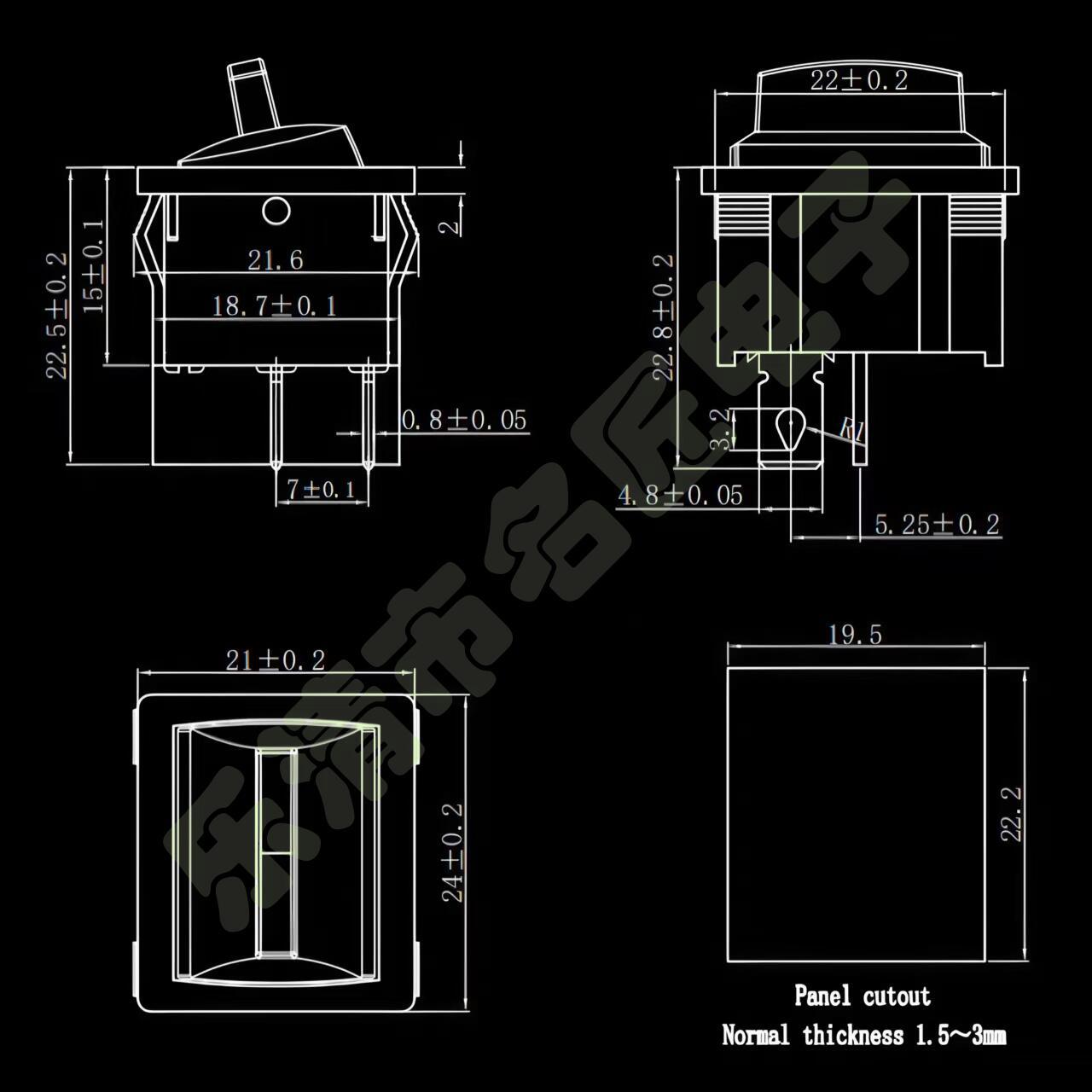 Interruptor basculante de palanca cuadrada KCD5 21 * 24 mm interruptor basculante cuadrado interruptor basculante de 2 patas