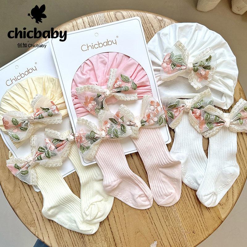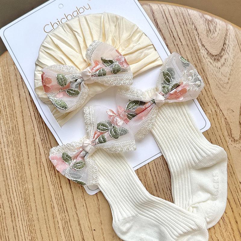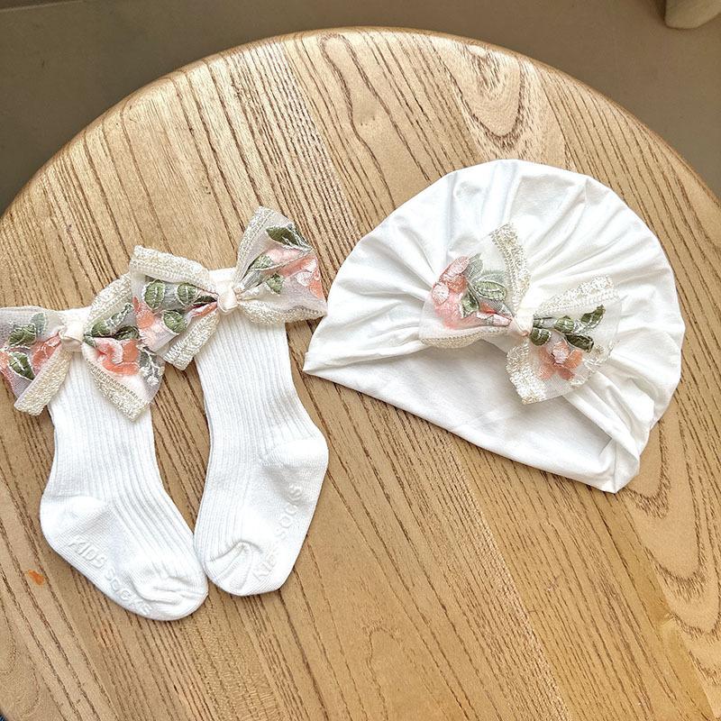 50 milk white brocade embroidered yarn knotted hat + mid-length socks