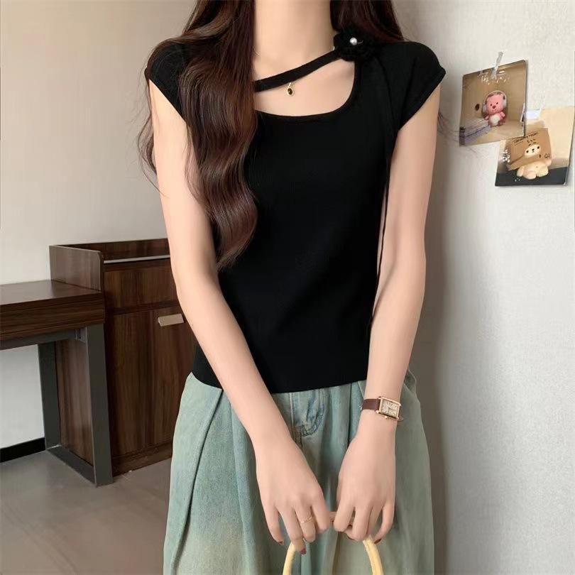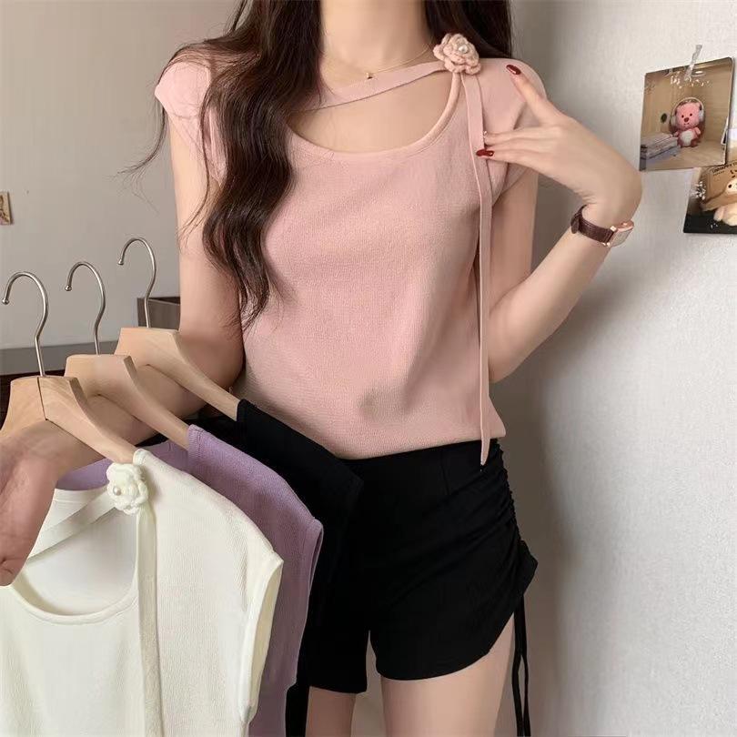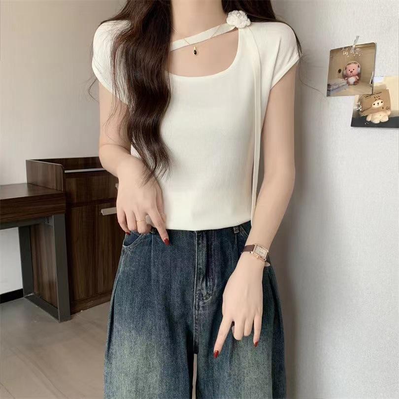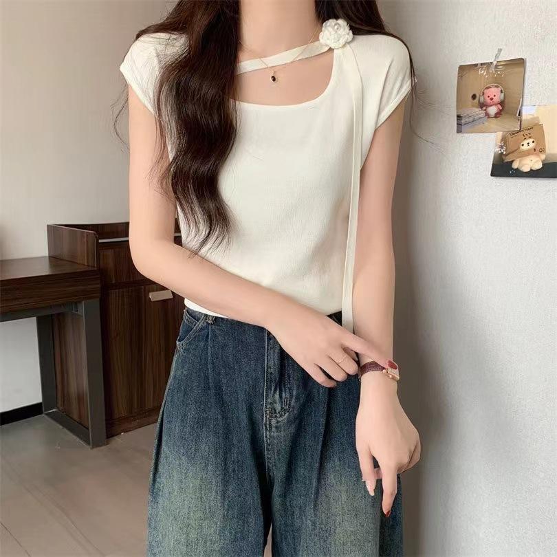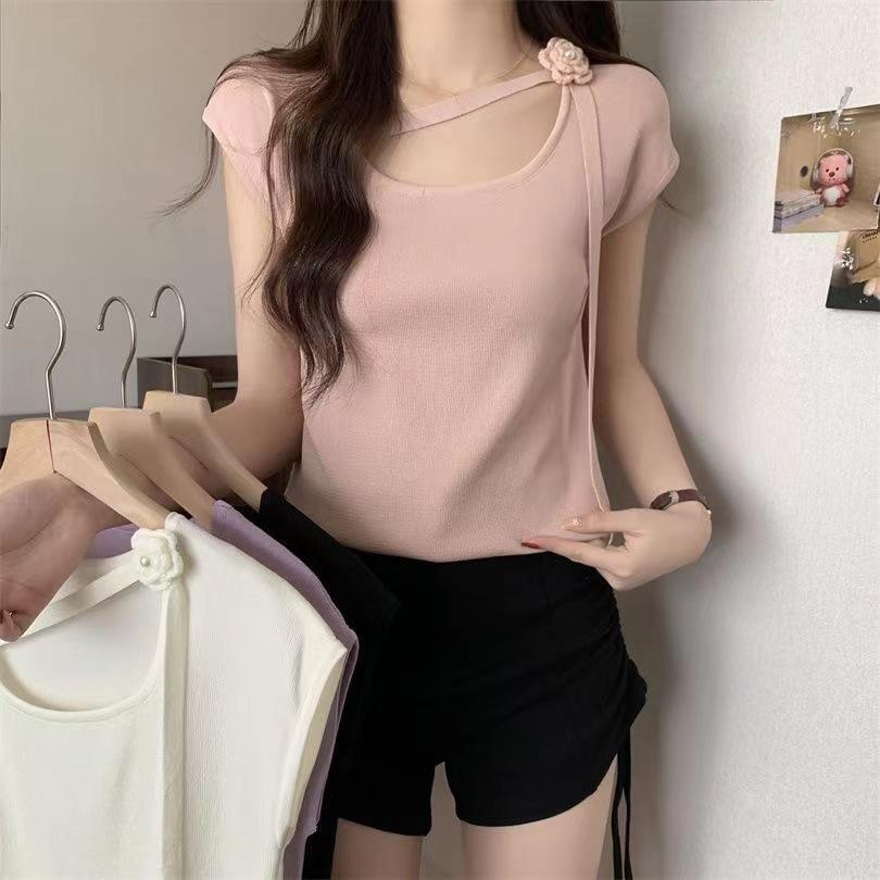 Camiseta de punto con flores tridimensionales para mujer, diseño de nicho de verano, corte entallado, camisa adelgazante, cuello cuadrado, manga corta, top dulce