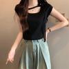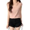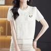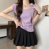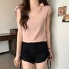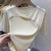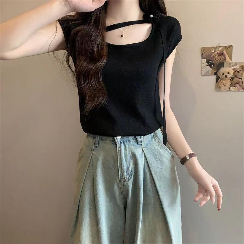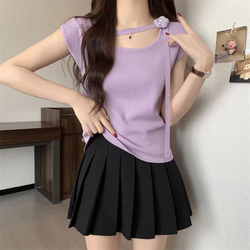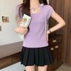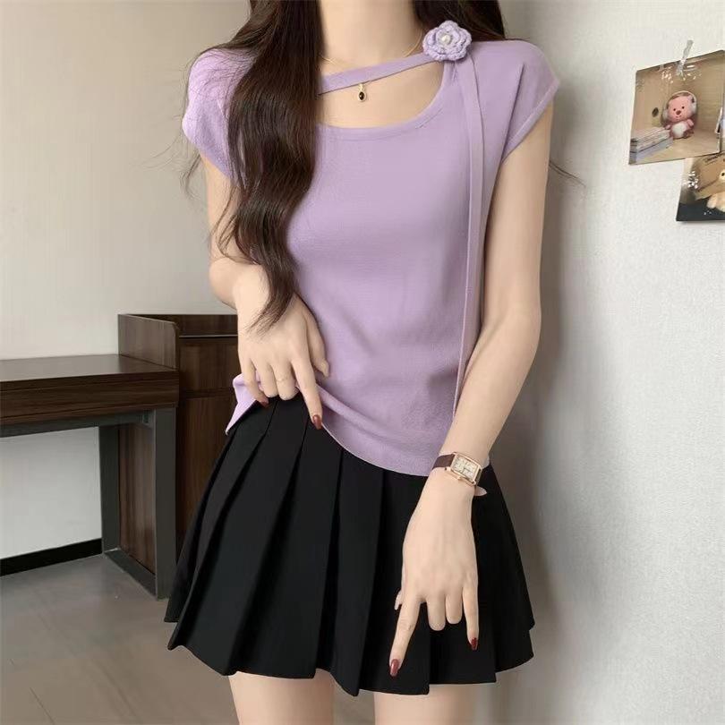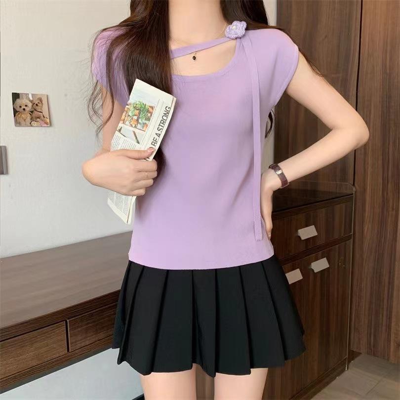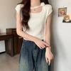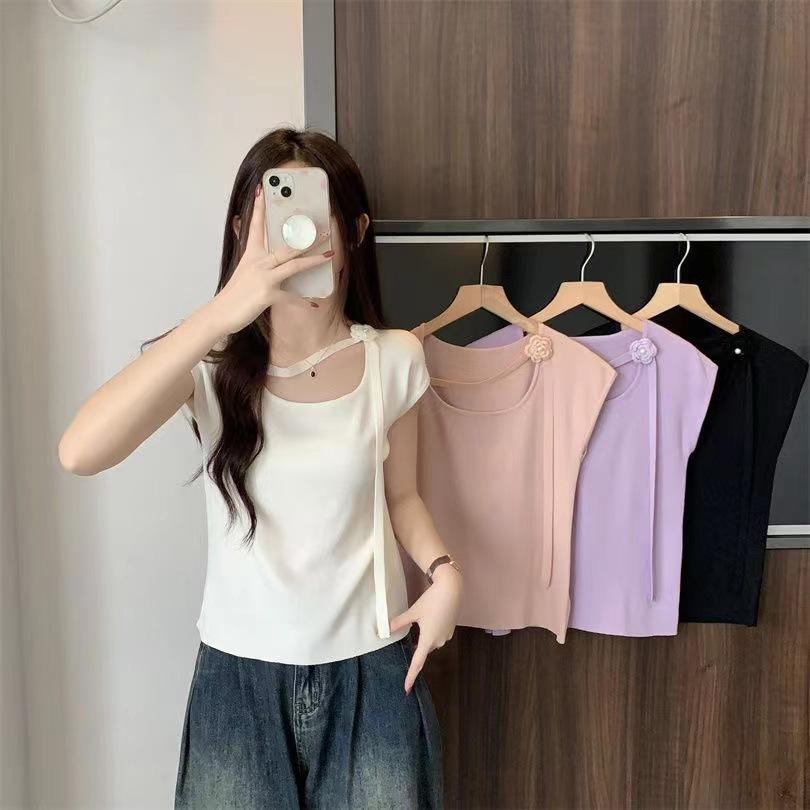 Camiseta de punto con flores tridimensionales para mujer, diseño de nicho de verano, corte entallado, camisa adelgazante, cuello cuadrado, manga corta, top dulce