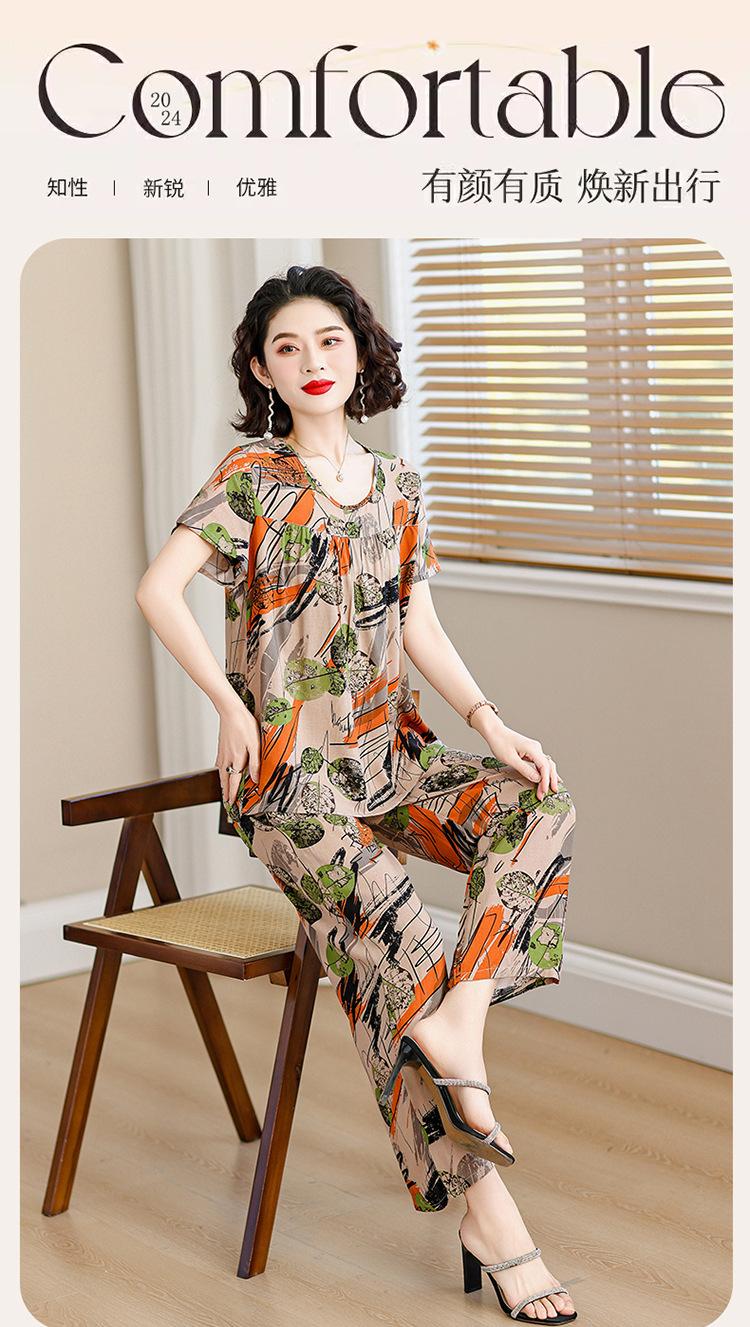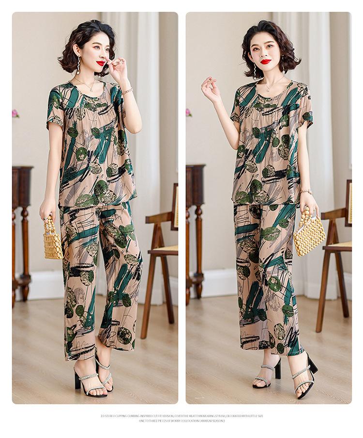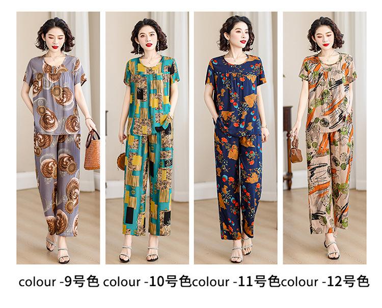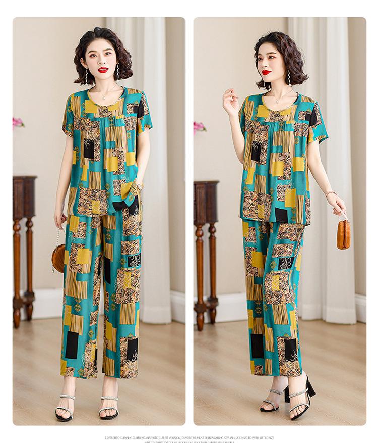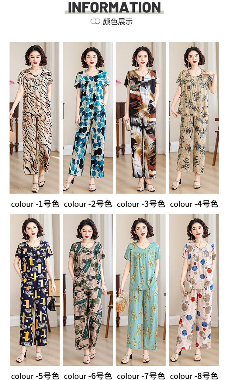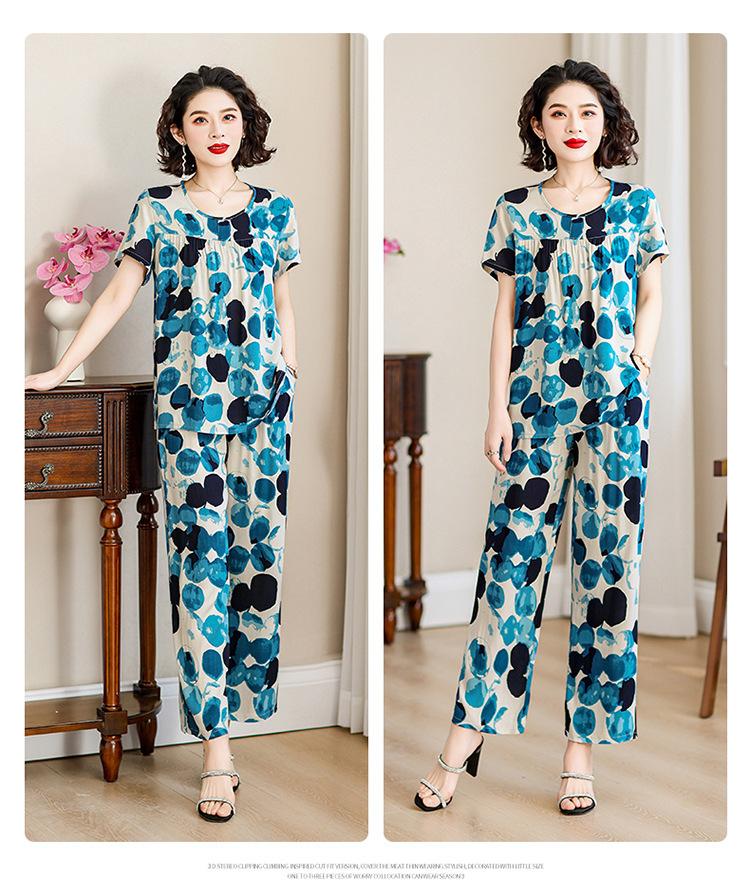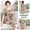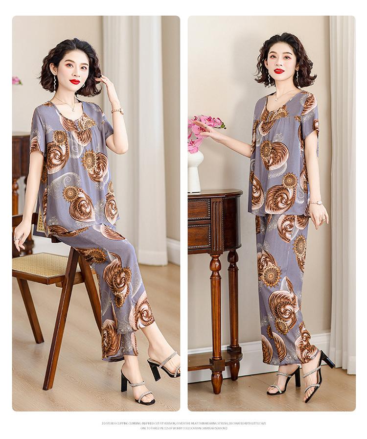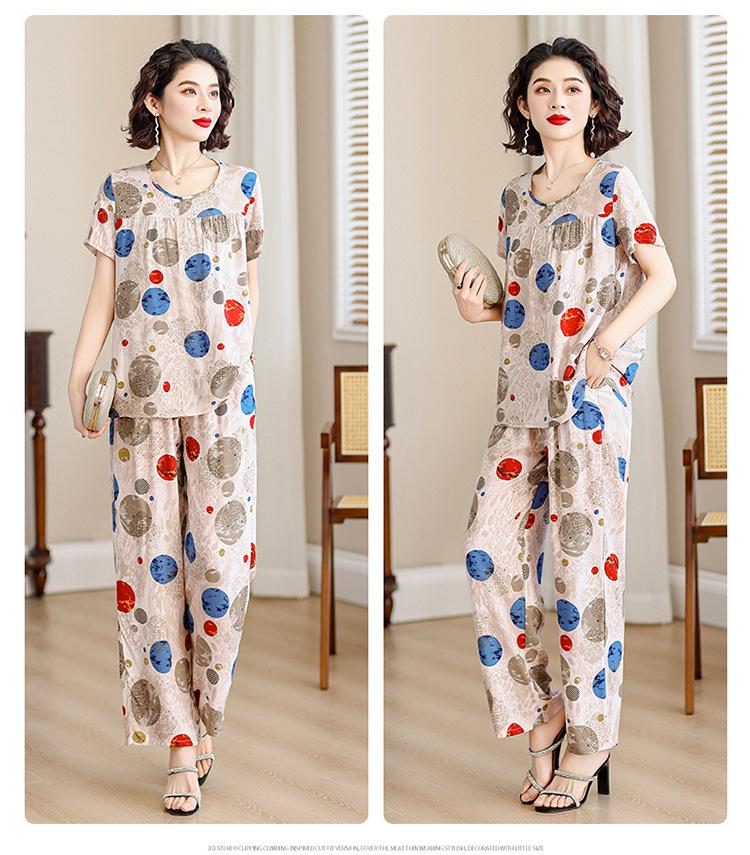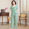 Top de Algodón Seda para Mamá Nueva Verano Edad Media y Anciana Traje de Abuela para Mujer Talla Grande Playera de Manga Corta Estampada Conjunto de Dos Piezas