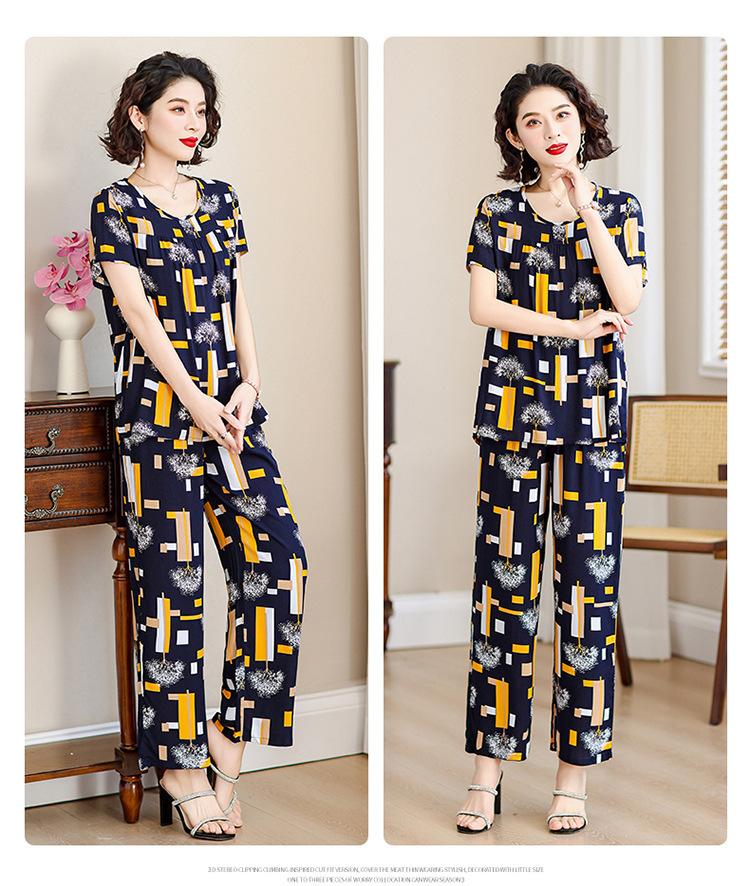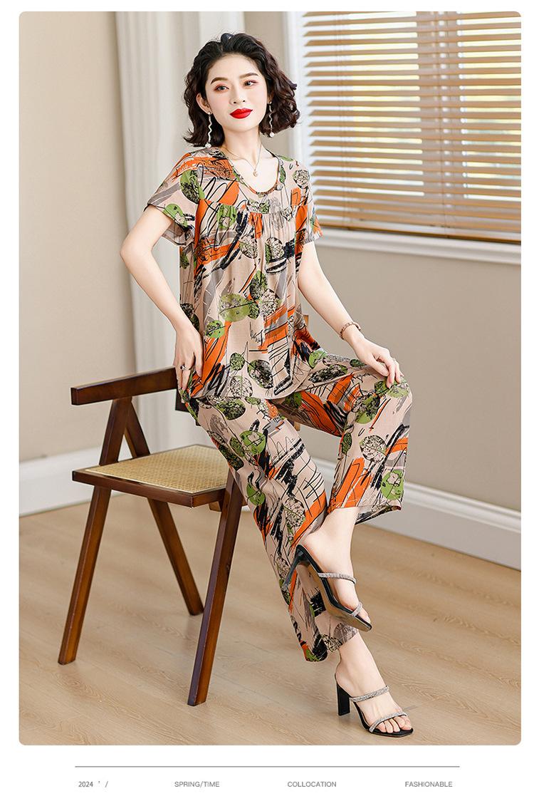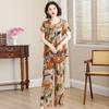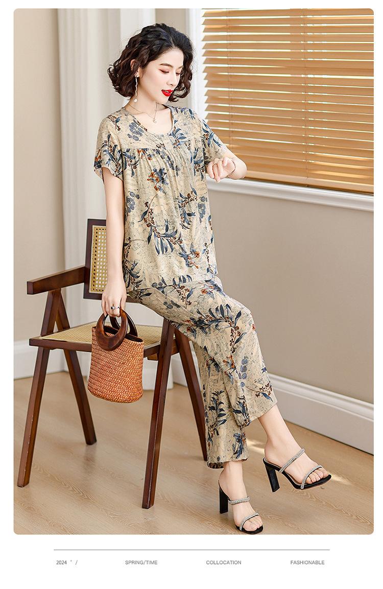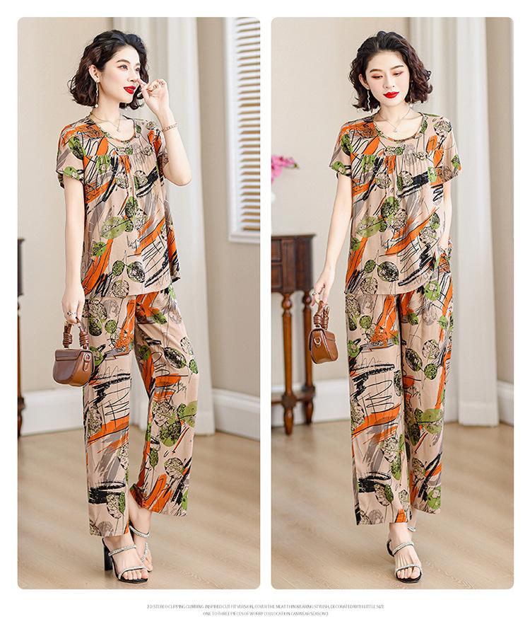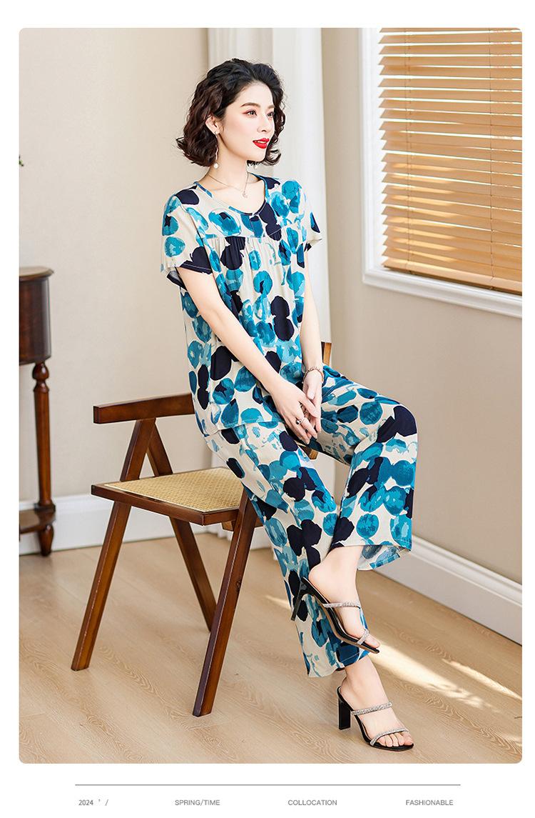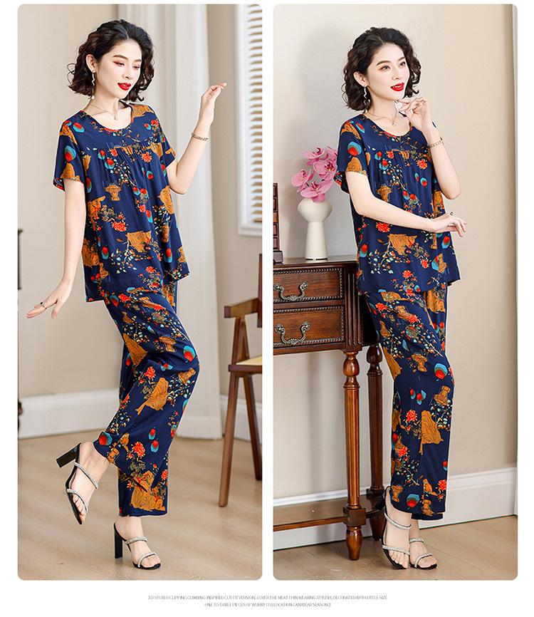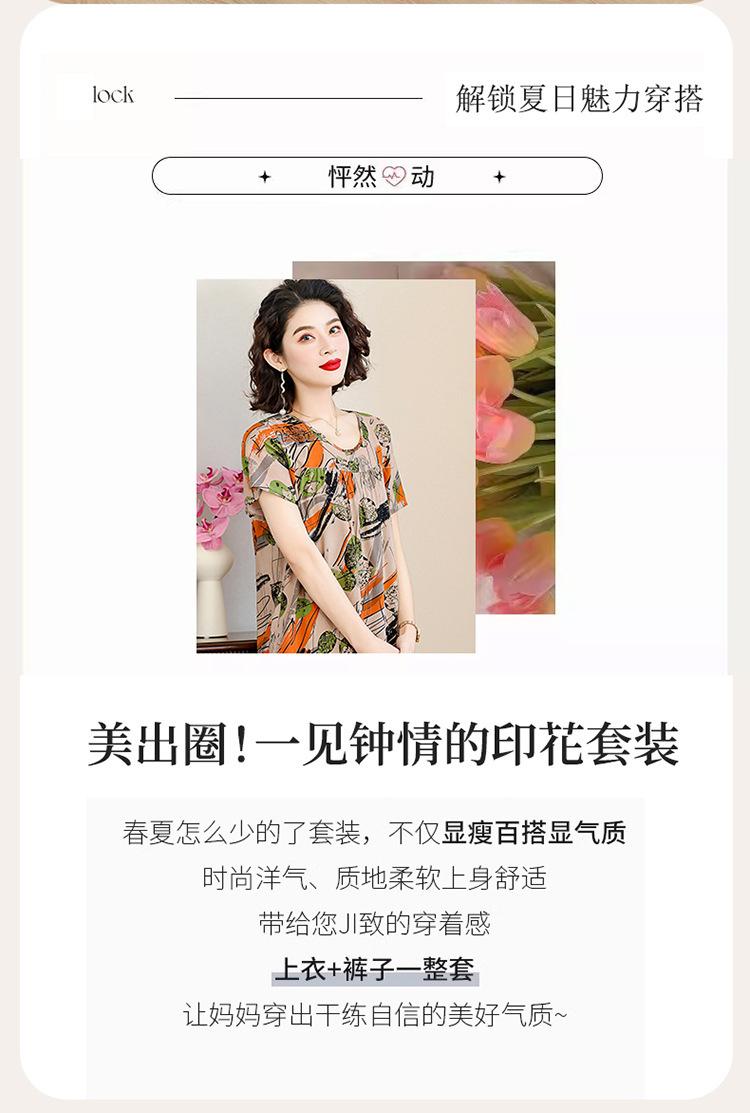 Top de Algodón Seda para Mamá Nueva Verano Edad Media y Anciana Traje de Abuela para Mujer Talla Grande Playera de Manga Corta Estampada Conjunto de Dos Piezas