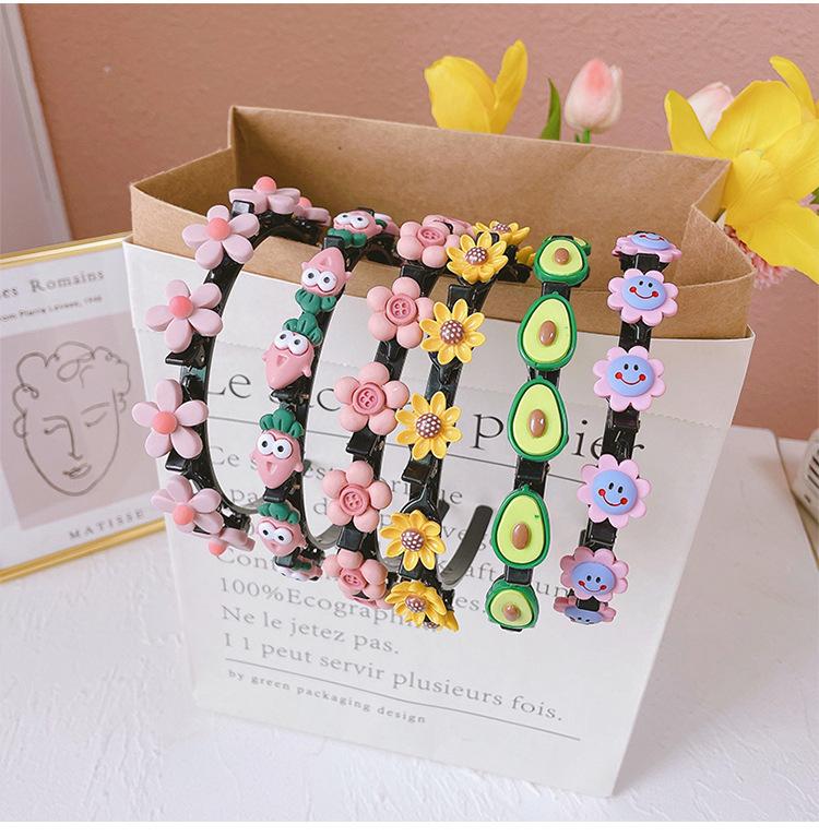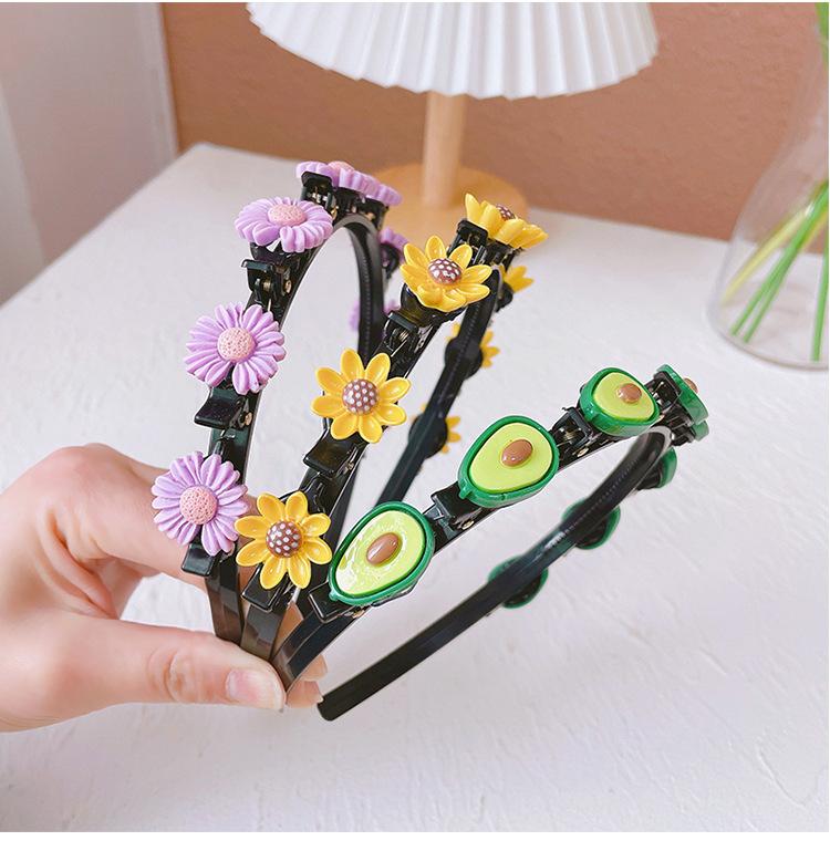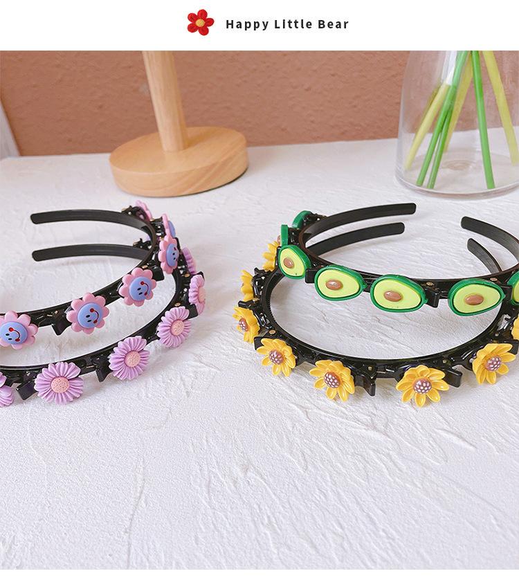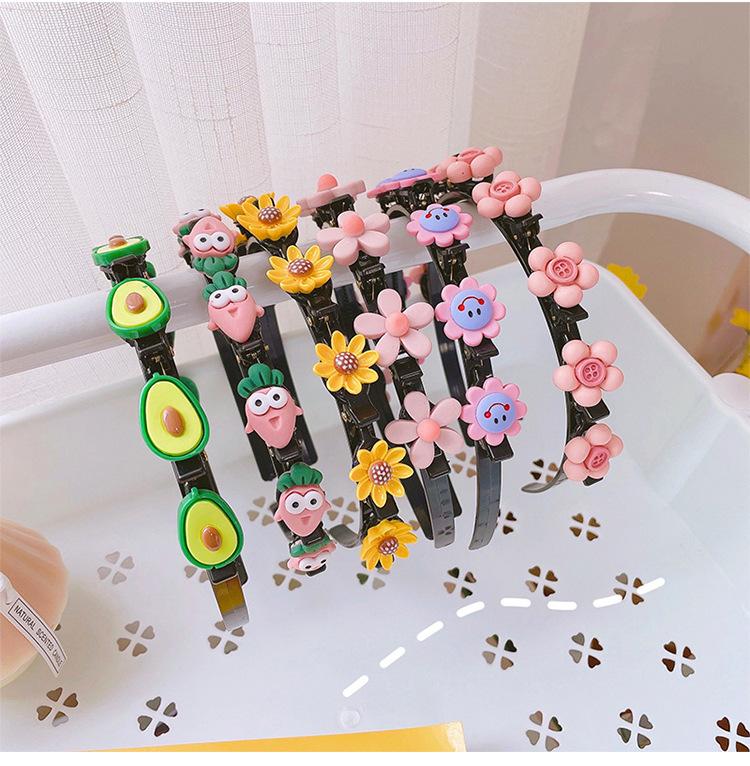 8568A Yellow Sunflower Headband, 8568B avocado headband, 8568C pink button flower headband, 8568D radish hairb...