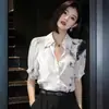 Blusa de seda de tinta para mujer, diseño elegante, estilo nicho, de verano, de manga corta, holgada, con mangas abullonadas, estilo retro.