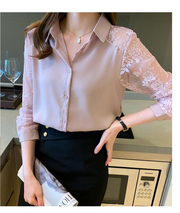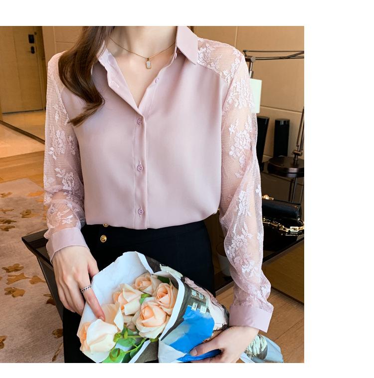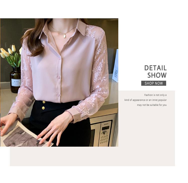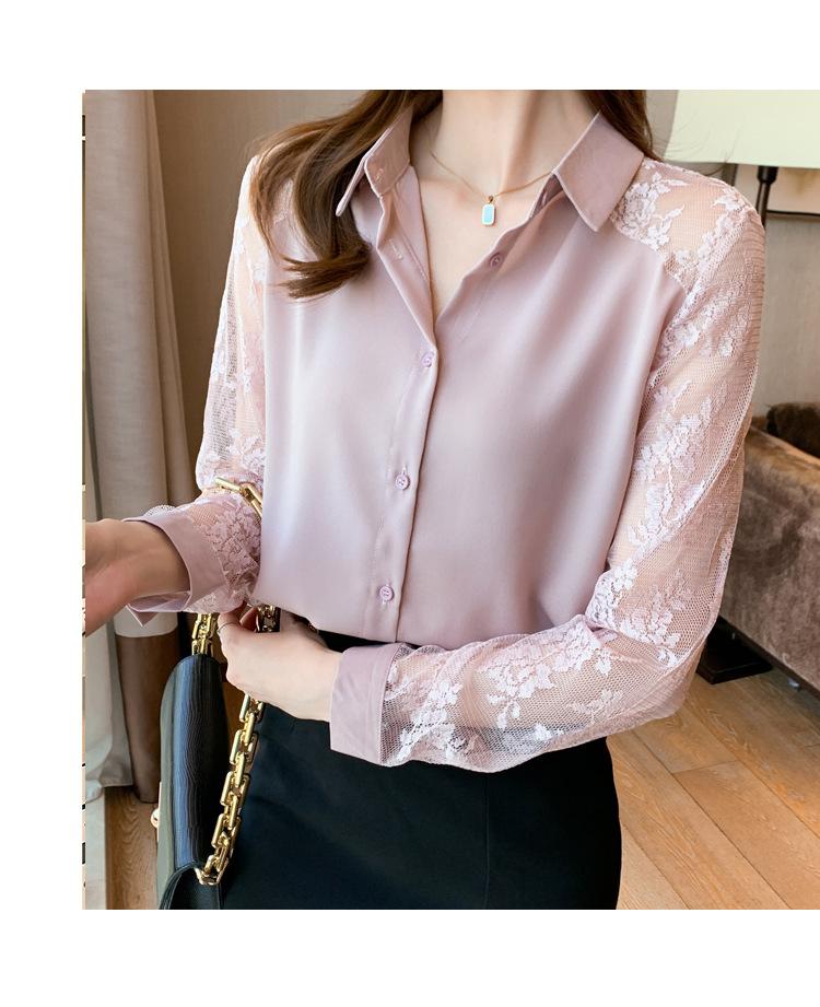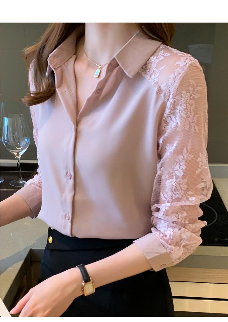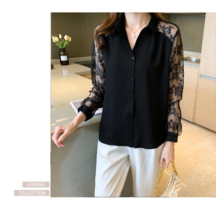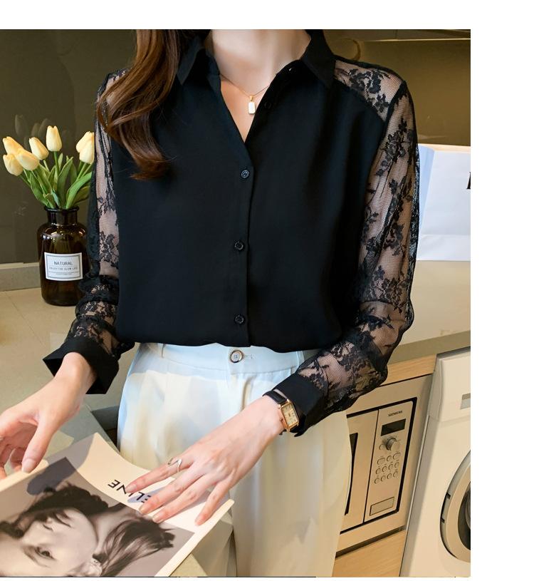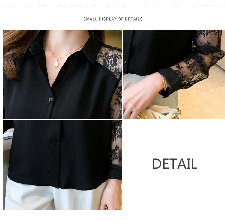 Foto Real de Camisas Tops de Gasa con Encaje en Solapa Estilo Occidental para Mujer Primavera y Otoño 2025 Nueva Camisa Básica tipo Cárdigan