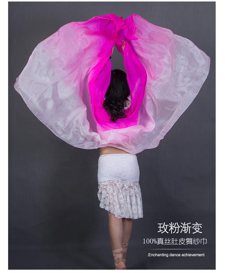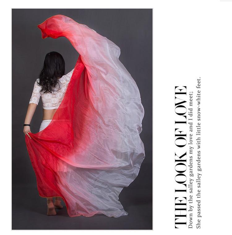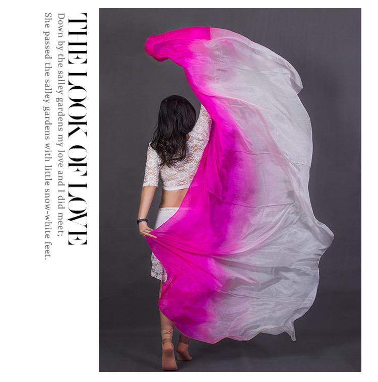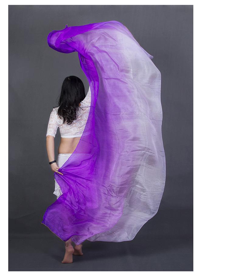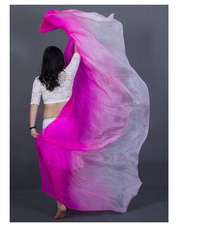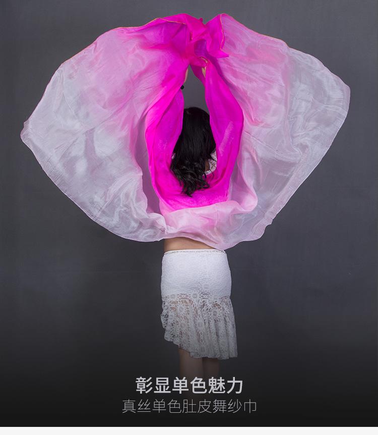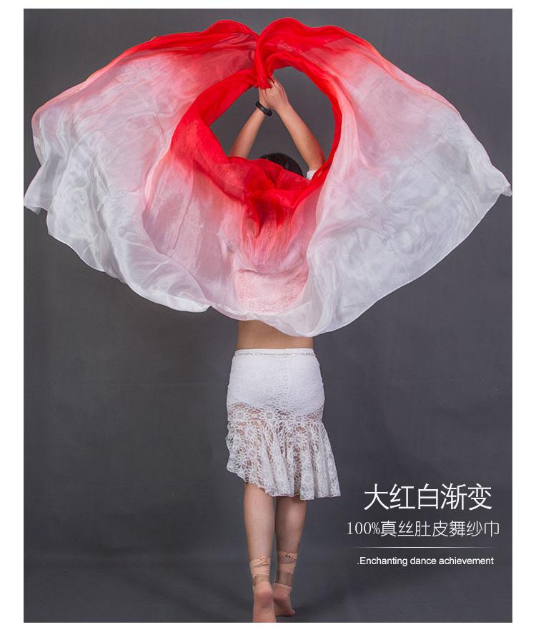 El velo de seda para danza del vientre está hecho de seda de alta calidad, que es delgada, suave y translúcida; se siente delicado y liso, lleno de elegancia, ligero y transparente, y de color brillante. Tiene un efecto visual elegante y dinámico, que es incomparable a los velos ordinarios de fibra química, chifón e imitación de seda.