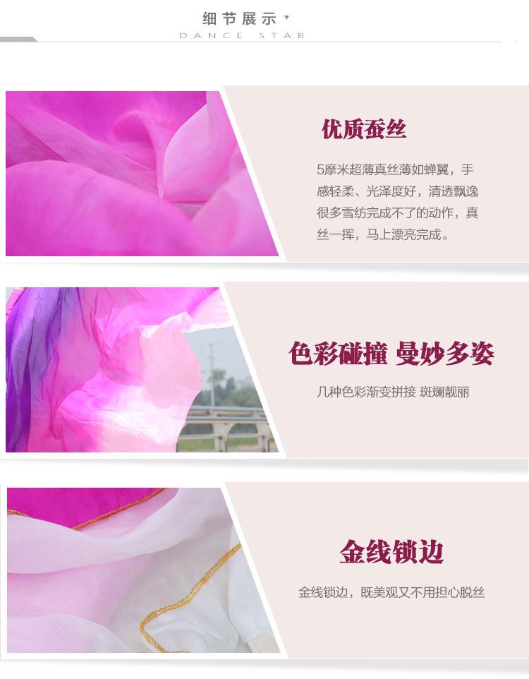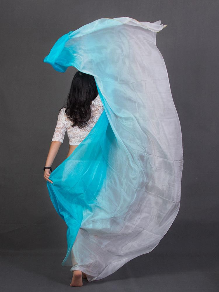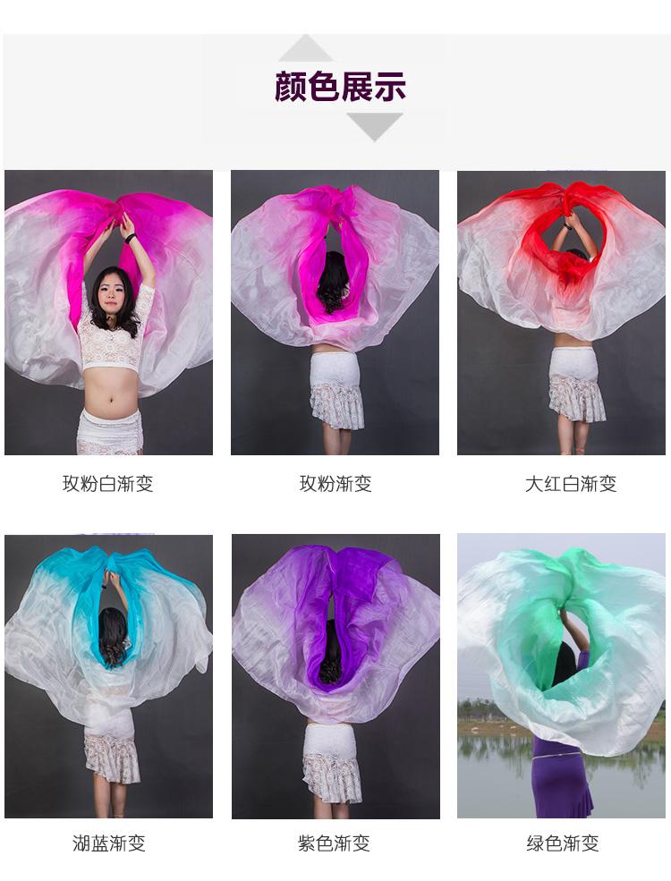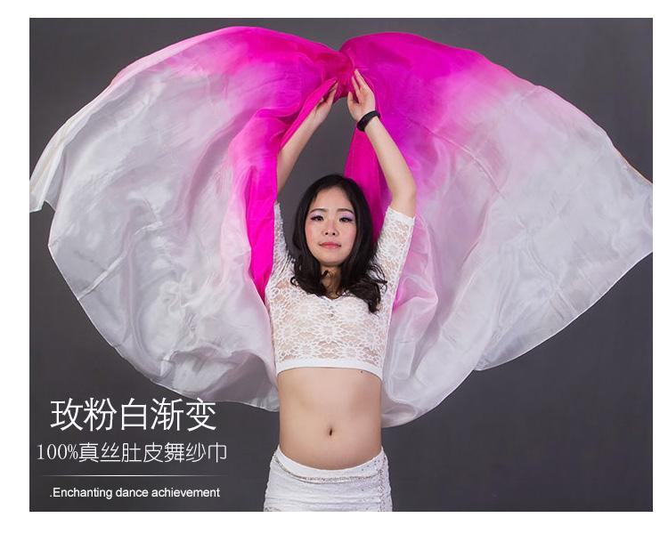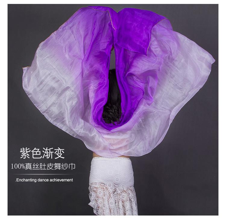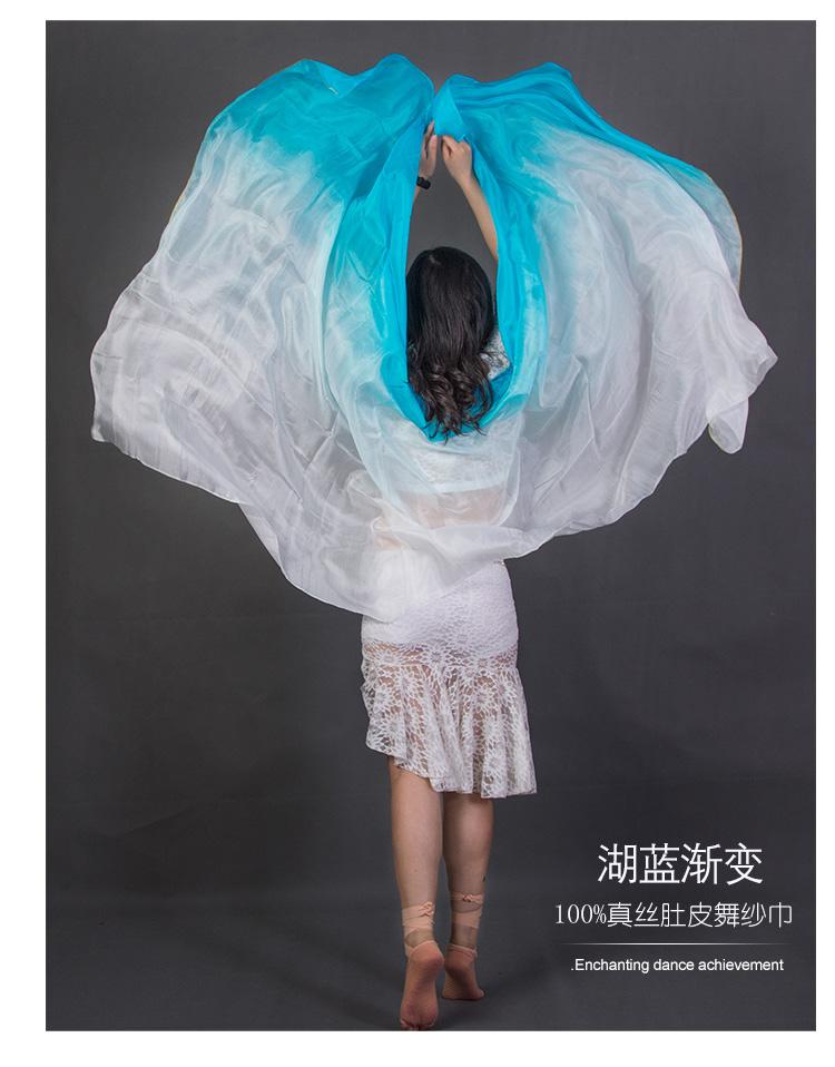 El velo de seda para danza del vientre está hecho de seda de alta calidad, que es delgada, suave y translúcida; se siente delicado y liso, lleno de elegancia, ligero y transparente, y de color brillante. Tiene un efecto visual elegante y dinámico, que es incomparable a los velos ordinarios de fibra química, chifón e imitación de seda.