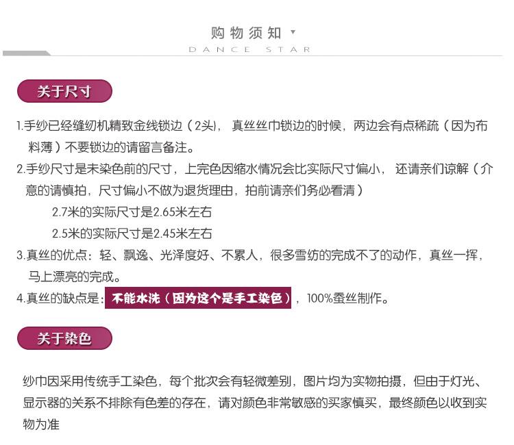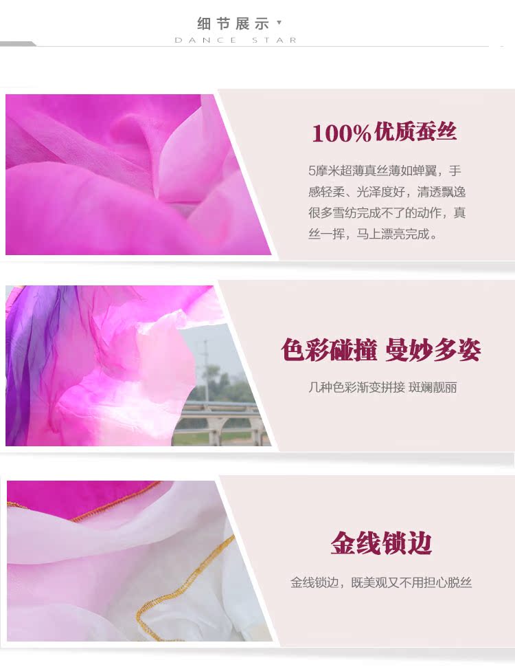 La seda es tan fina como el ala de una cigarra, suave al tacto, clara y elegante; pero también es relativamente delicada, y no se puede lavar con agua. Se decolora fácilmente cuando se lava con agua. Si se mancha accidentalmente con lluvia, extiéndala y séquela a tiempo.