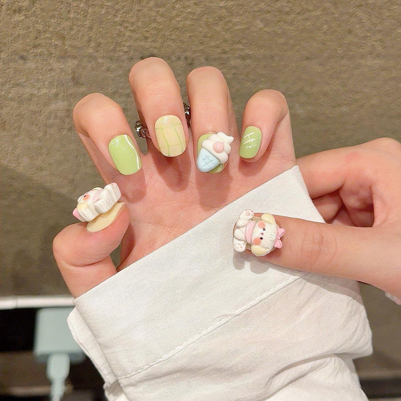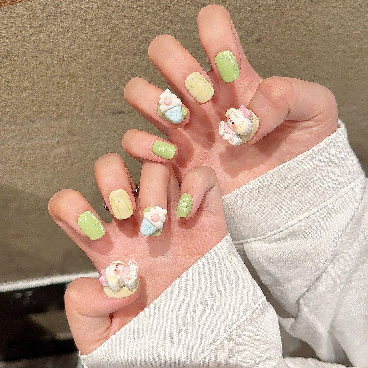 Yihe uñas postizas cortas lindas hechas a mano puras, pintadas a mano puras, caricatura tridimensional, arte de uñas para adultos, traje terminado
