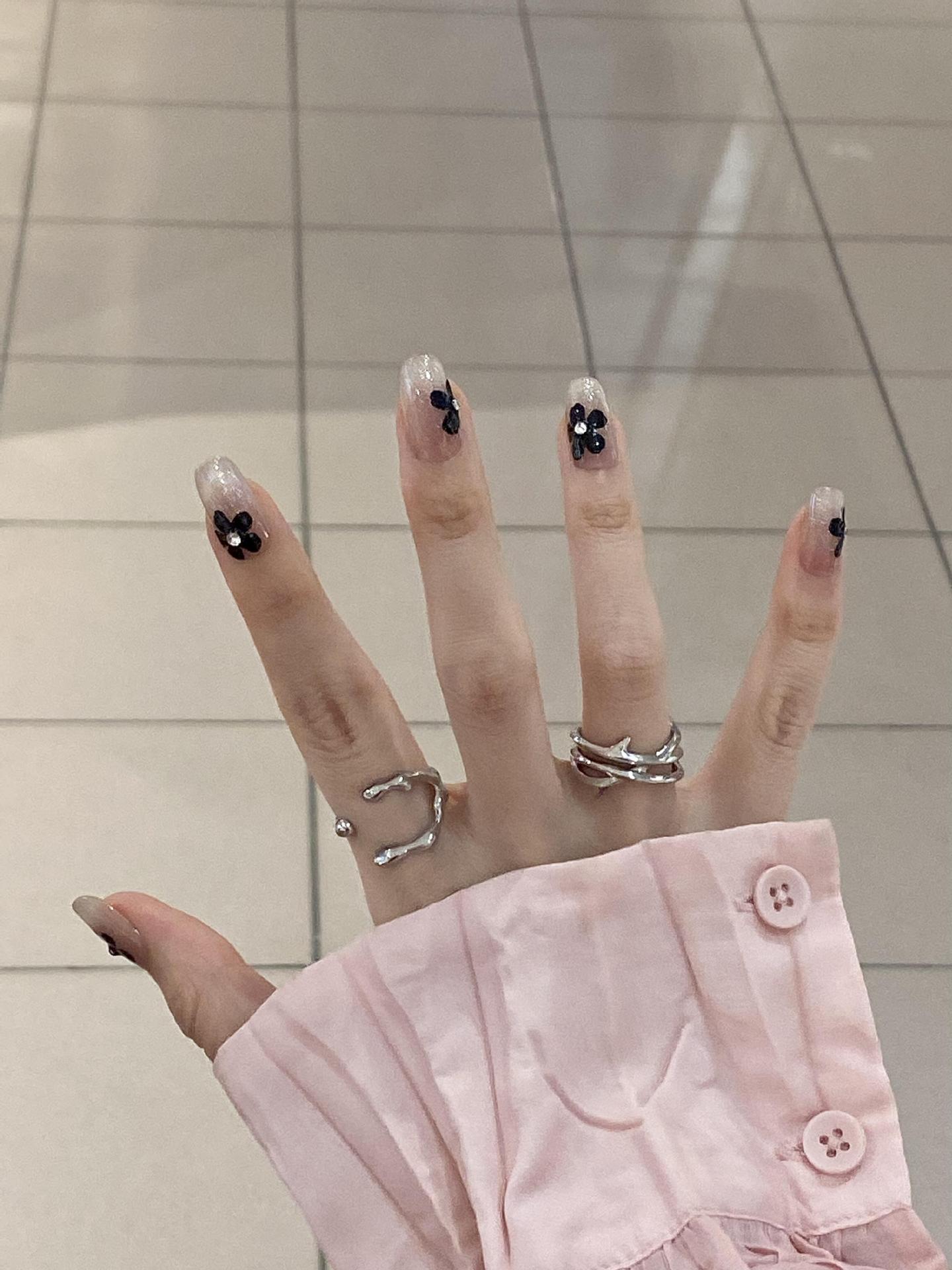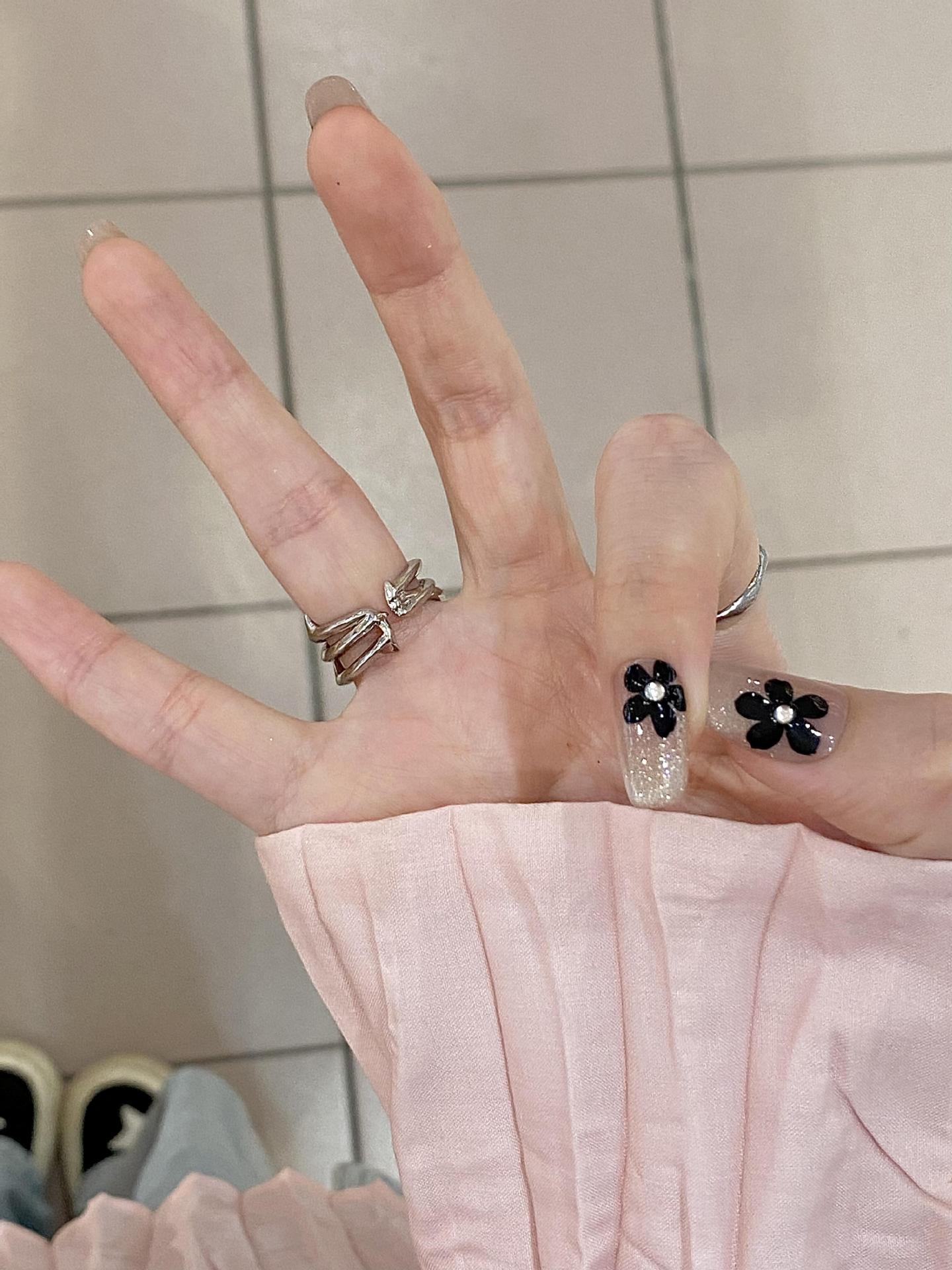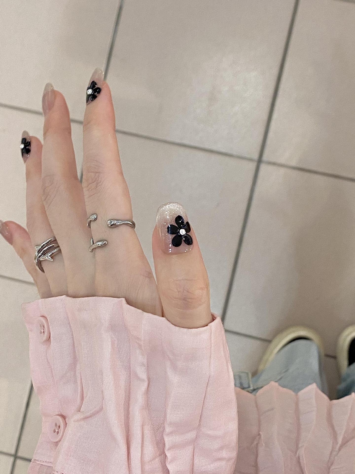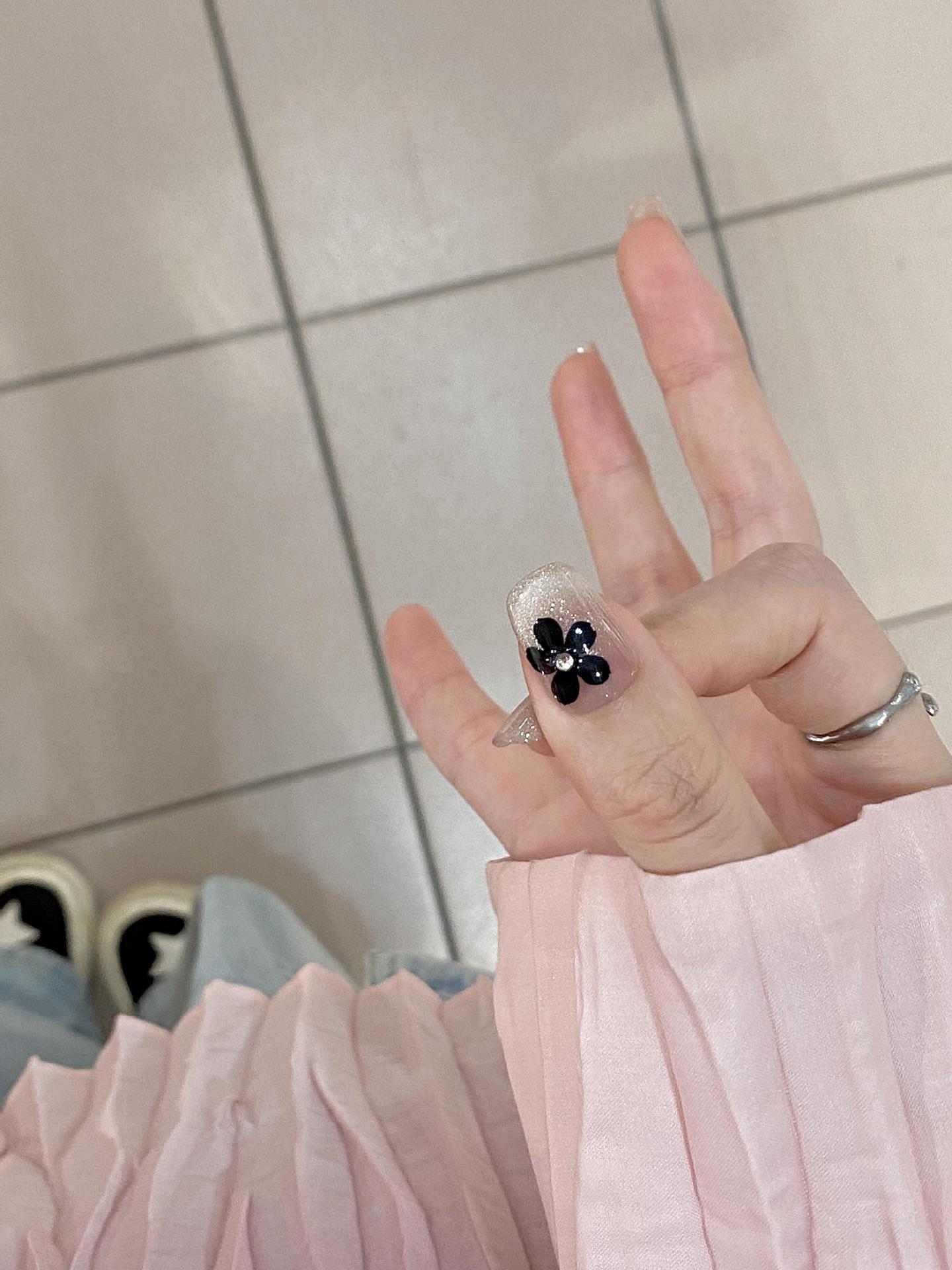 Producto terminado de uñas postizas con diseño de ojo de gato, flor pequeña pintada a mano, uñas blancas cortas, parche boutique de alta gama