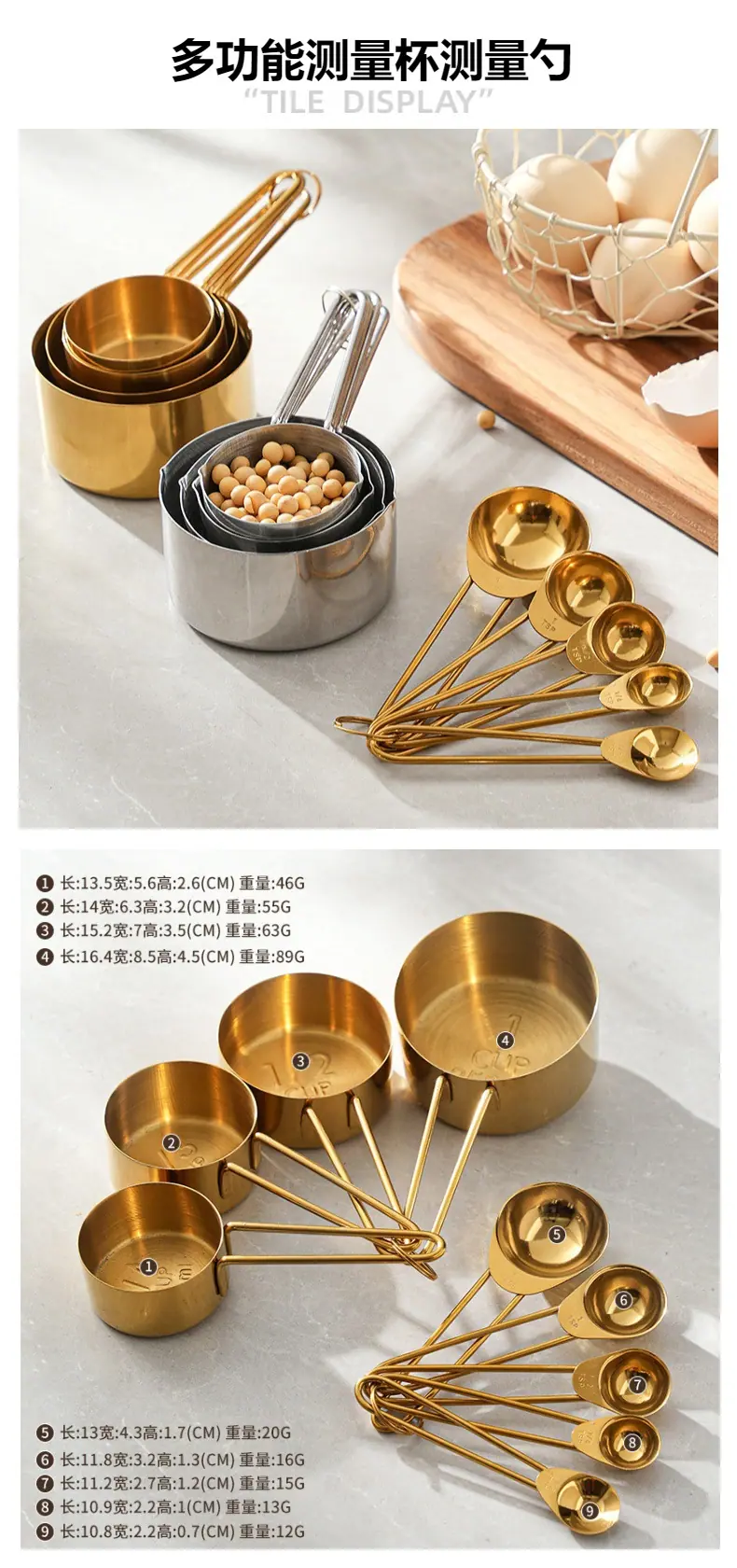 Gold thread handle measuring cup + measuring spoon 9-piece set [430 stainless steel], Gold thread handle measu...